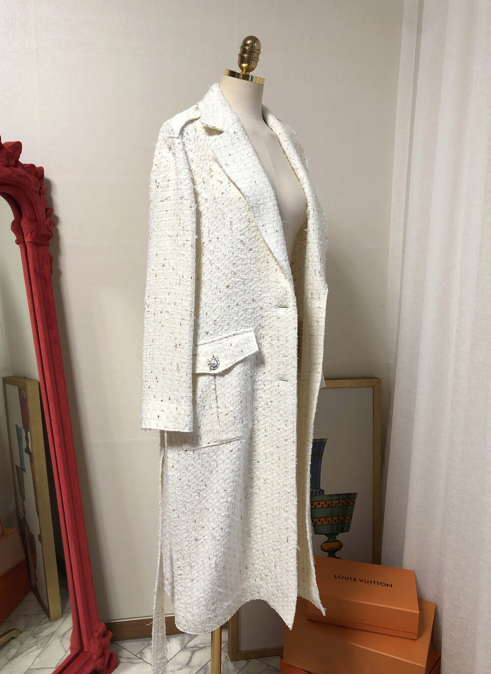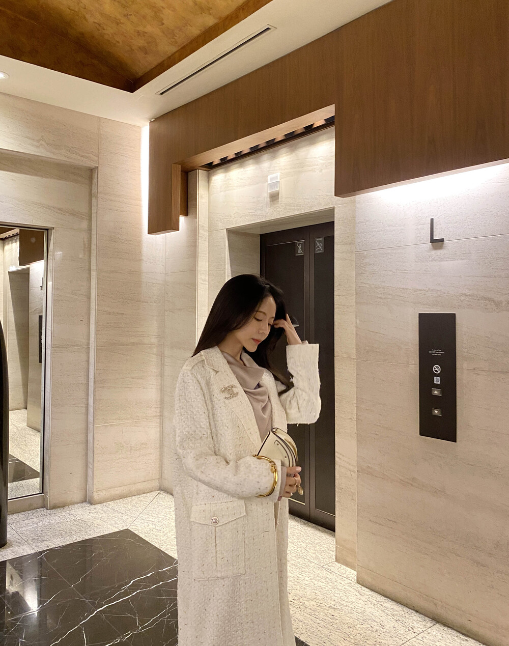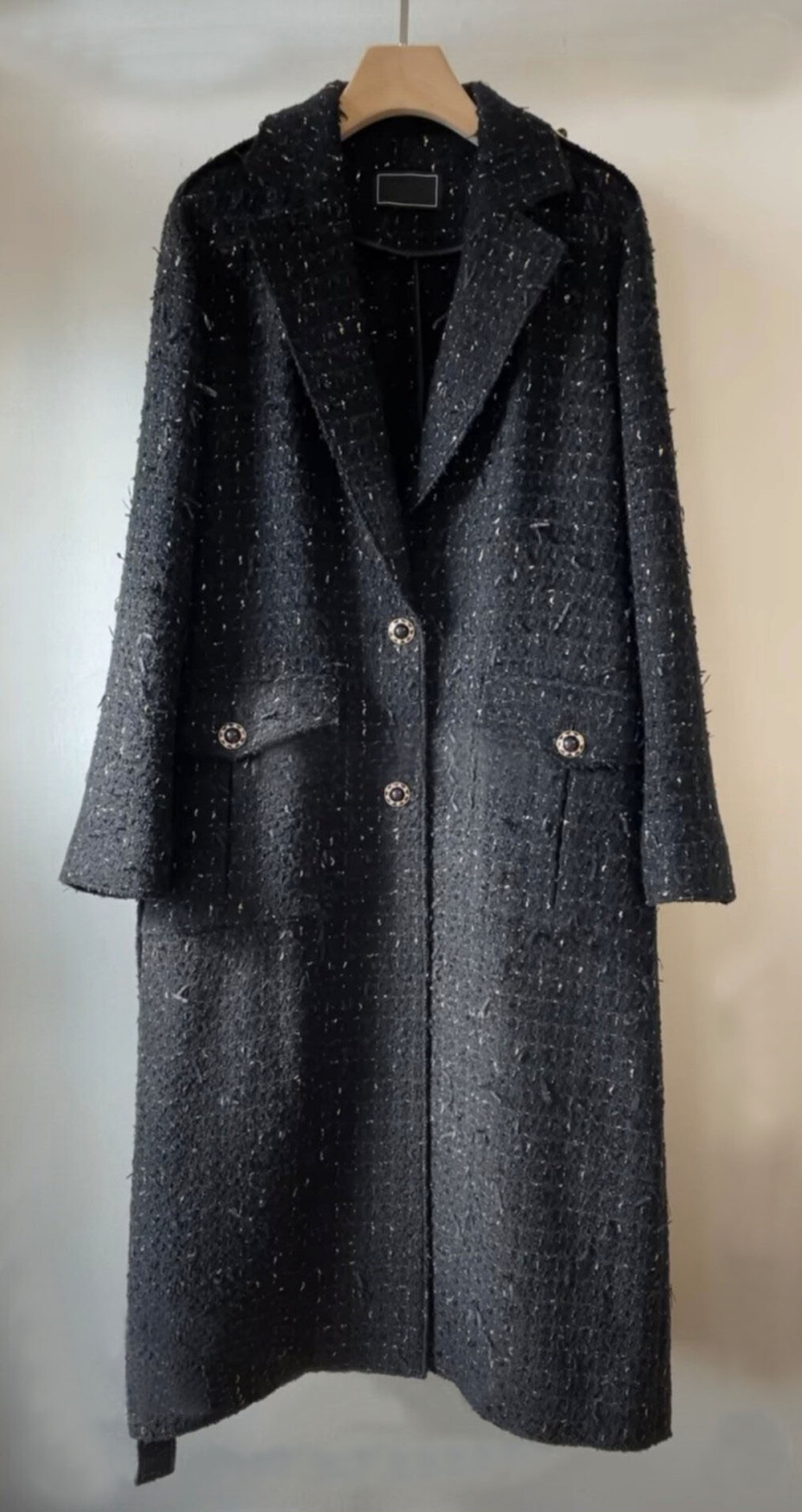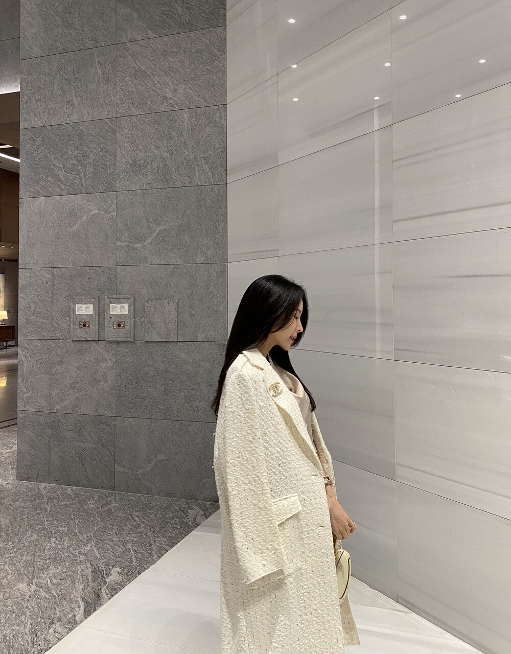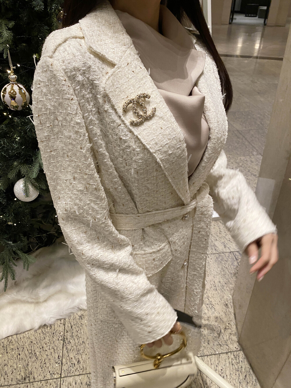 클래식하고 우아한 실루엣이 돋보이는 롱기장의 트위드 코트입니다