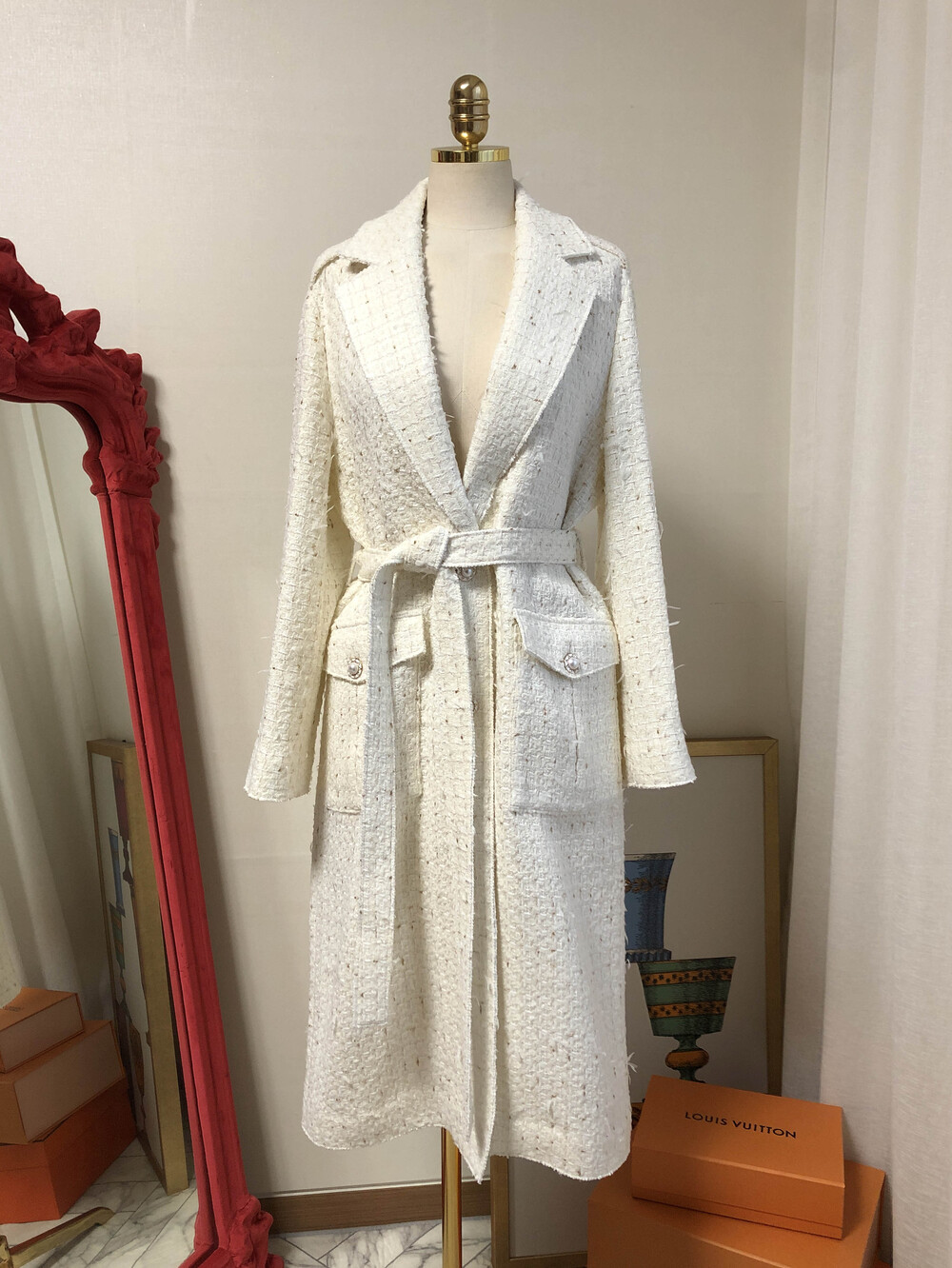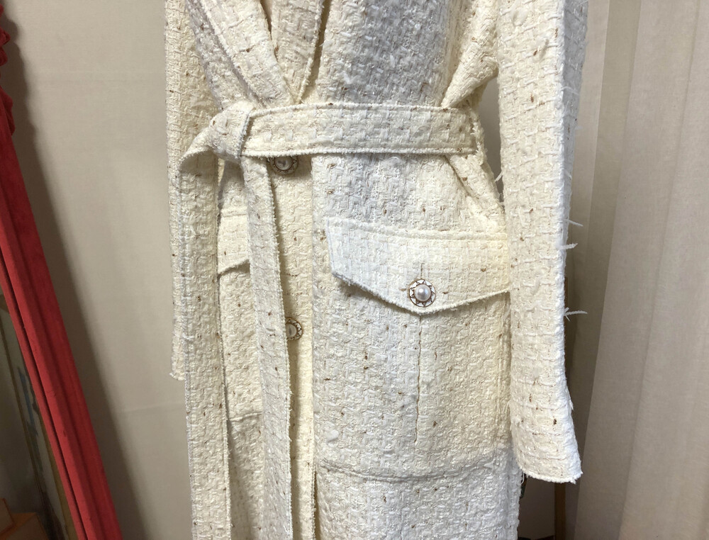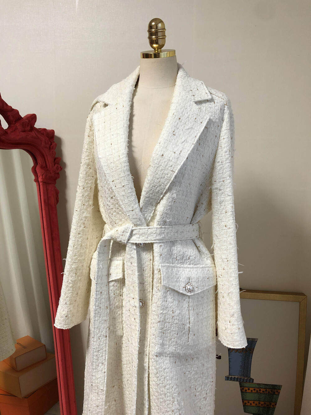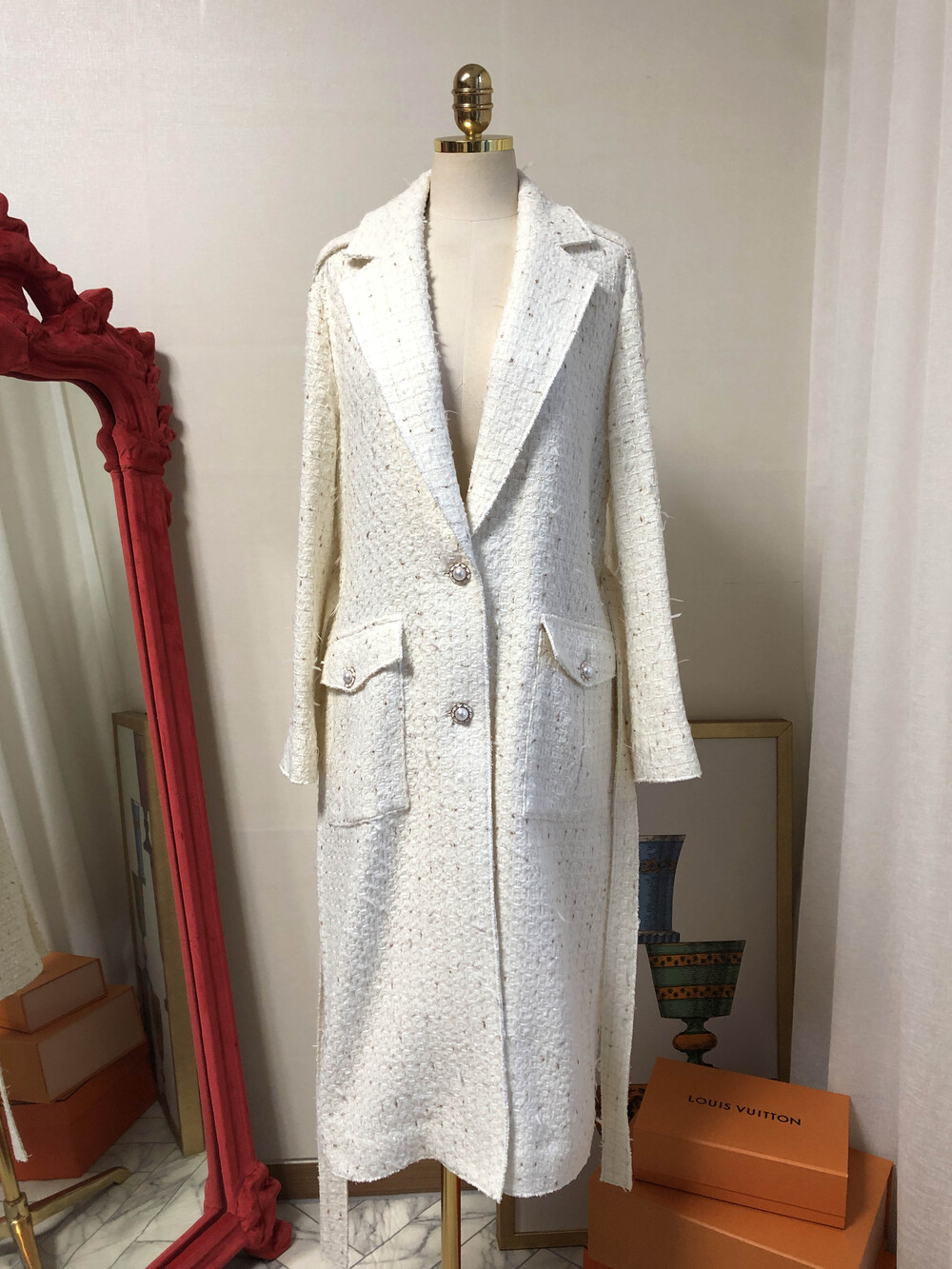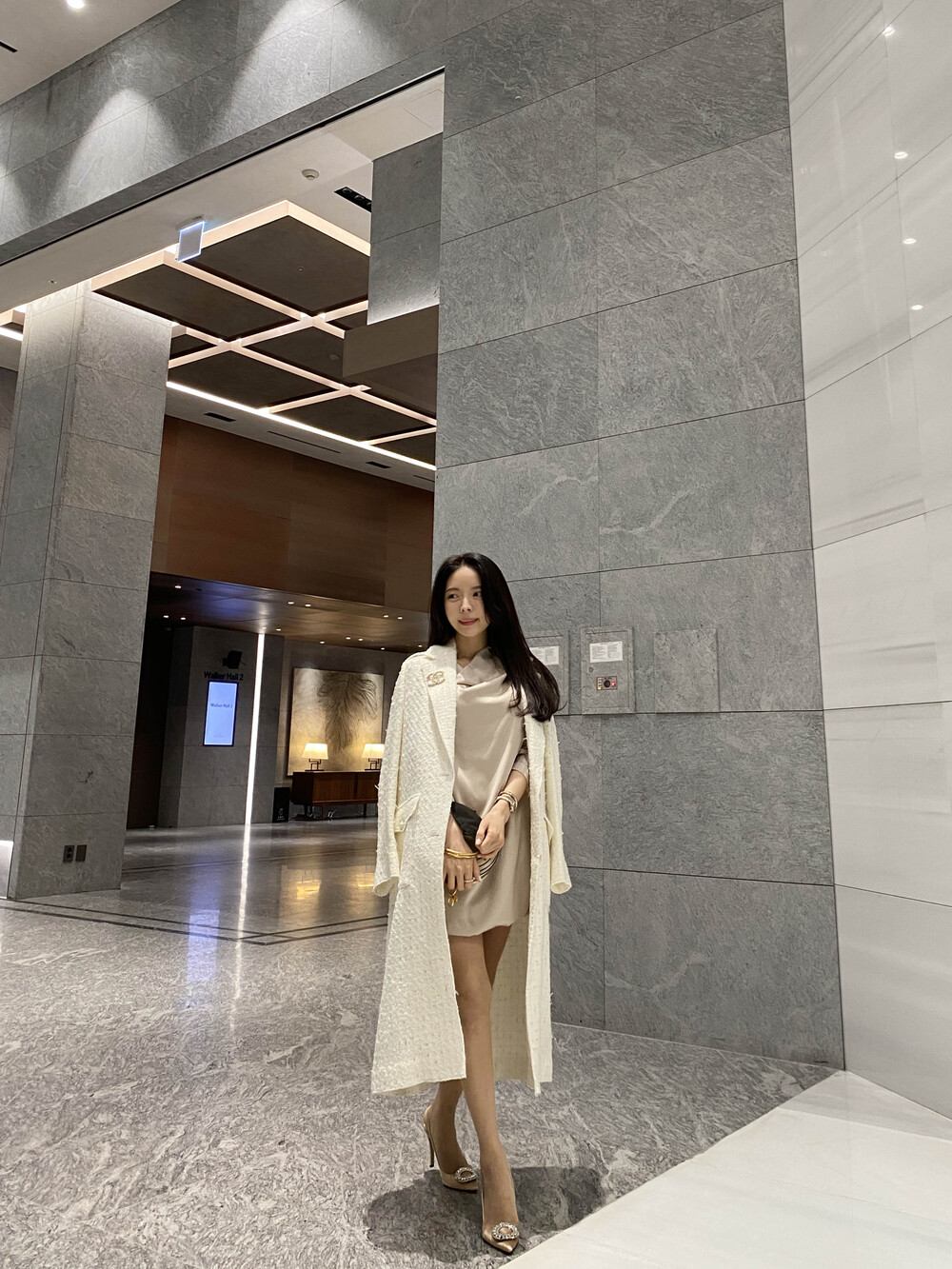 클래식하고 우아한 실루엣이 돋보이는 롱기장의 트위드 코트입니다