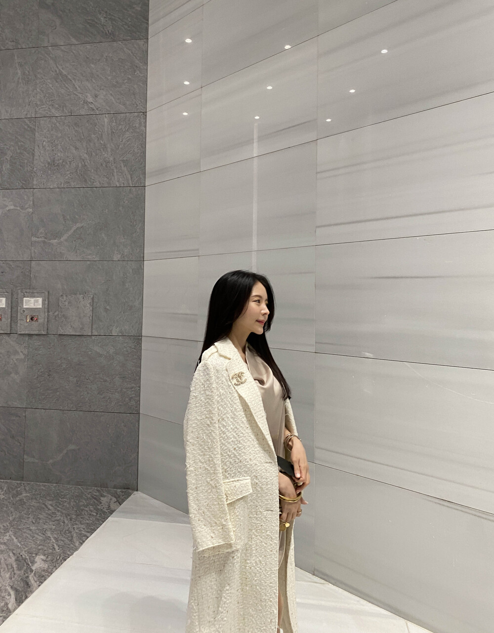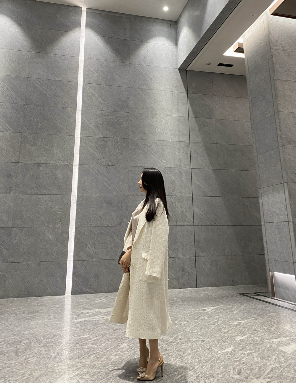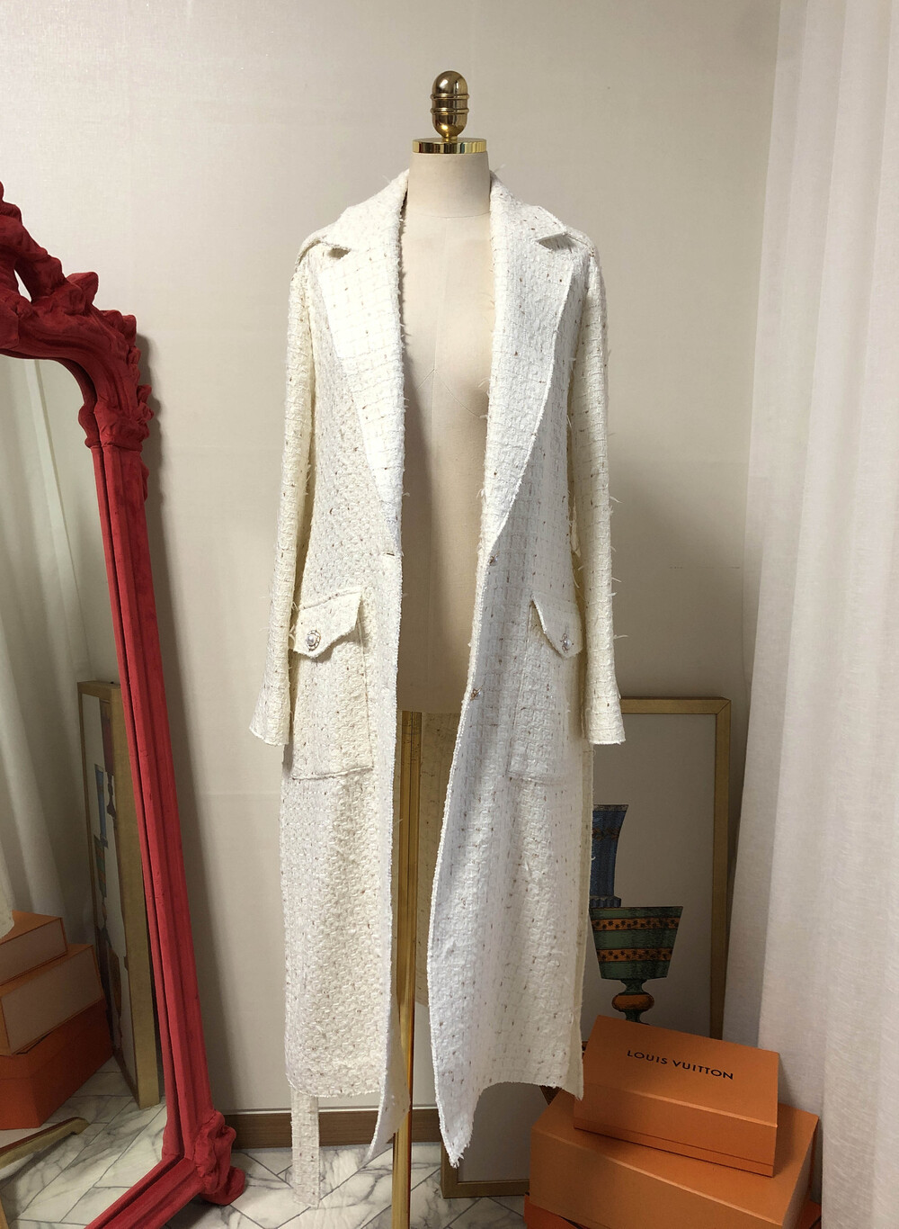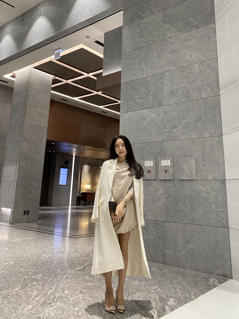 클래식하고 우아한 실루엣이 돋보이는 롱기장의 트위드 코트입니다