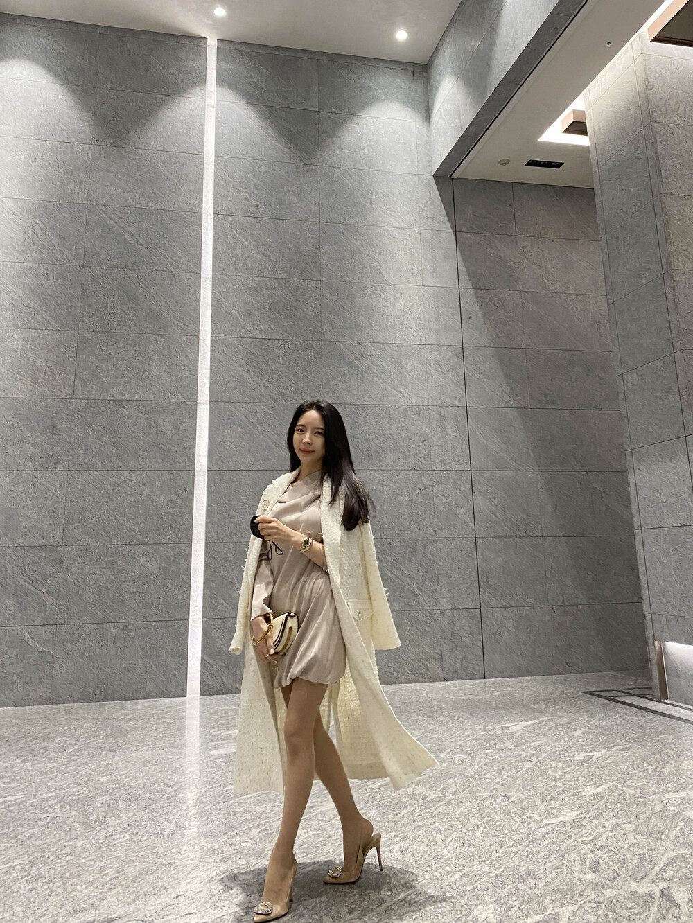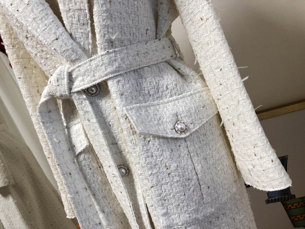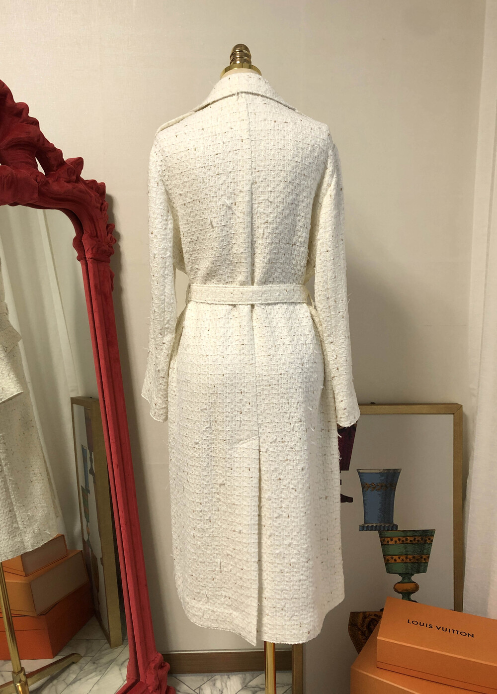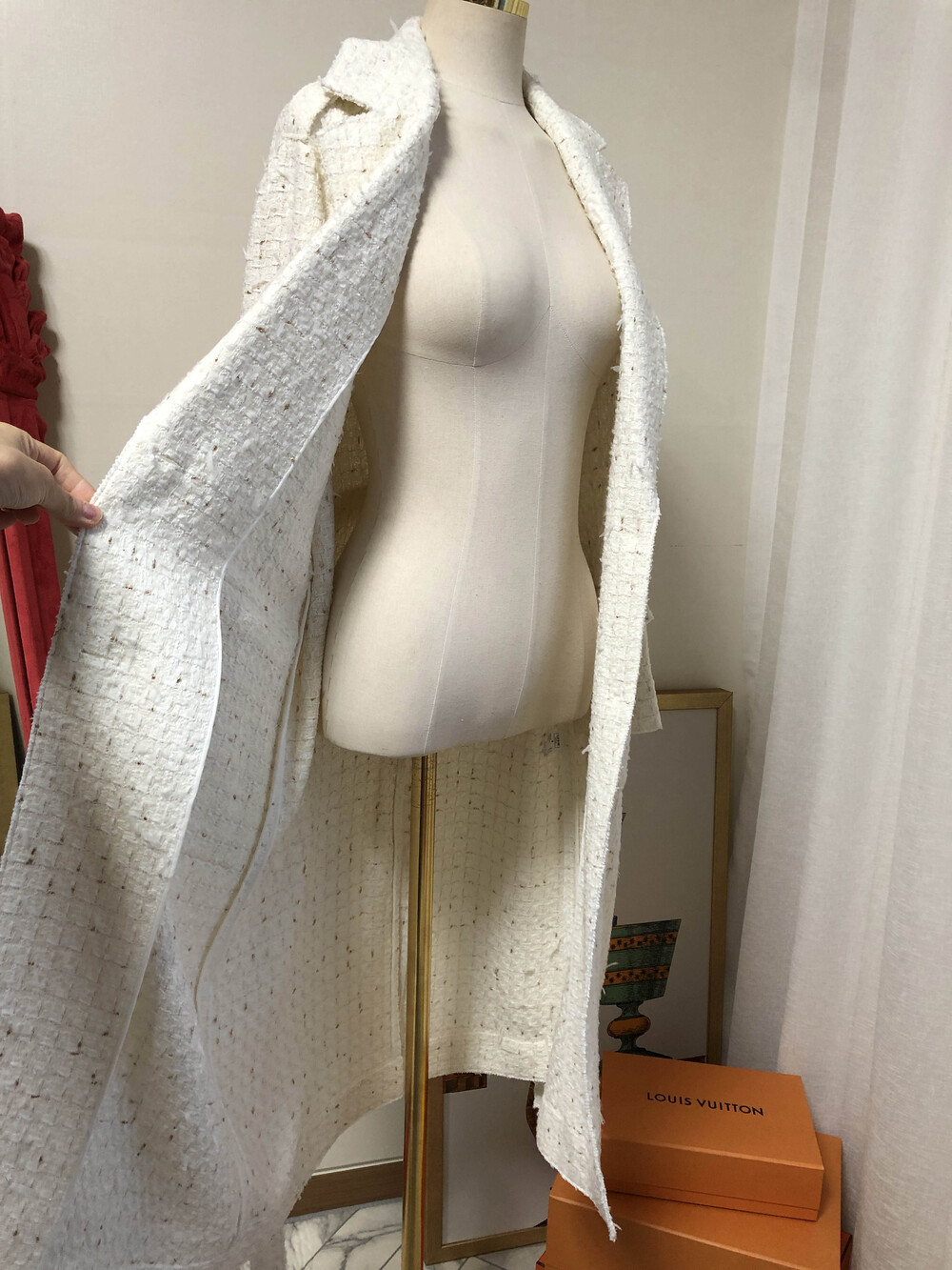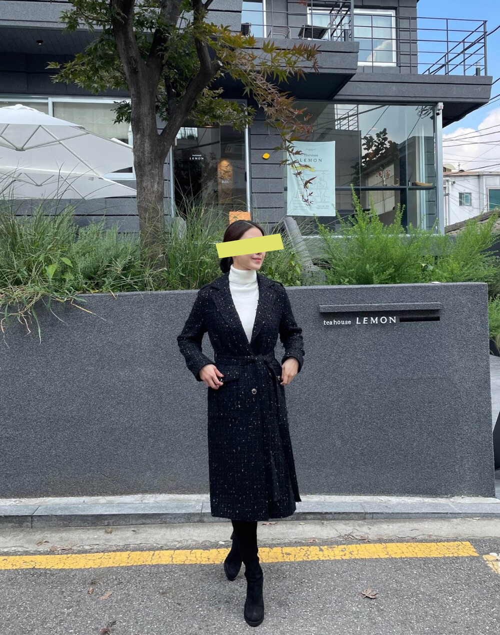 클래식하고 우아한 실루엣이 돋보이는 롱기장의 트위드 코트입니다