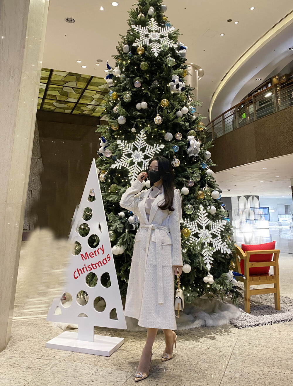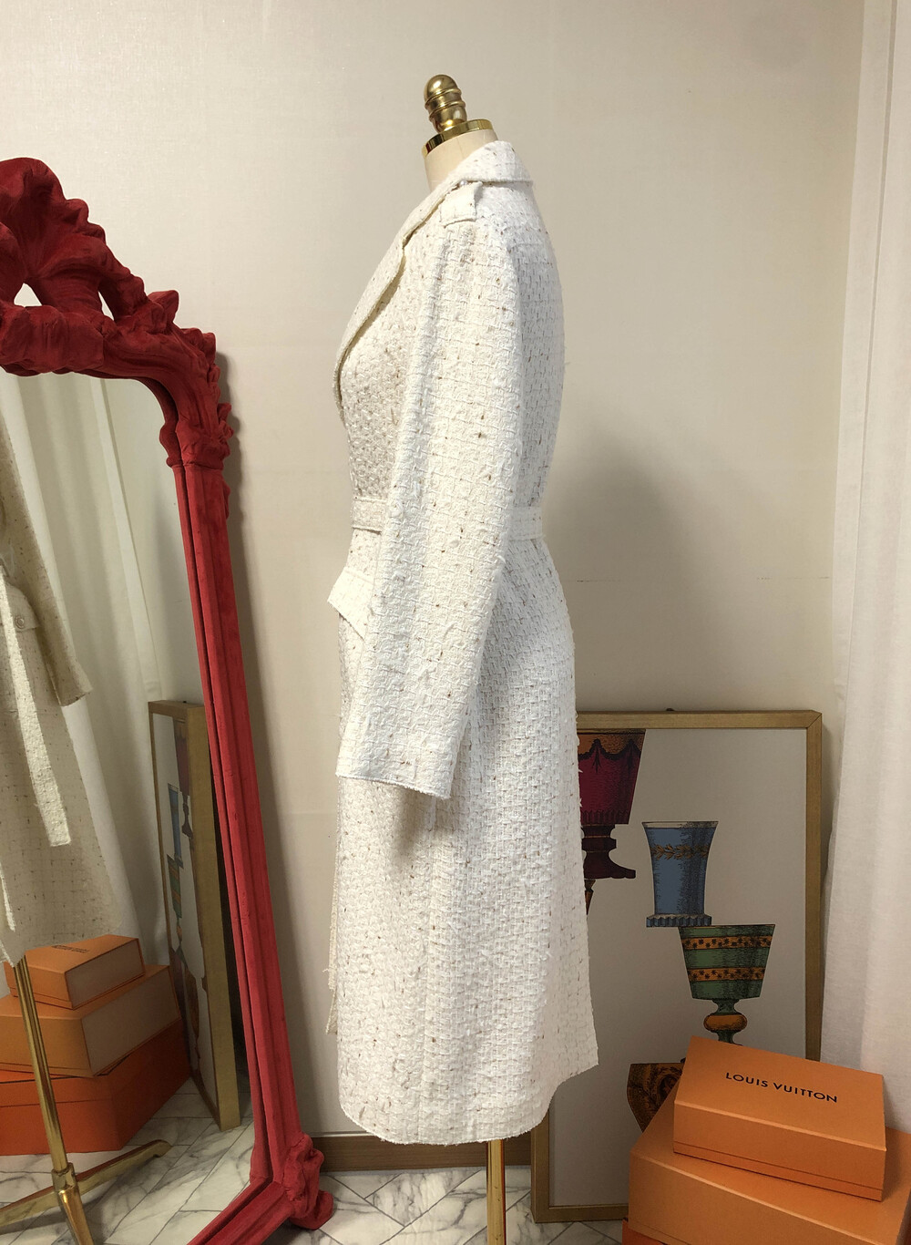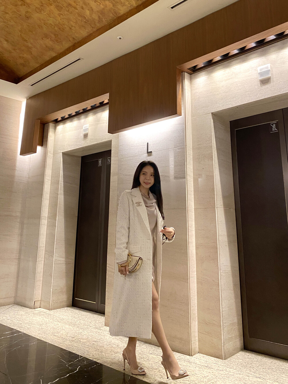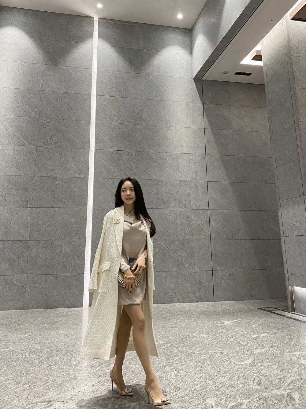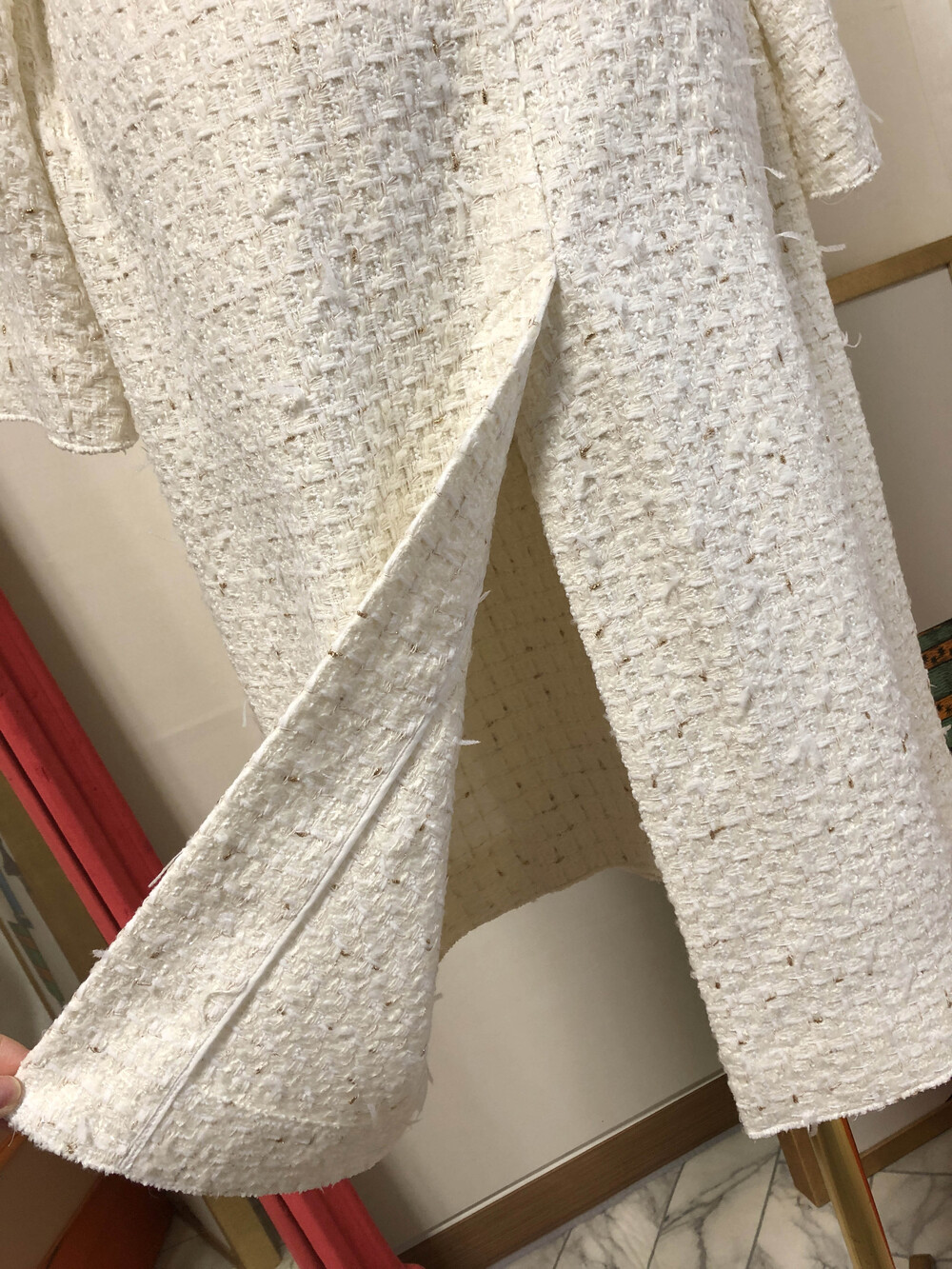 클래식하고 우아한 실루엣이 돋보이는 롱기장의 트위드 코트입니다