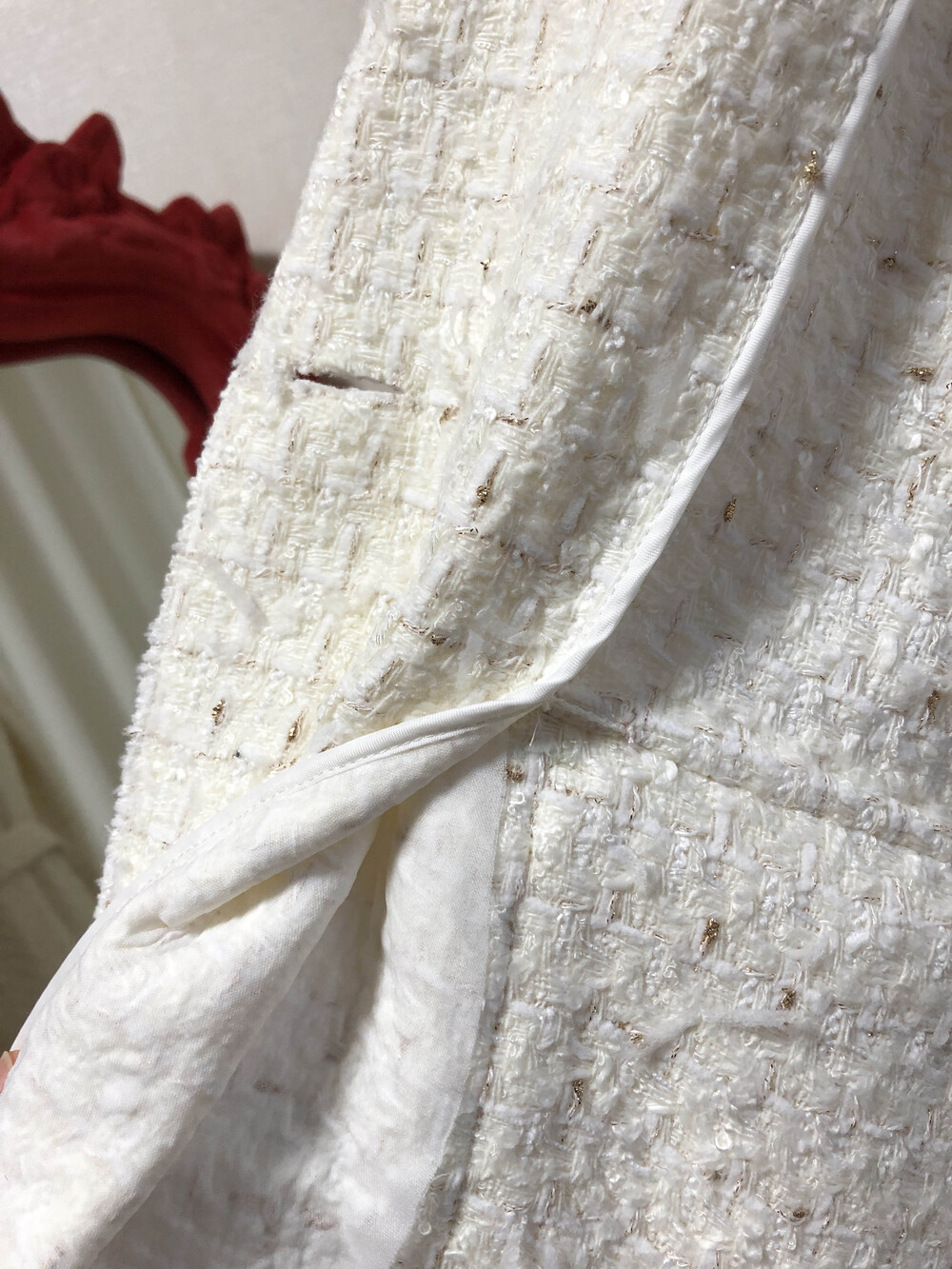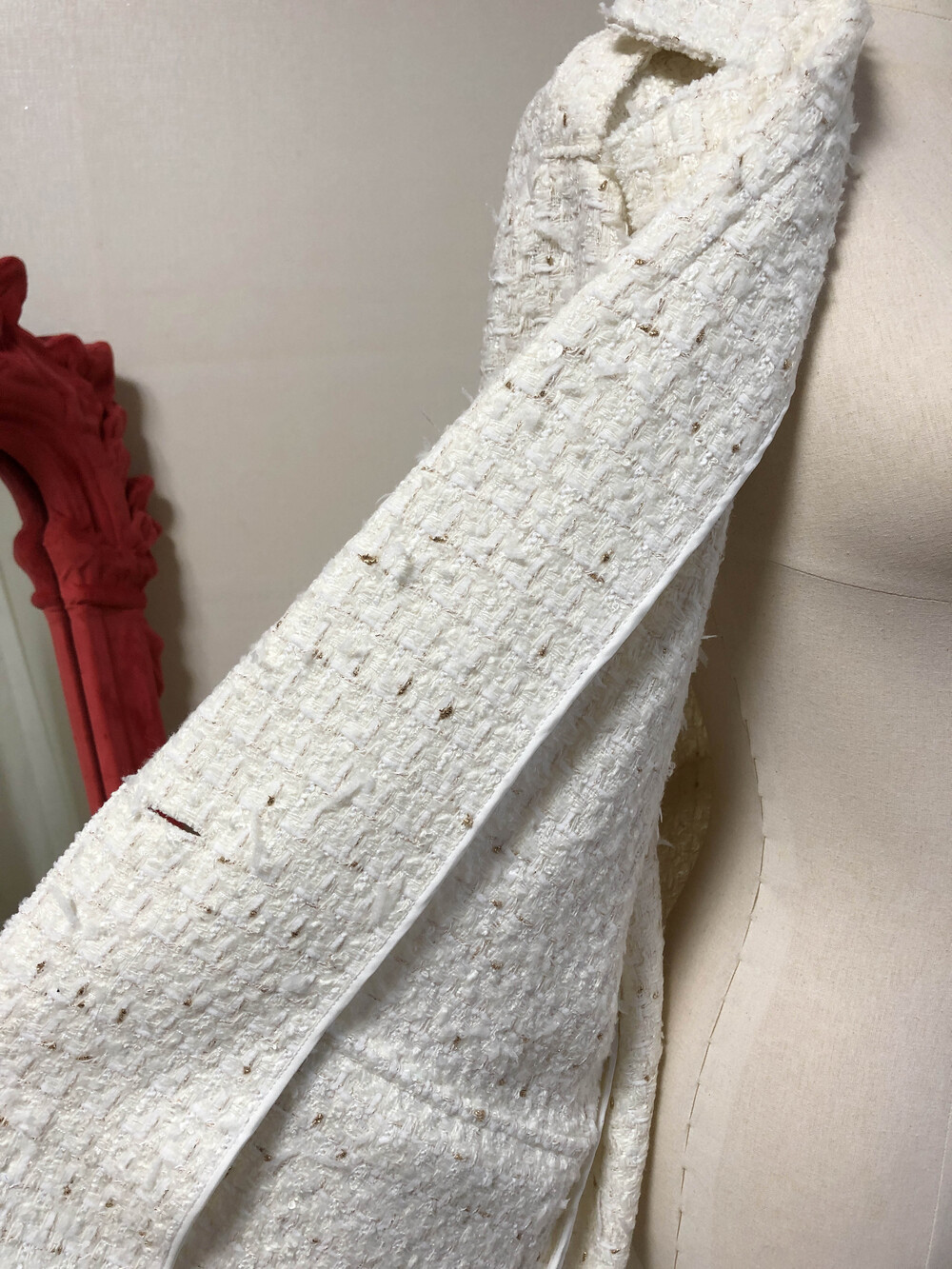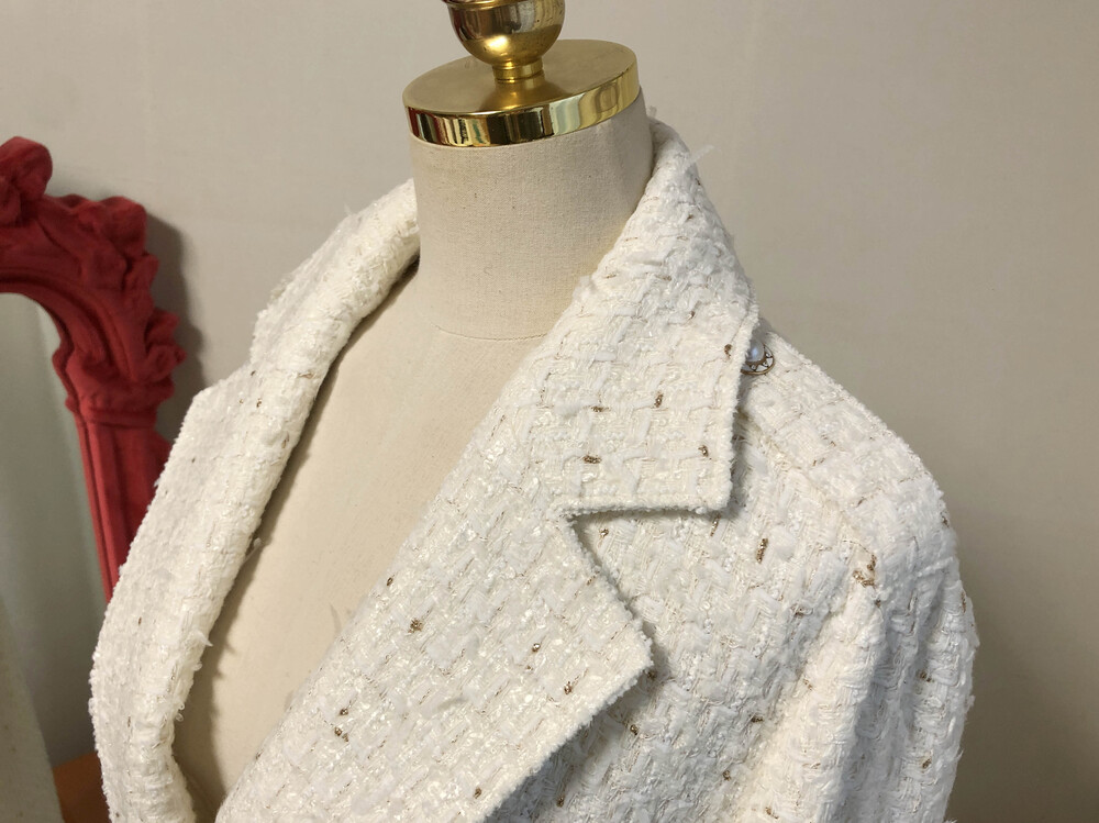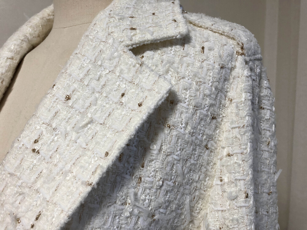 고급 울 트위드와 은은하게 빛나는 메탈 원사가 믹스된 고급스럽고 차분한 매력의 트위드 원단으로