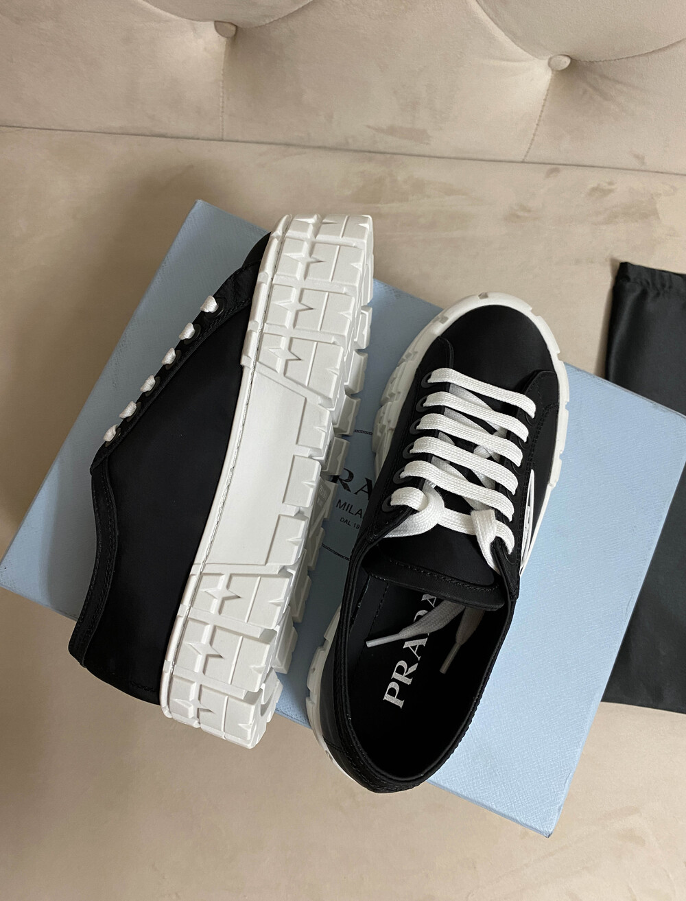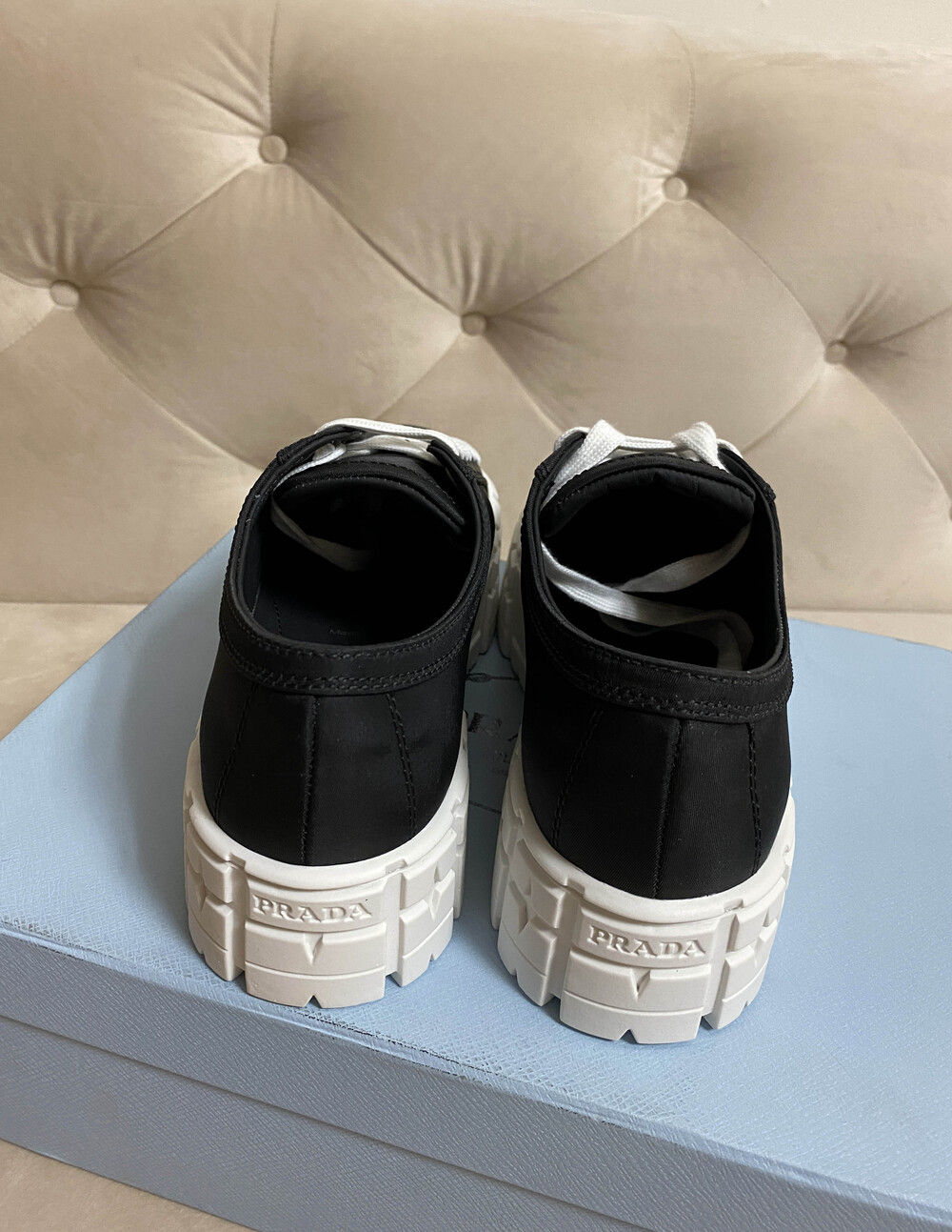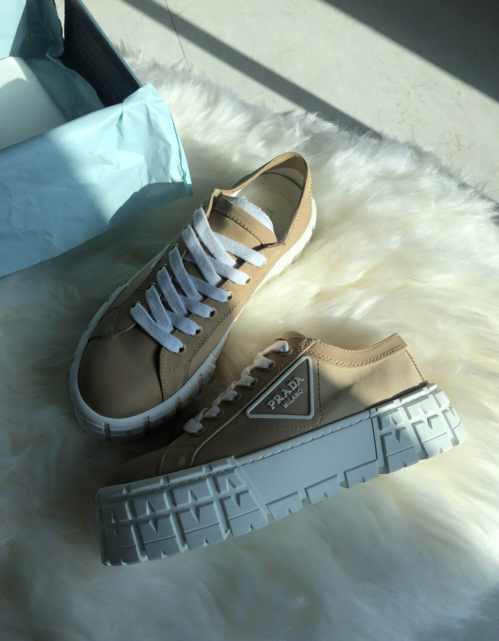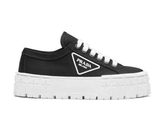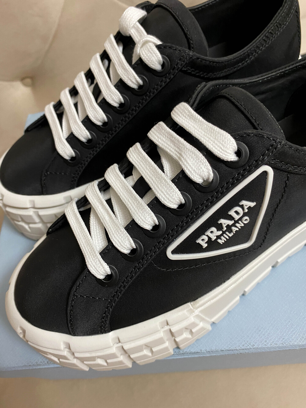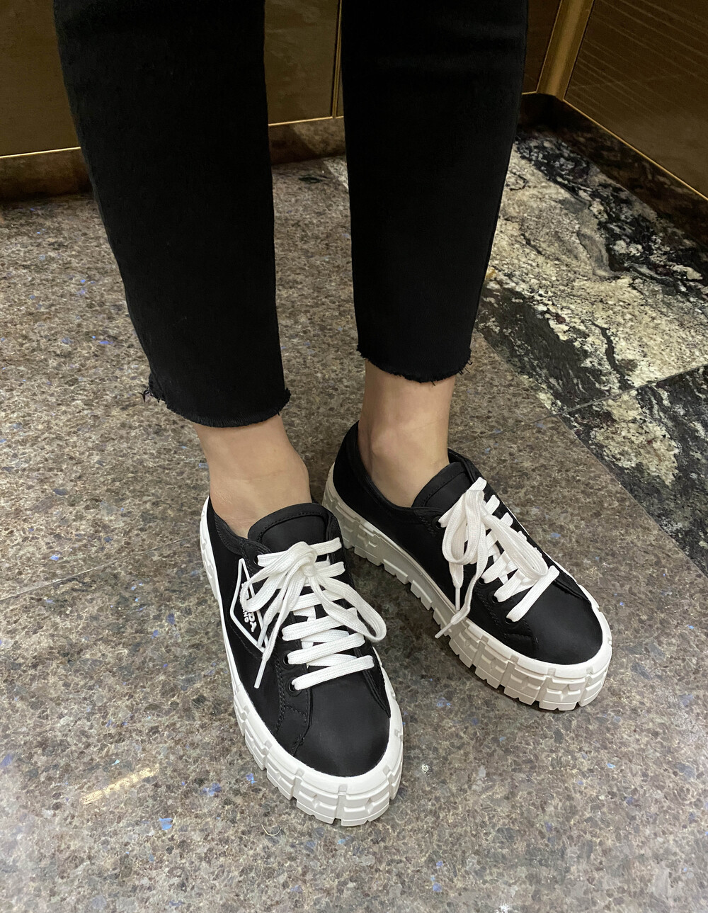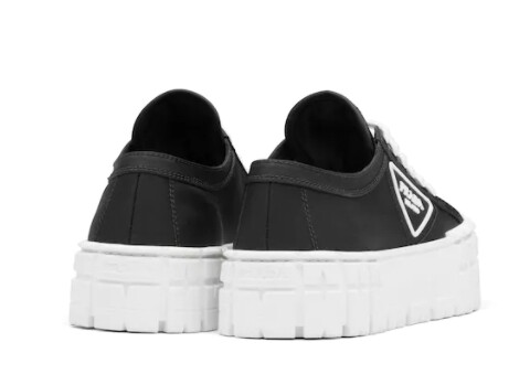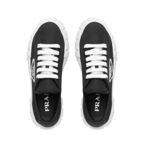 독특한 디자인을 연출한 나일론 개버딘 스니커즈로 측면에 로고 트라이앵글이 포인트입니다