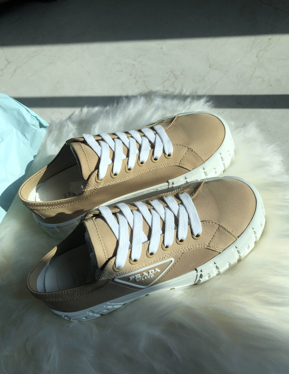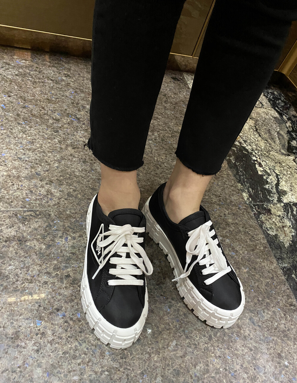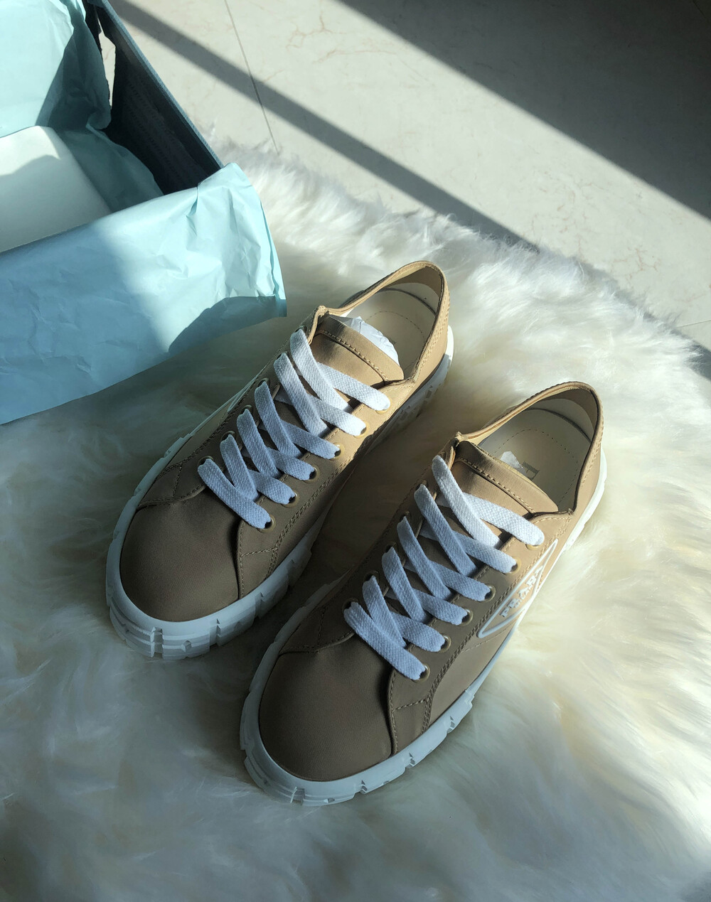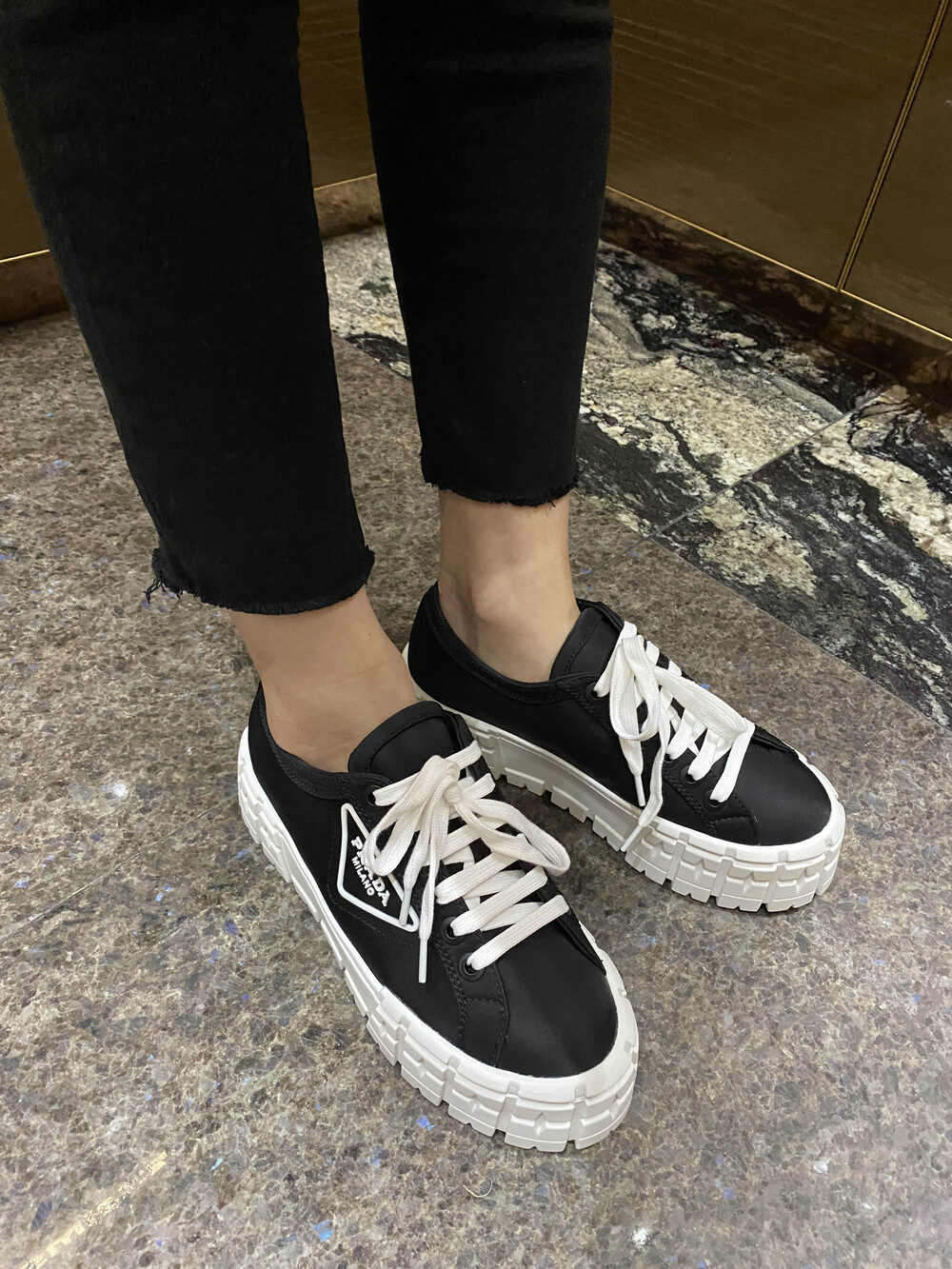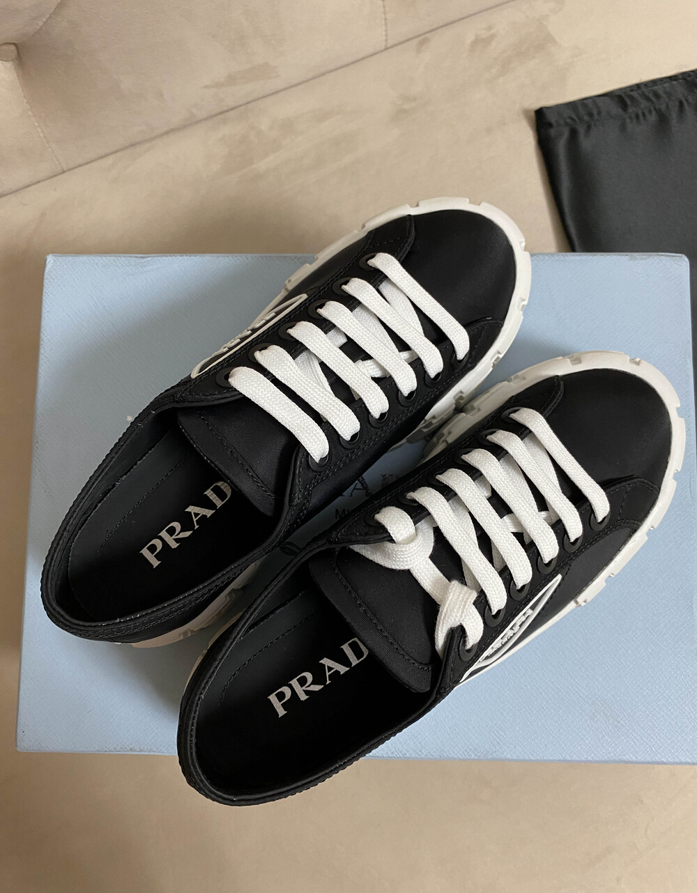 독특한 디자인을 연출한 나일론 개버딘 스니커즈로 측면에 로고 트라이앵글이 포인트입니다