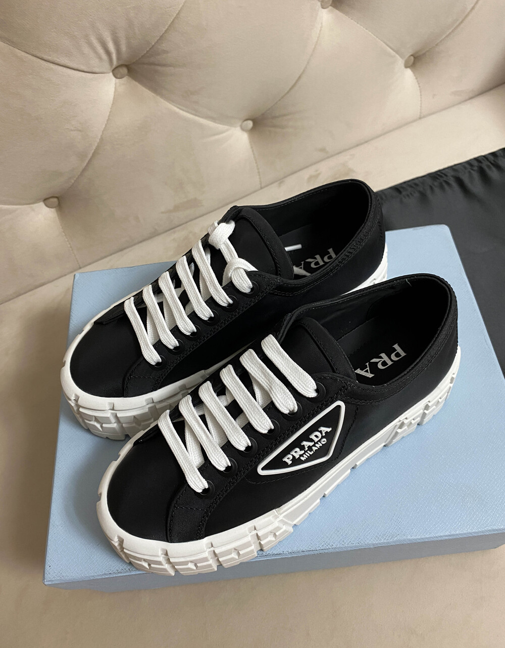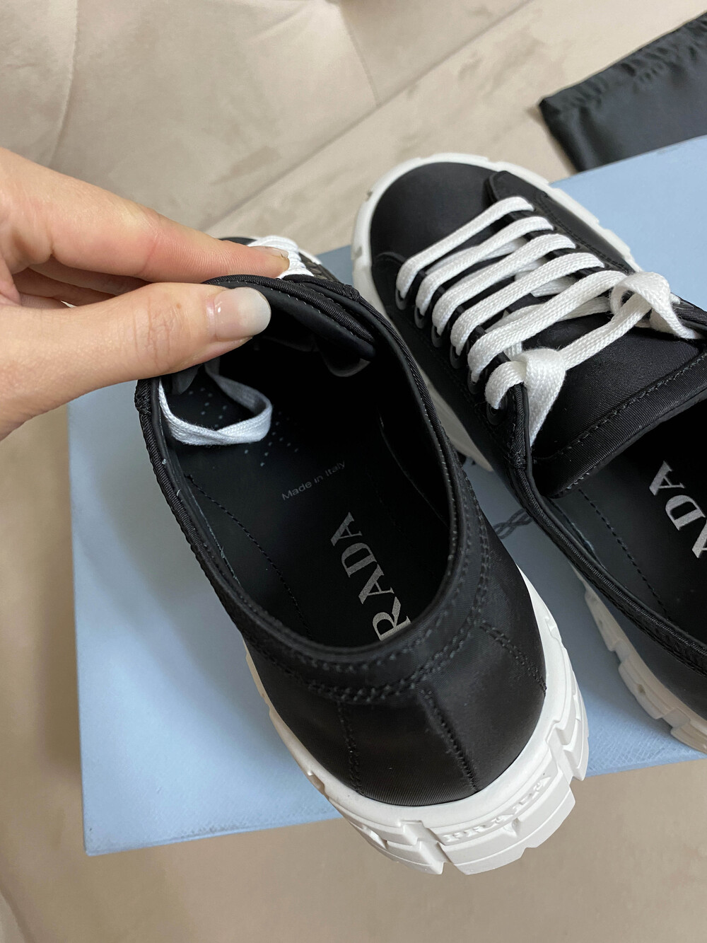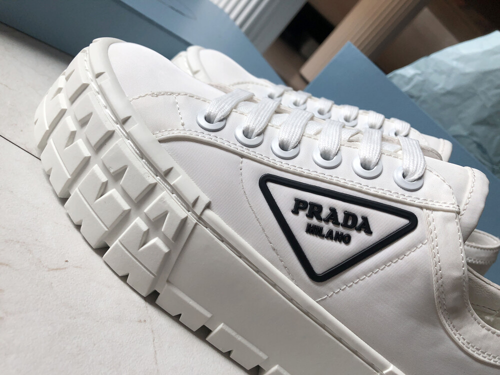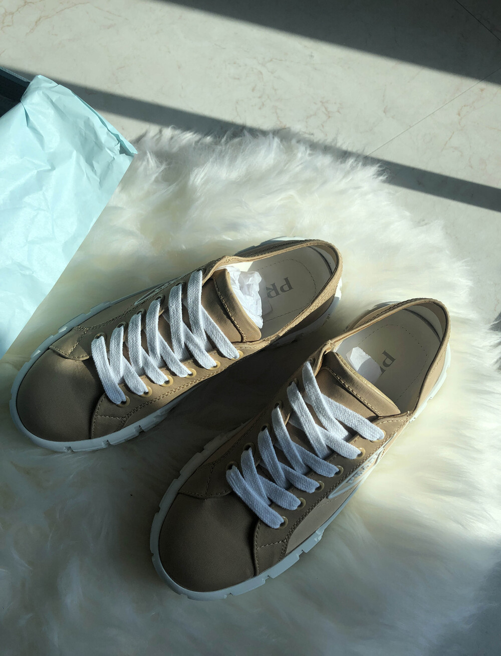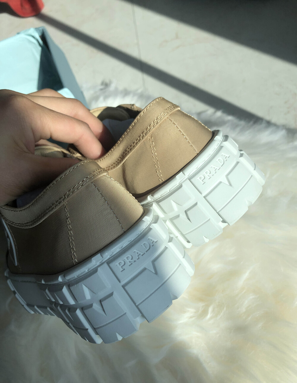 독특한 디자인을 연출한 나일론 개버딘 스니커즈로 측면에 로고 트라이앵글이 포인트입니다