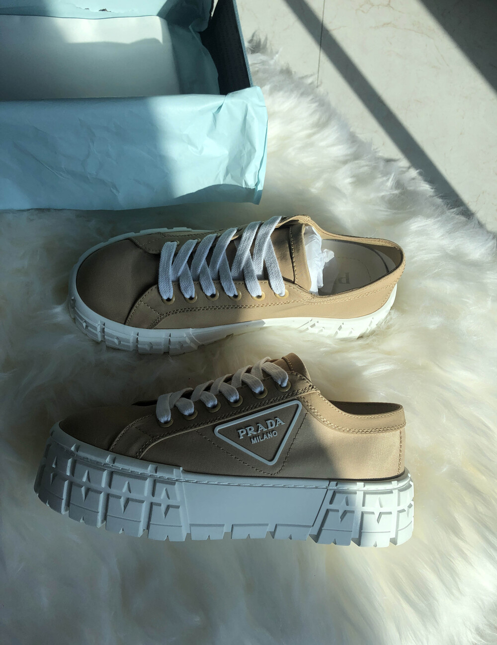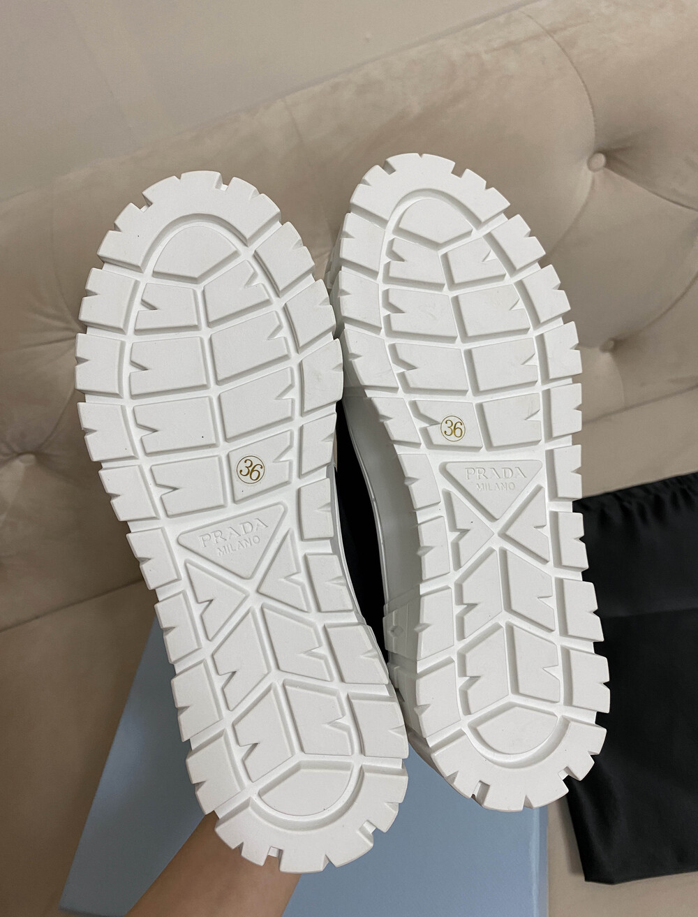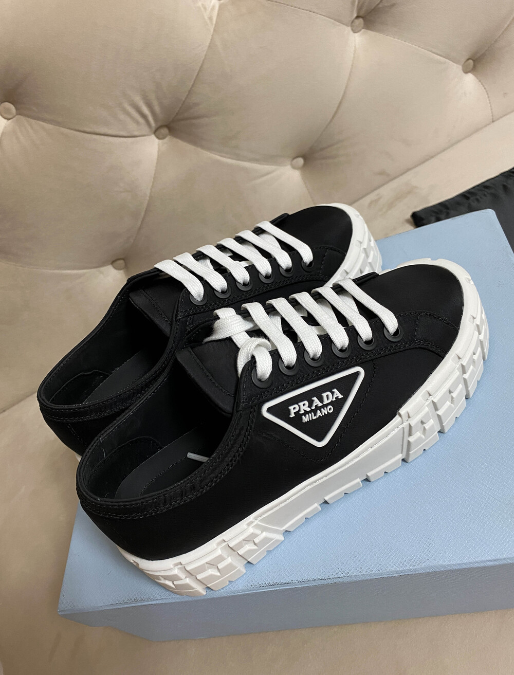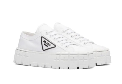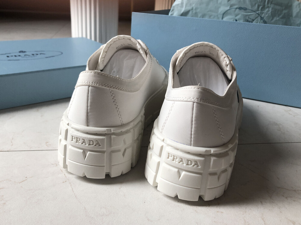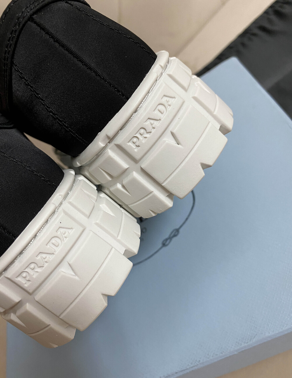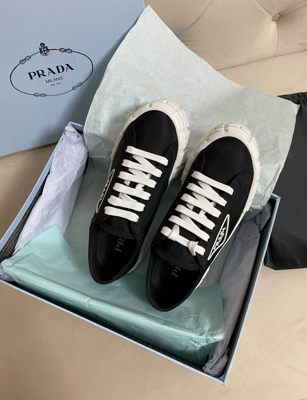 독특한 디자인을 연출한 나일론 개버딘 스니커즈로 측면에 로고 트라이앵글이 포인트입니다