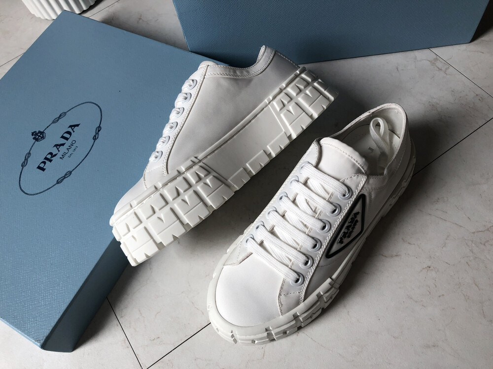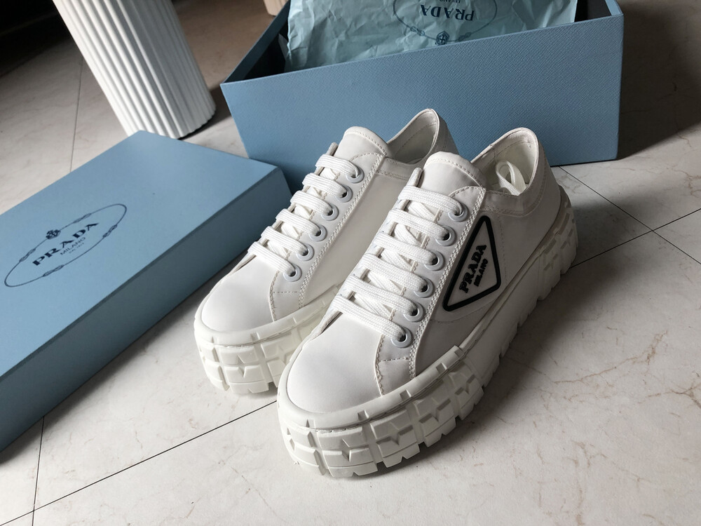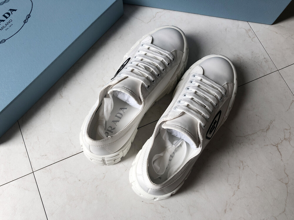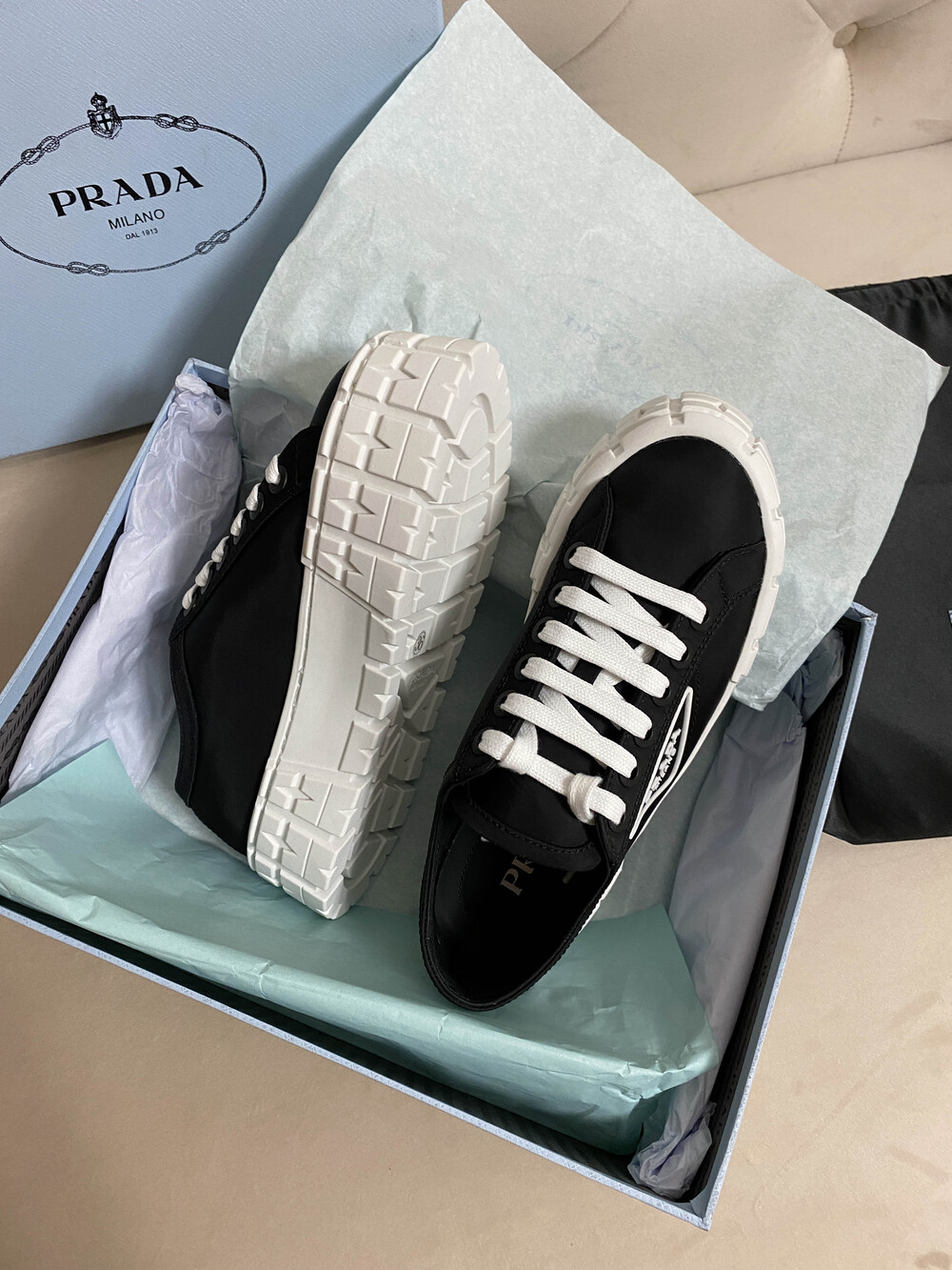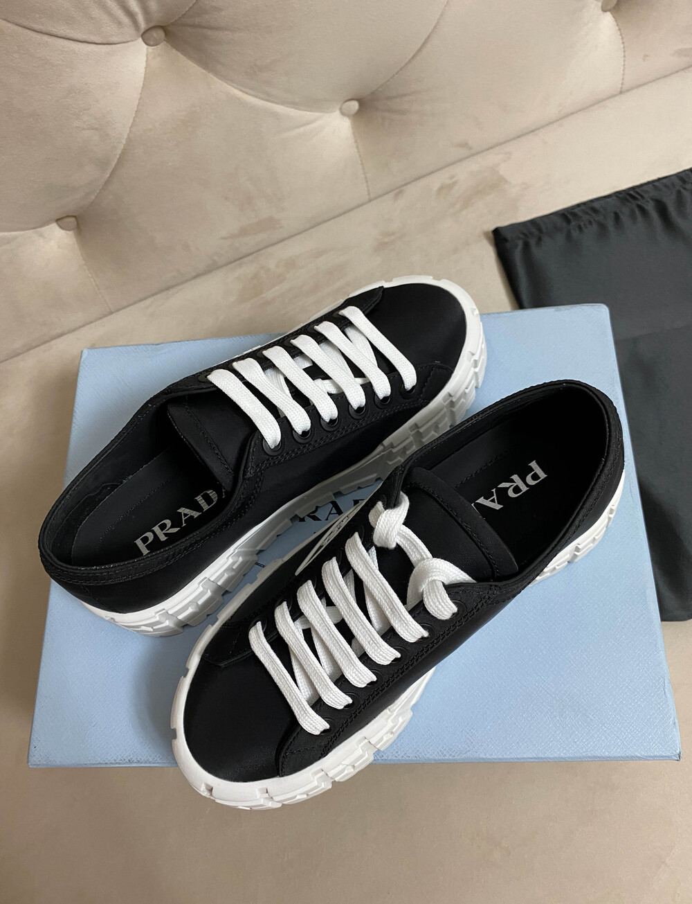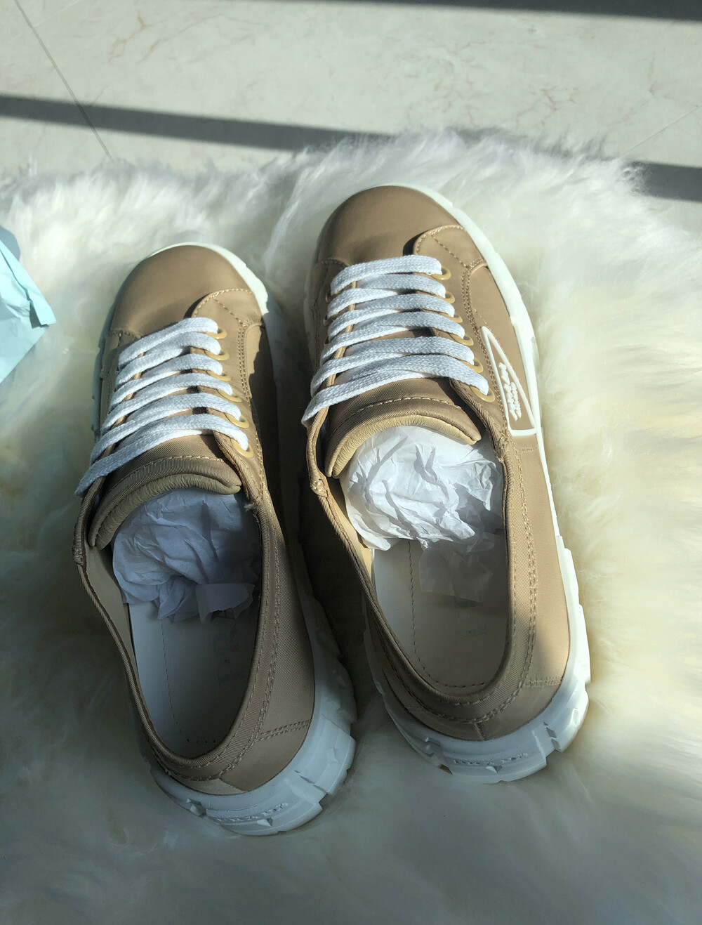 독특한 디자인을 연출한 나일론 개버딘 스니커즈로 측면에 로고 트라이앵글이 포인트입니다