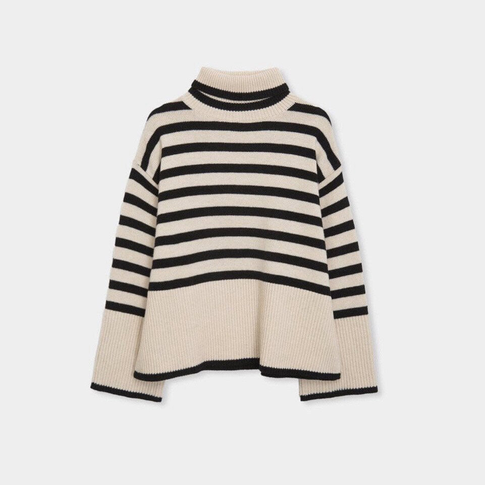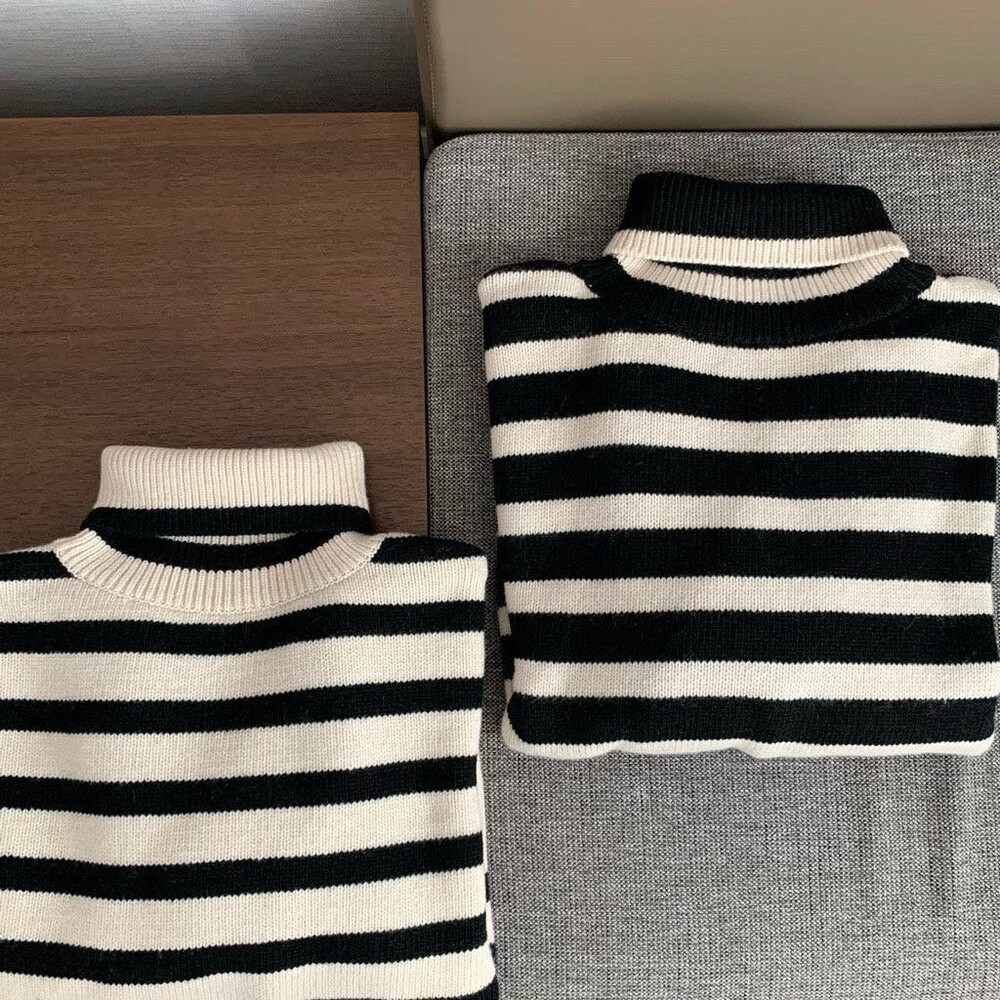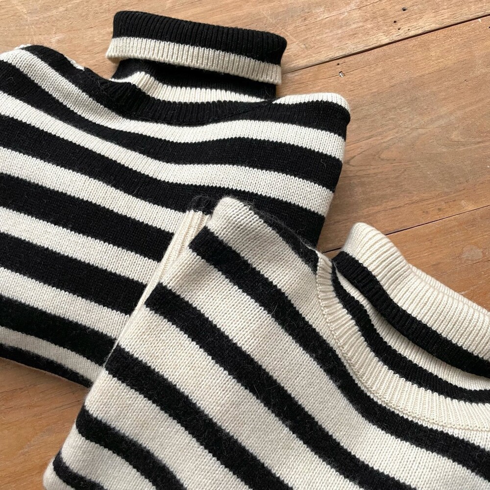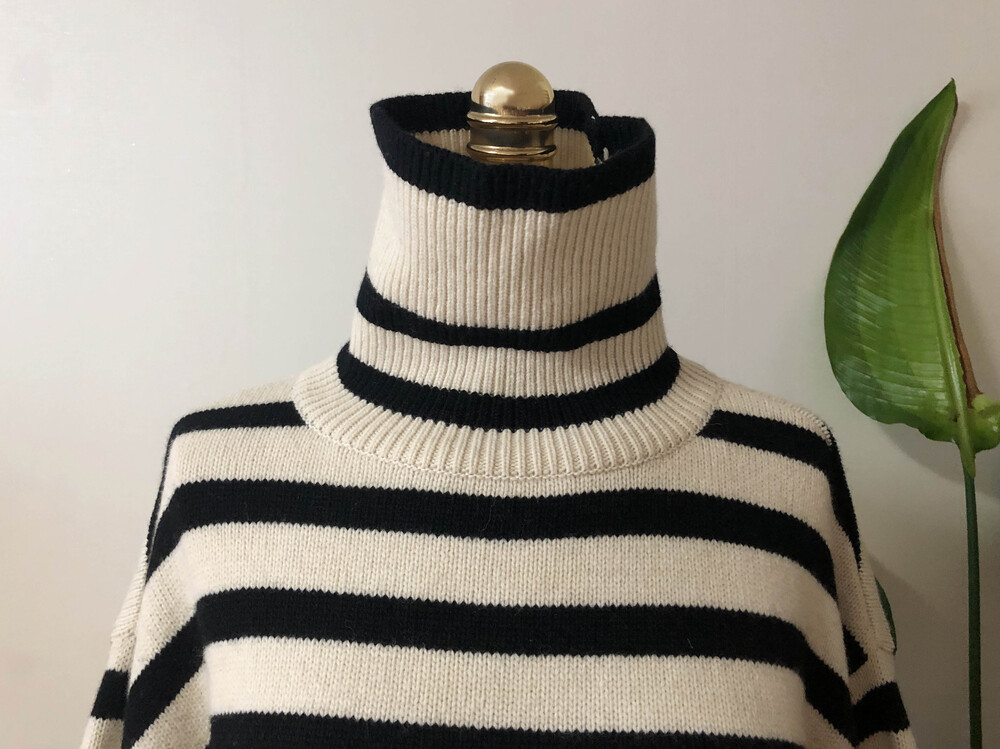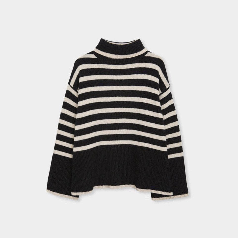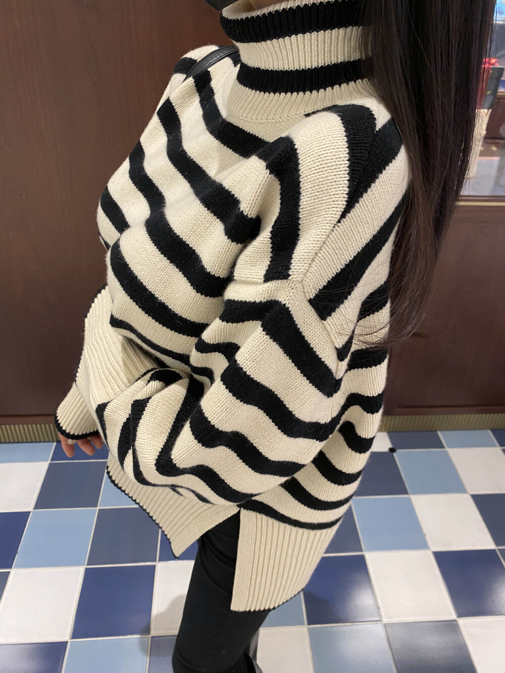 무심한듯 시크한 무드가 느껴지는 스트라이프 터틀넥니트입니다