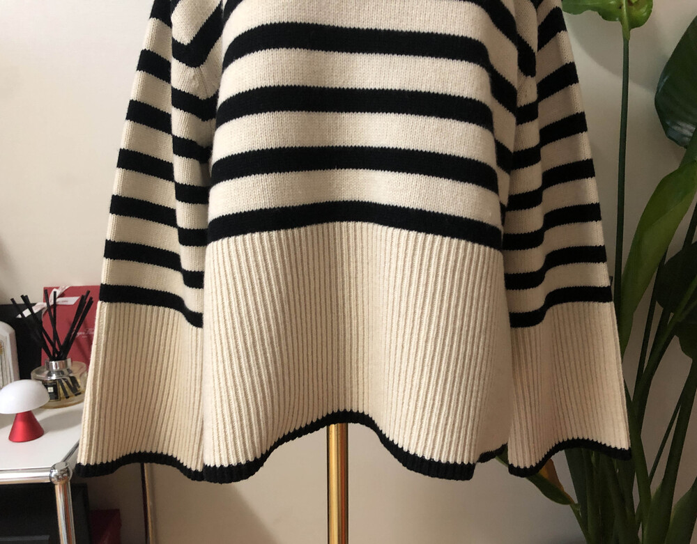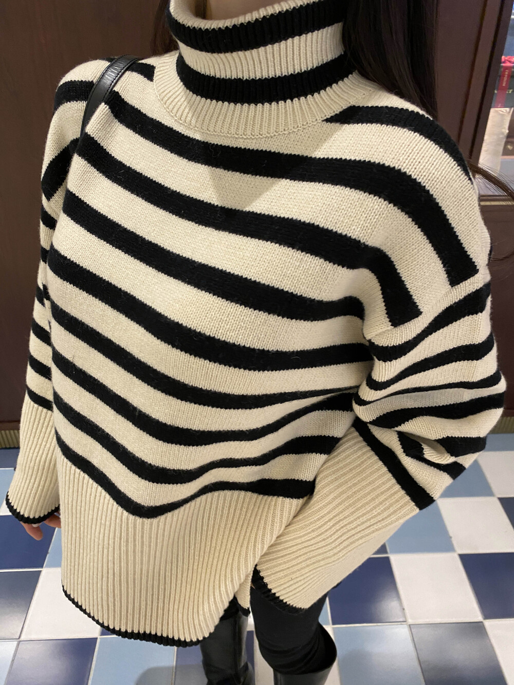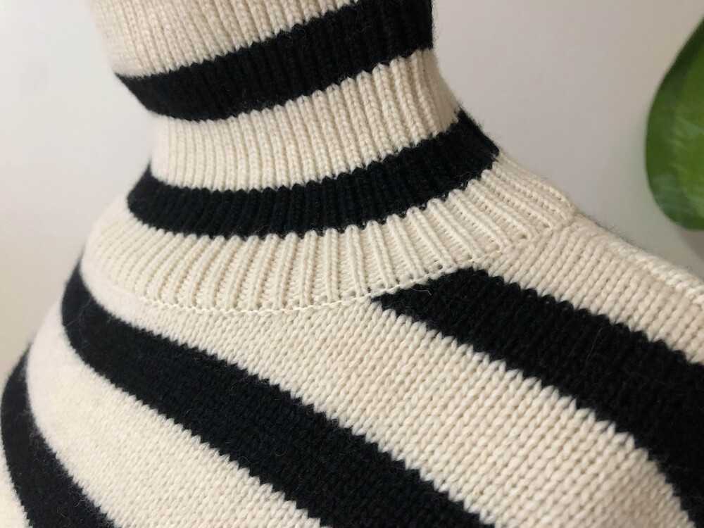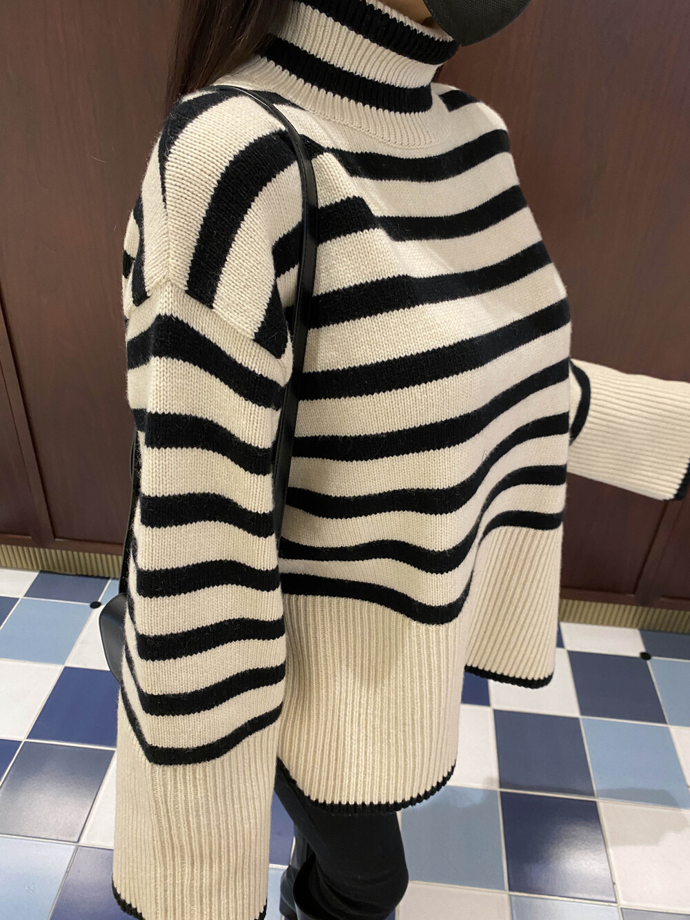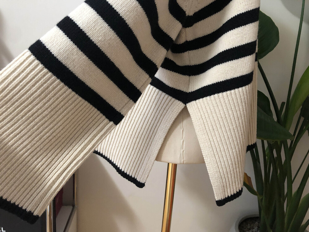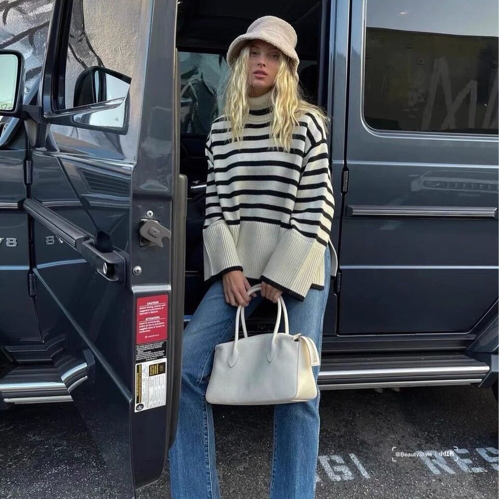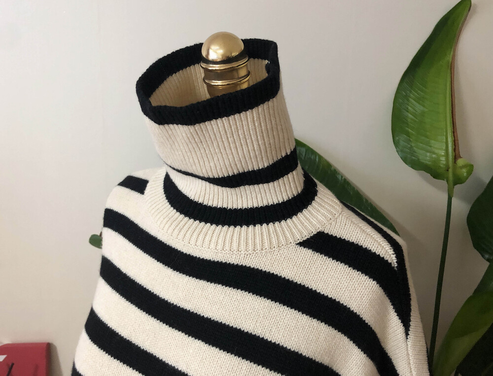 무심한듯 시크한 무드가 느껴지는 스트라이프 터틀넥니트입니다