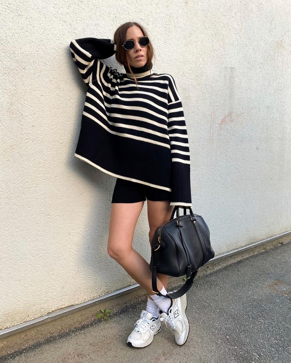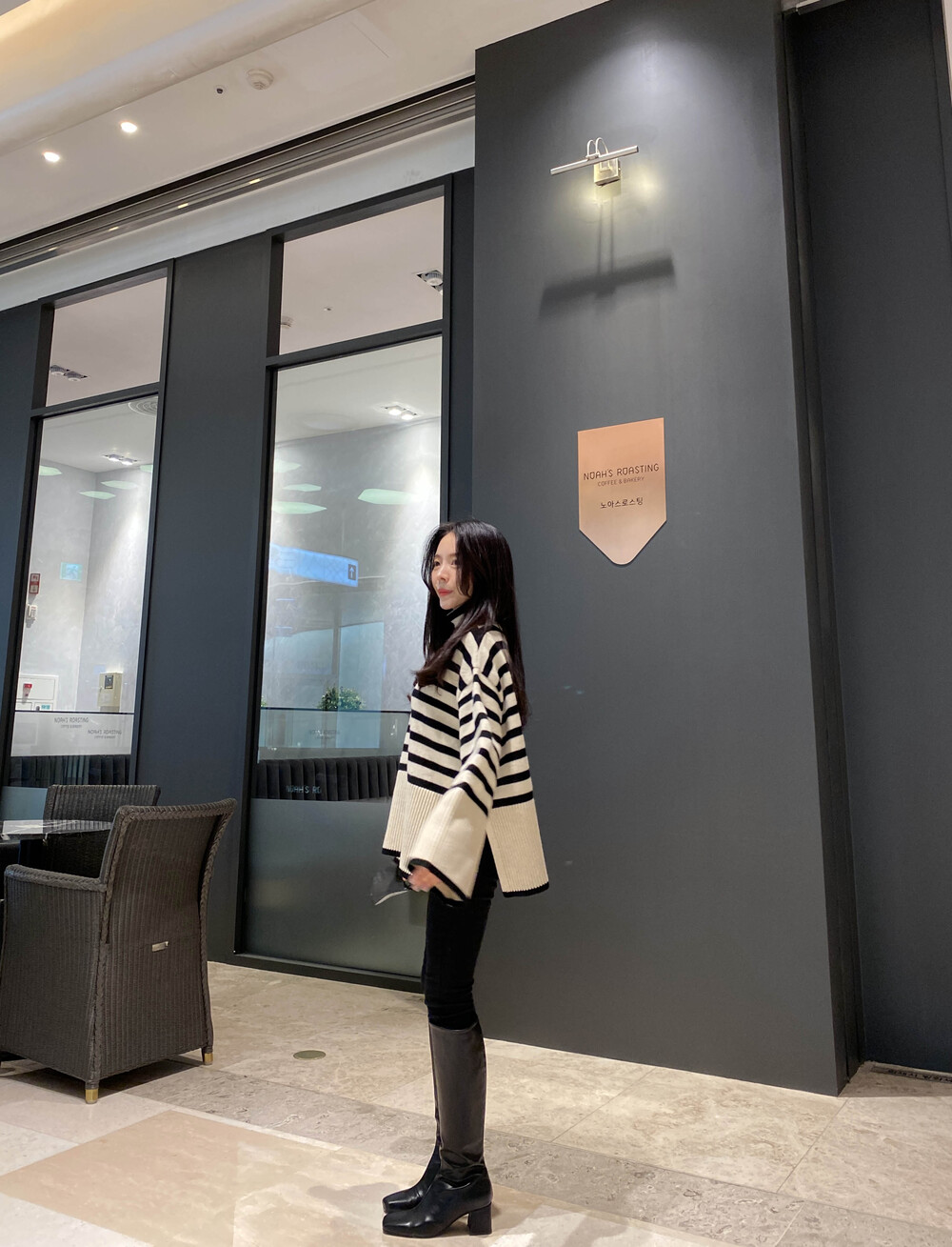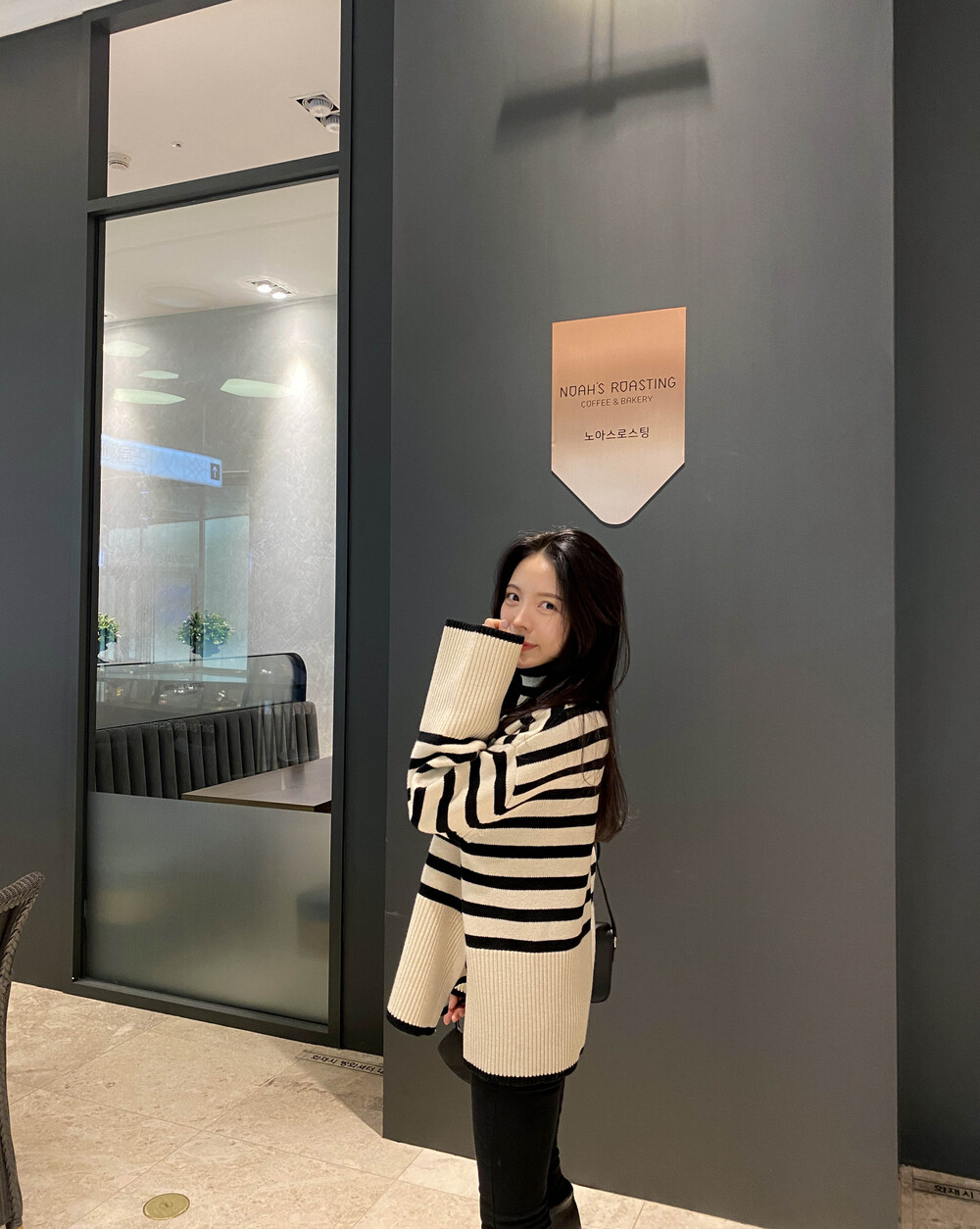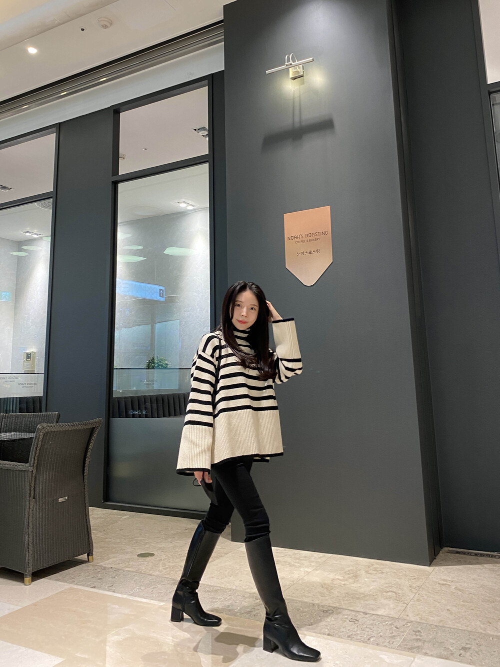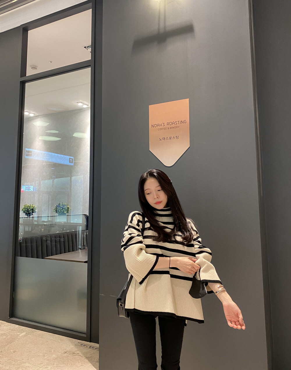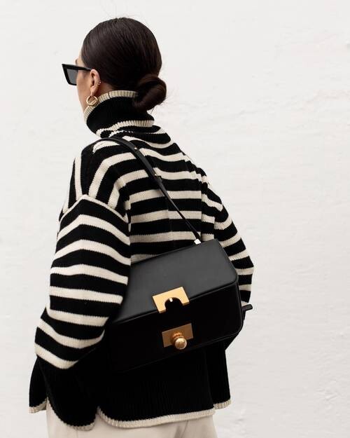 무심한듯 시크한 무드가 느껴지는 스트라이프 터틀넥니트입니다