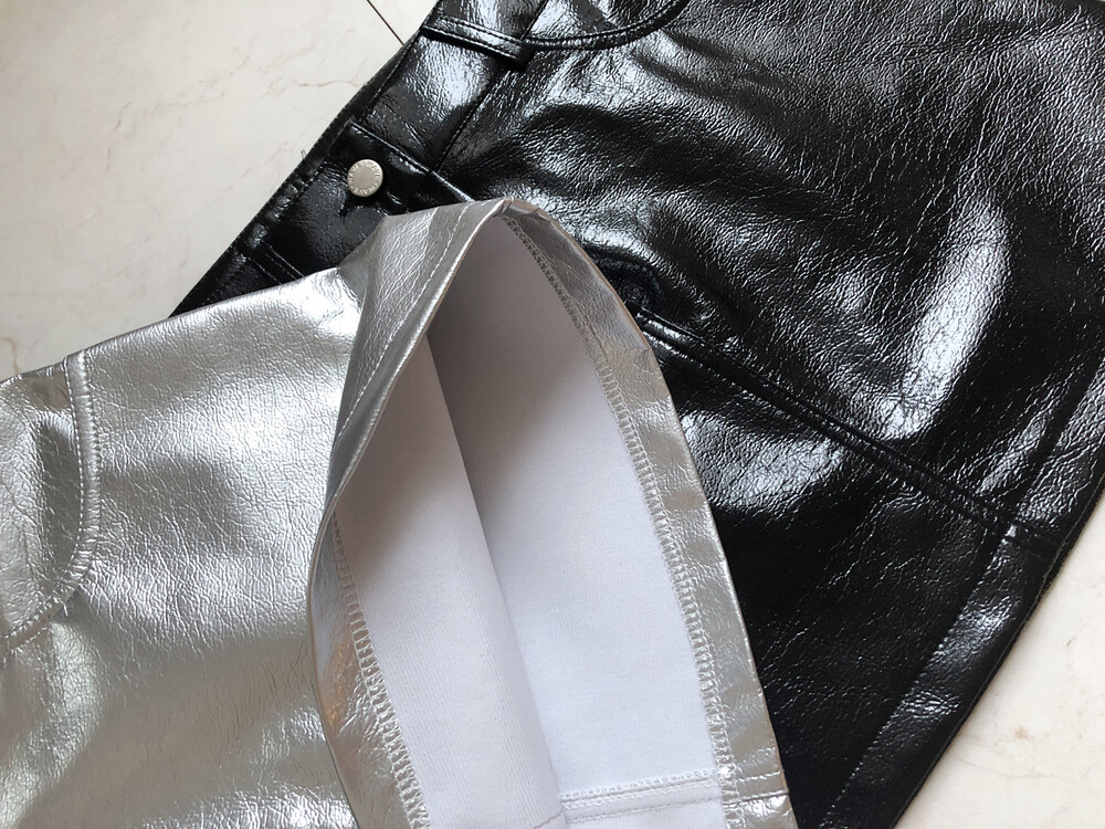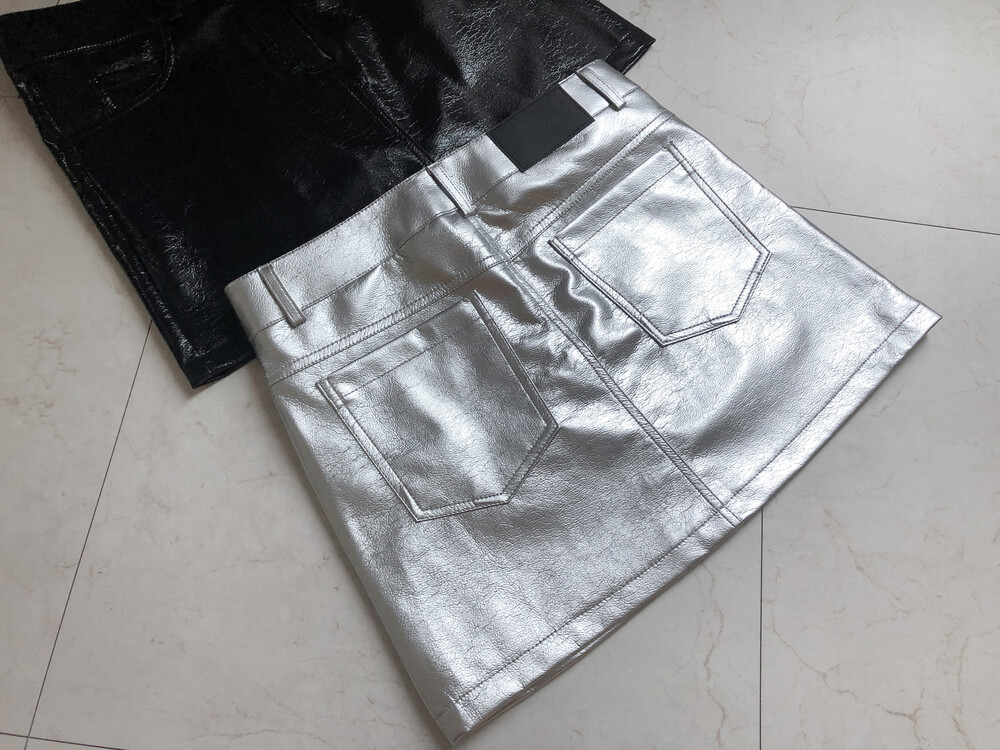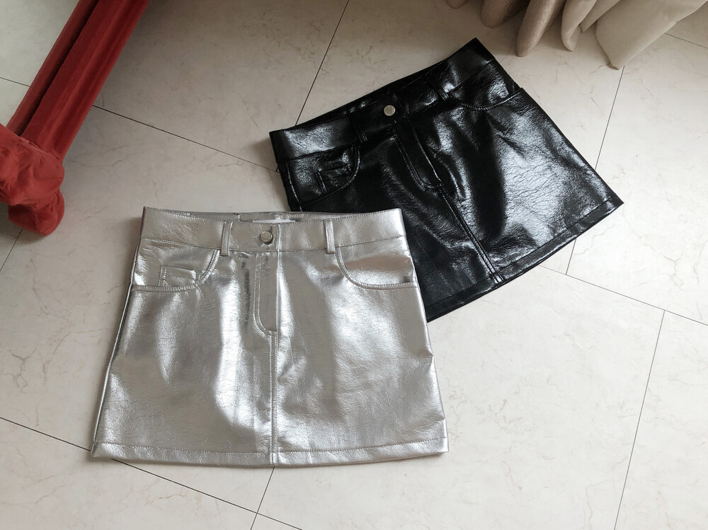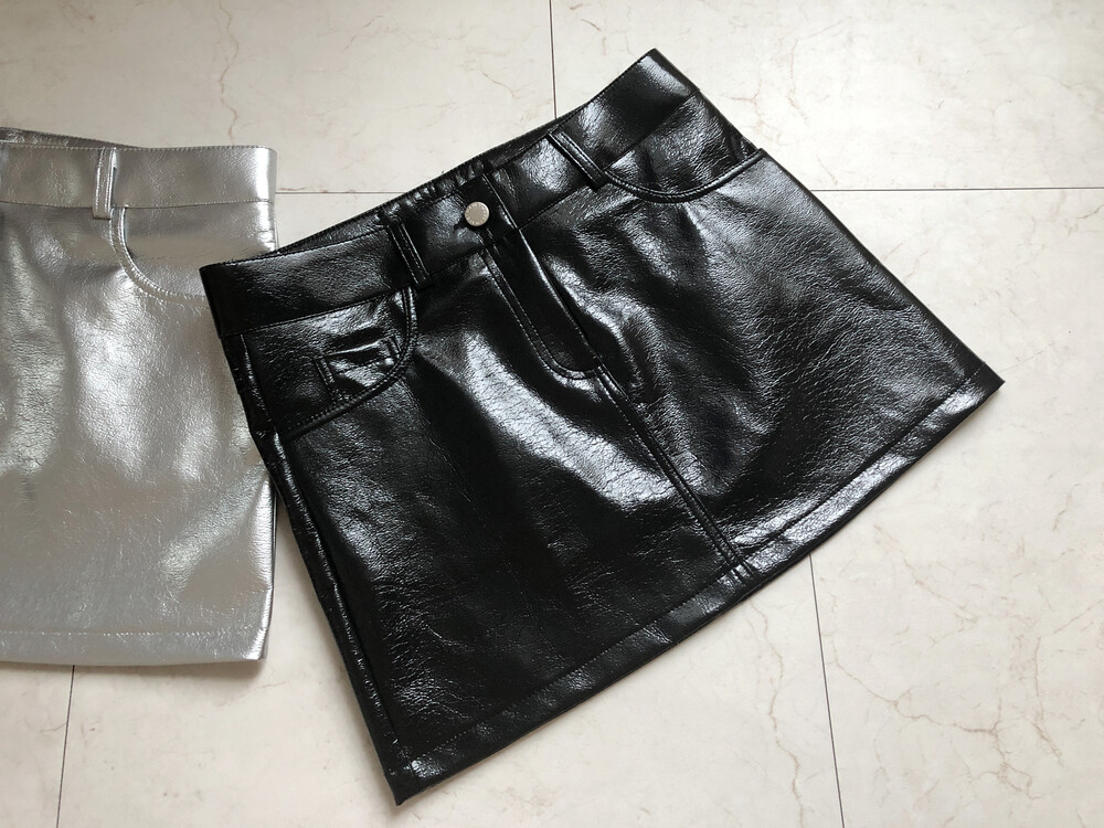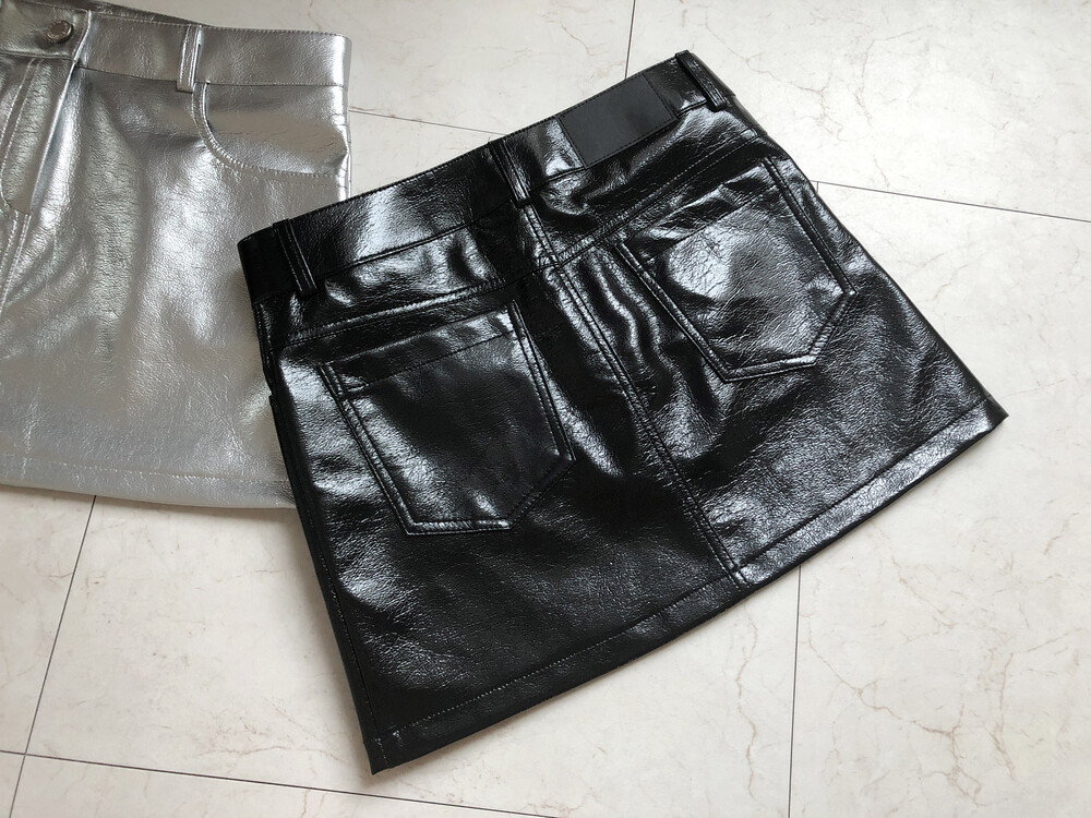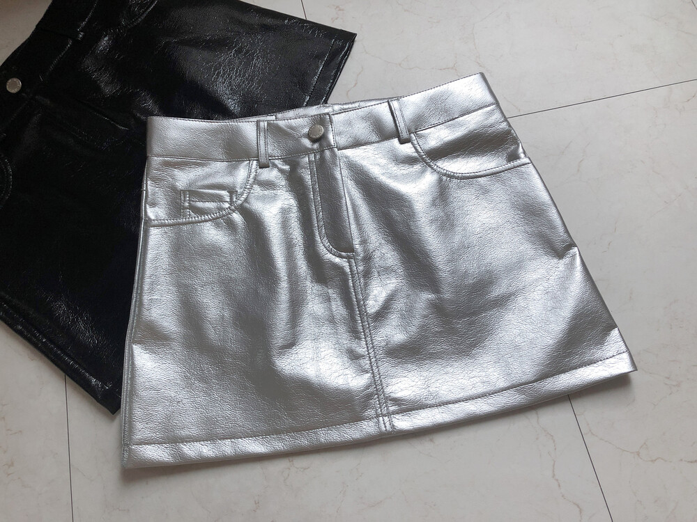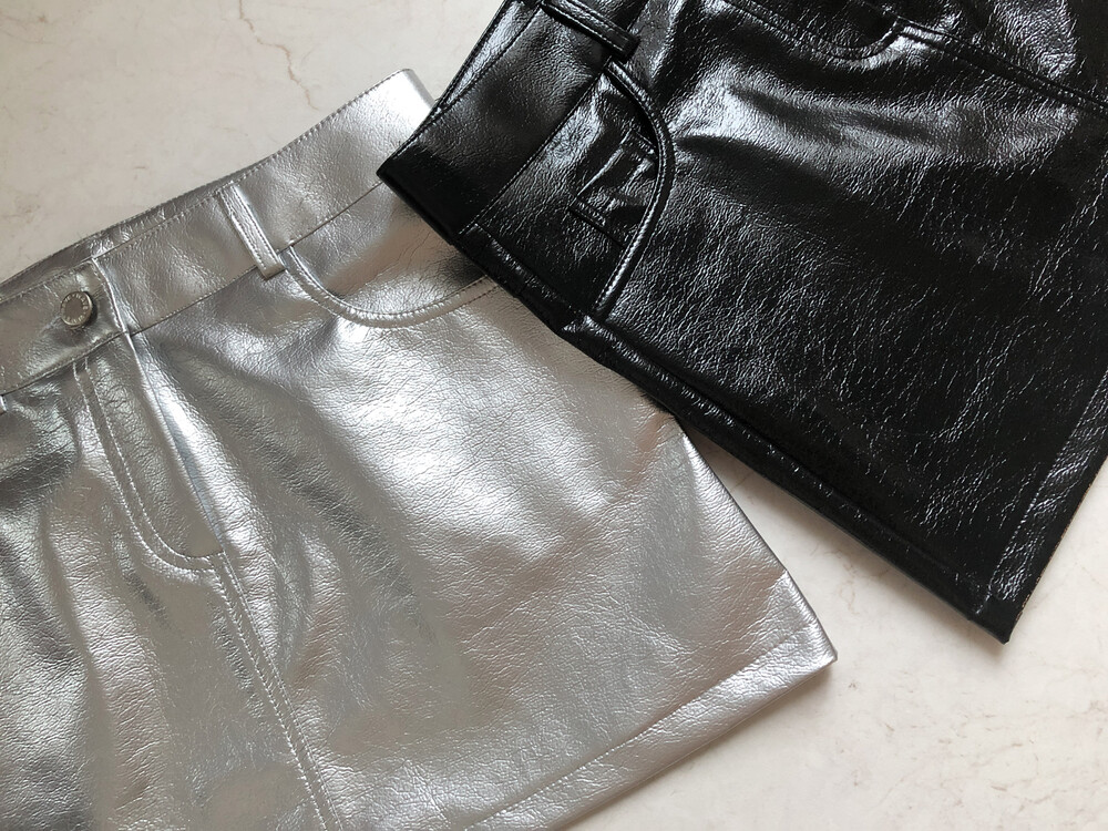 레더 느낌의 메탈릭한 광택감이 트렌디한 느낌을 주는 미니스커트입니다