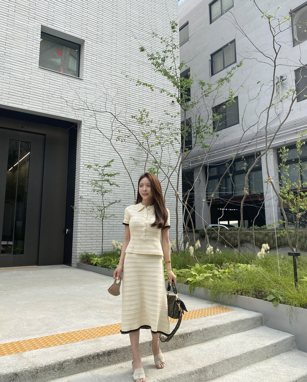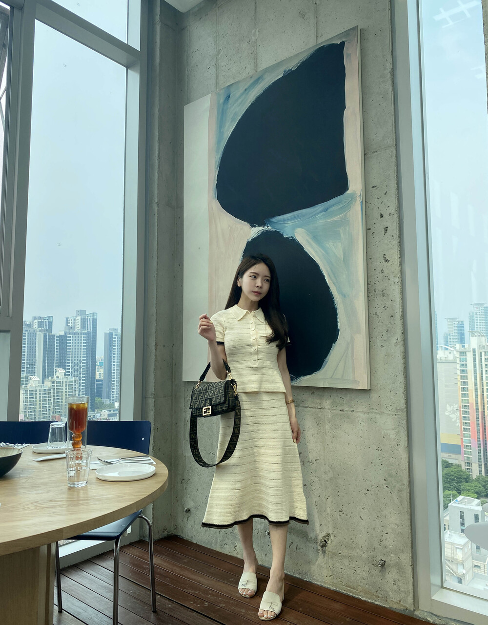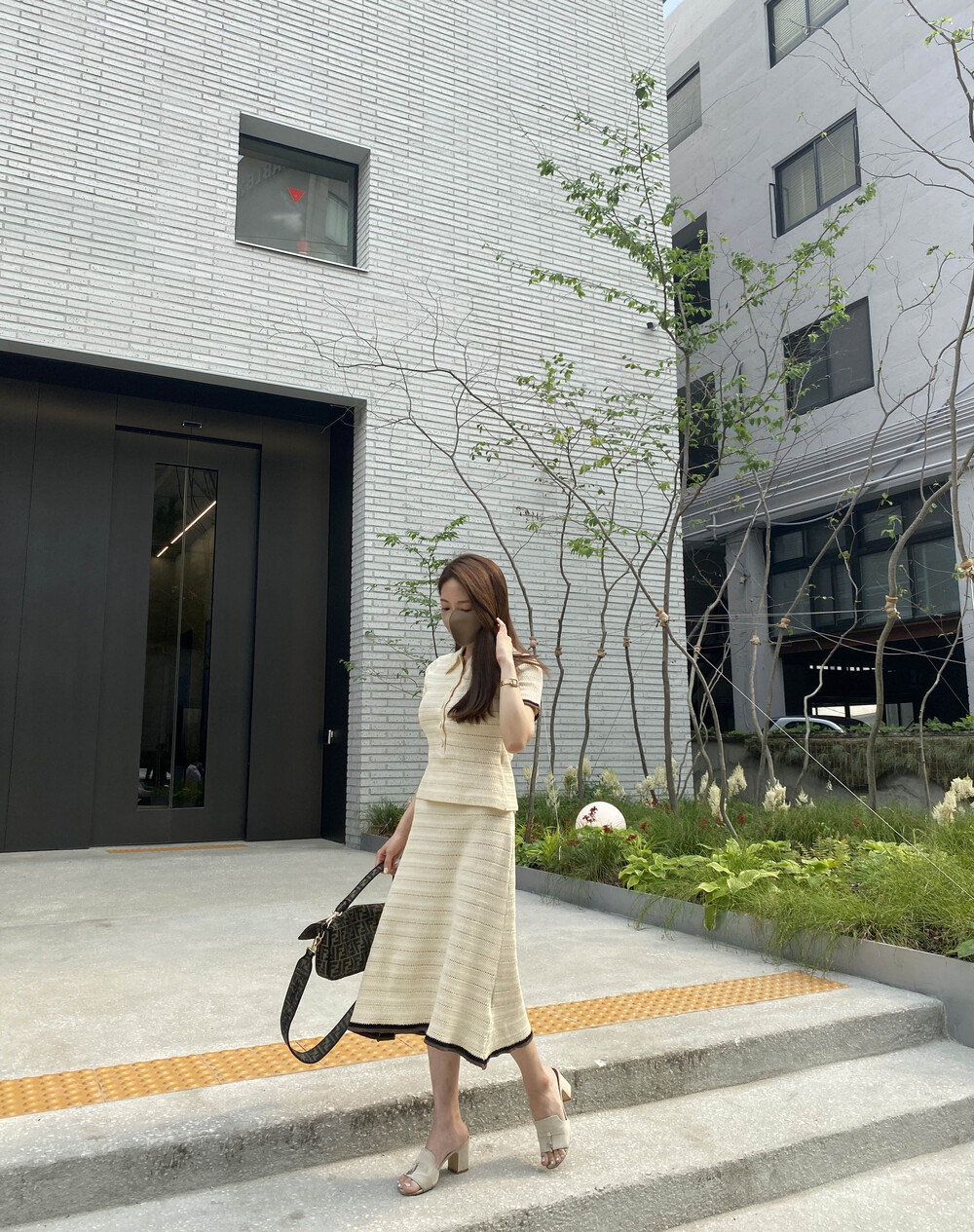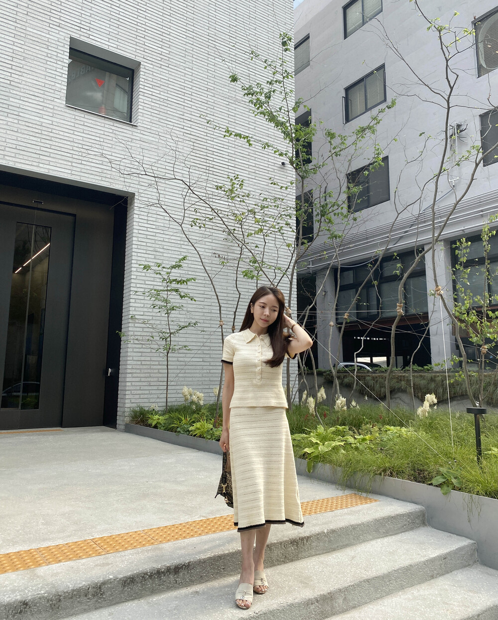 스커트는 미디 기장으로 단아한 기장감으로 부담없이 착용하기 좋아요