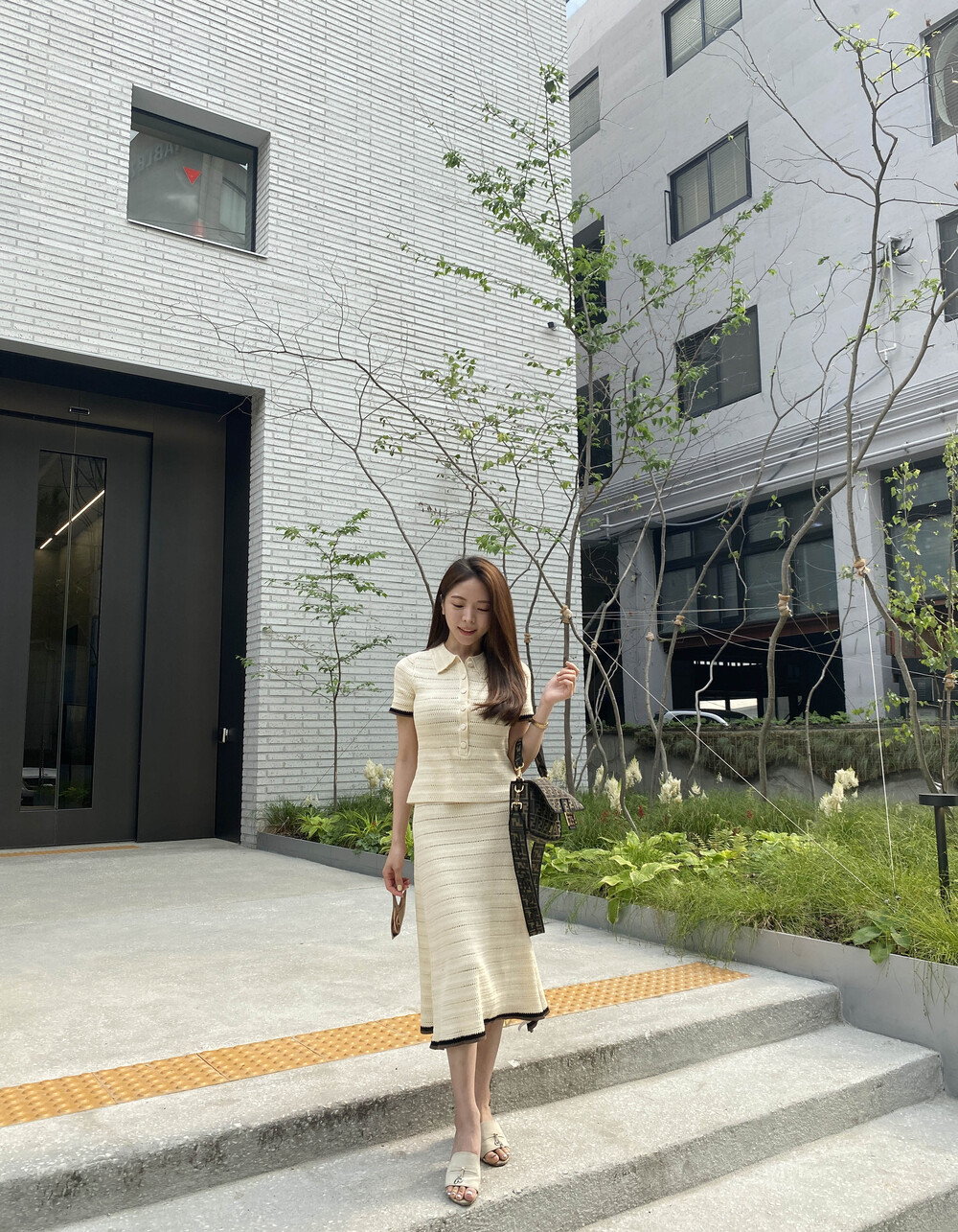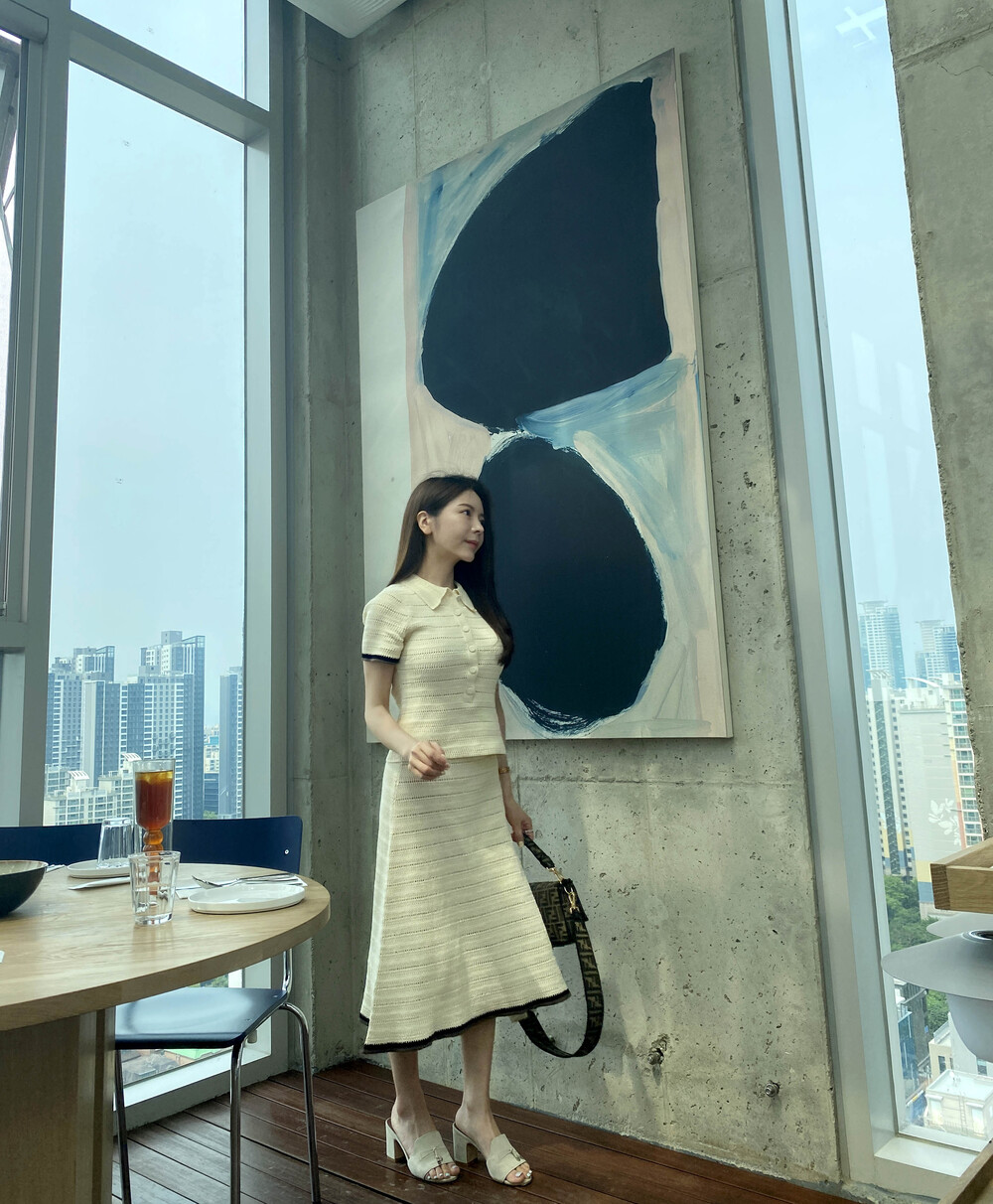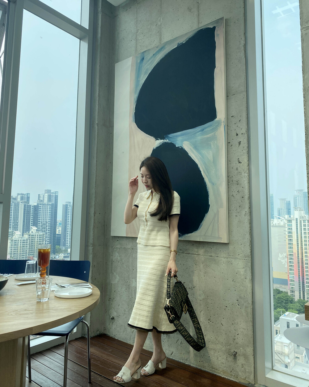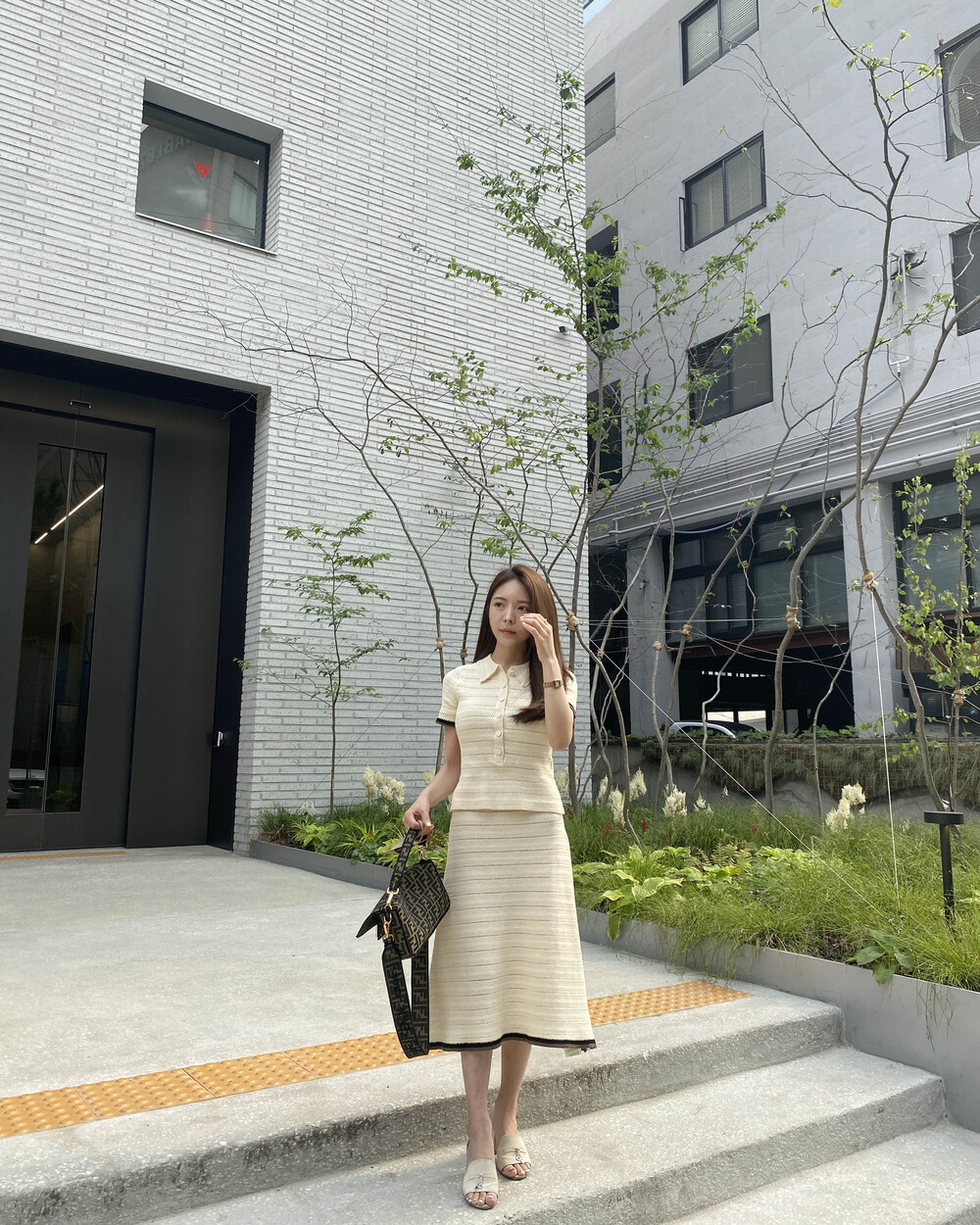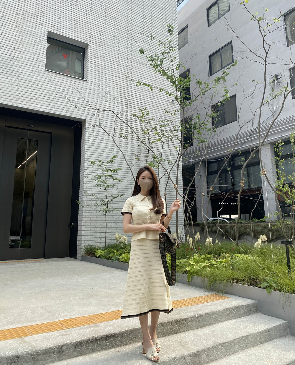 스커트는 미디 기장으로 단아한 기장감으로 부담없이 착용하기 좋아요