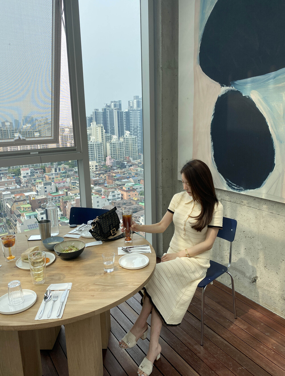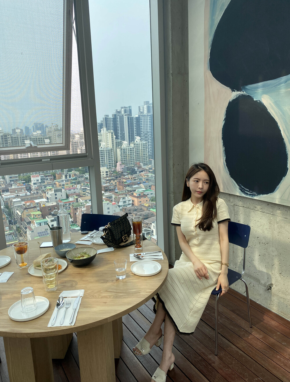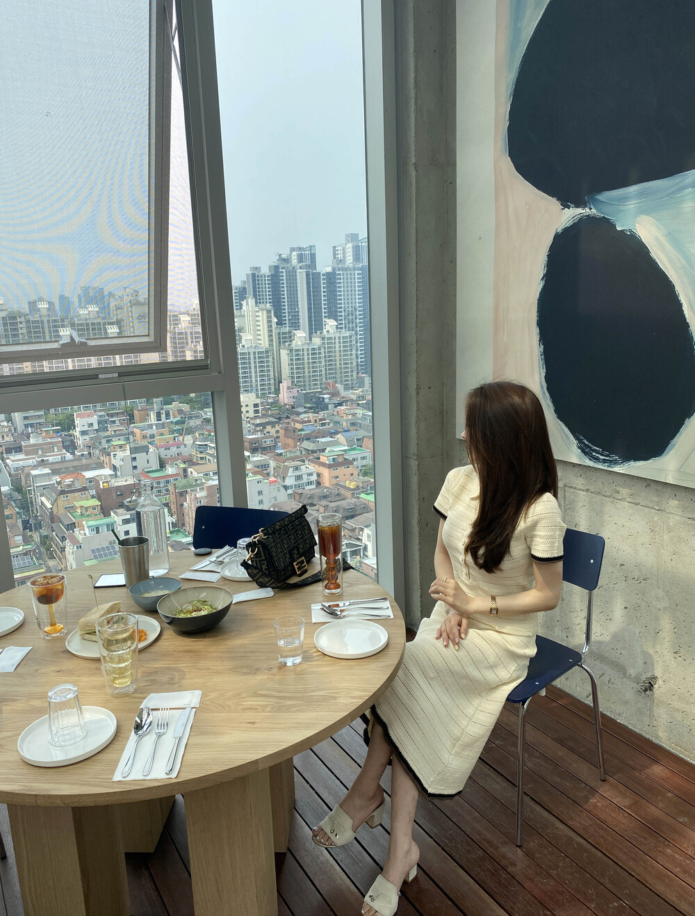 카라넥의 니트탑으로 짧은 기장감이라 다리가 길어보이더라구요ㅎㅎ