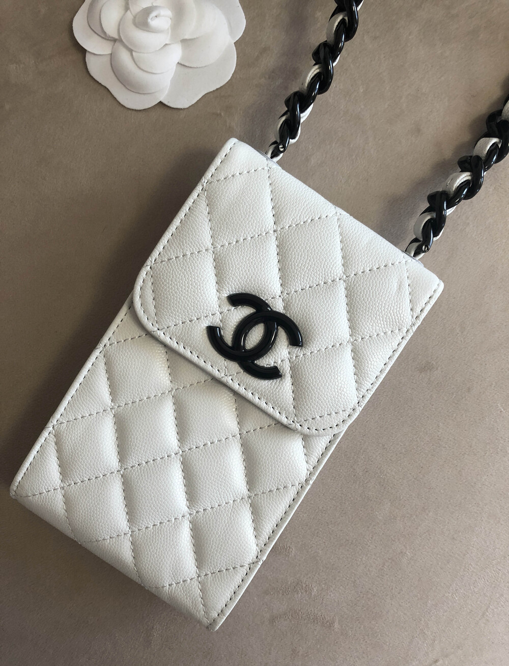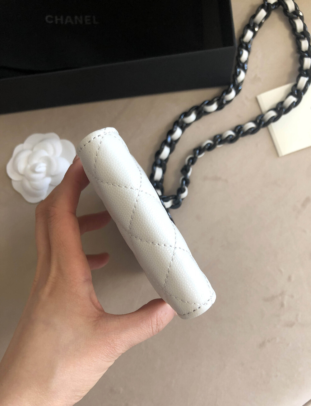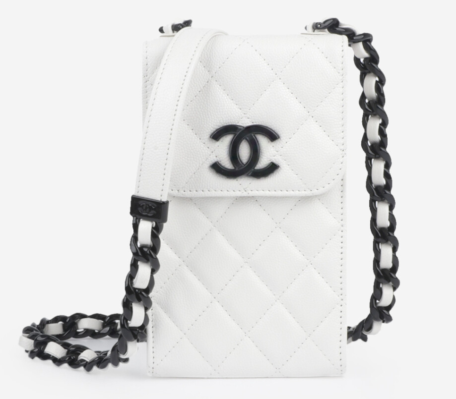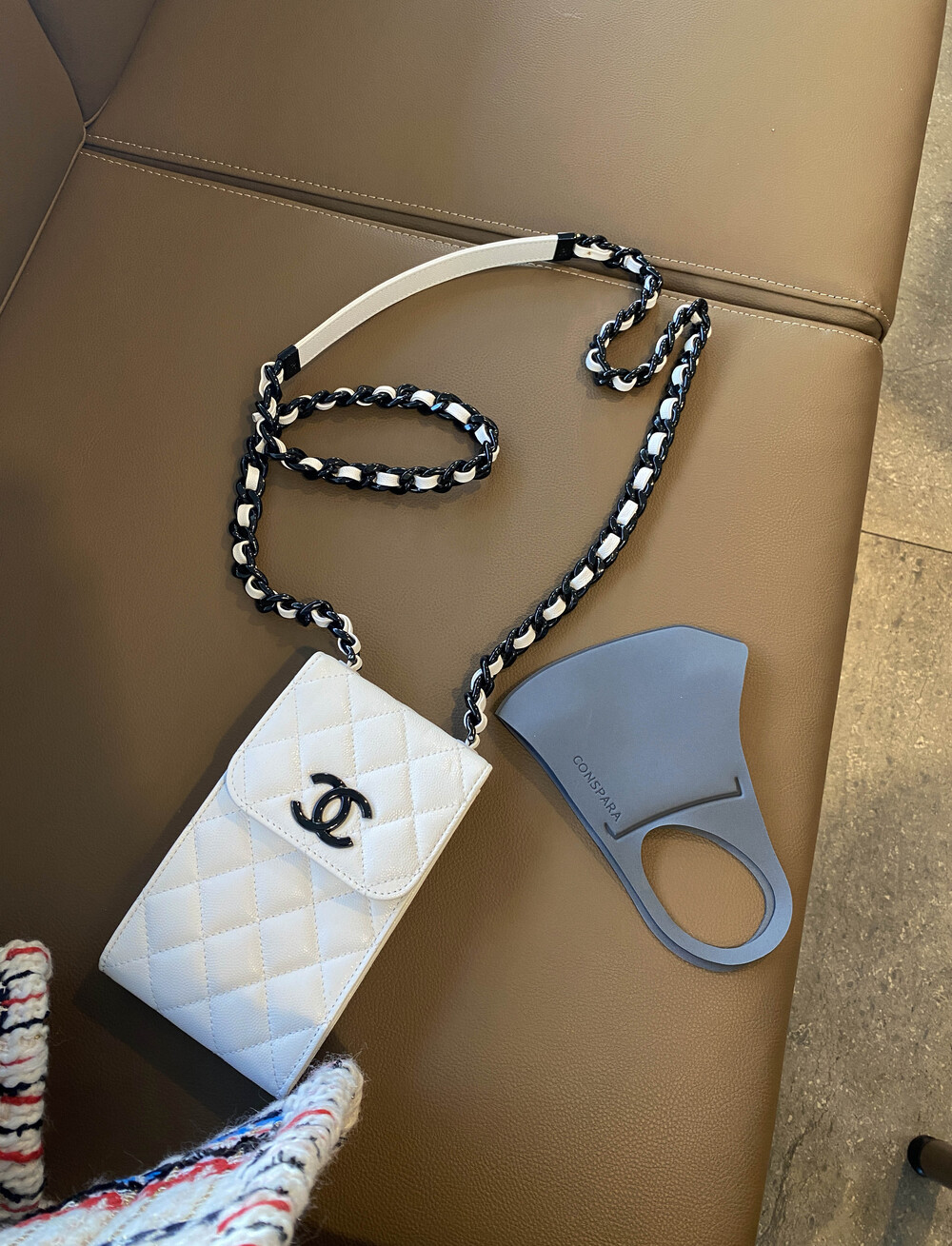체인 미니백으로 유명한 이 상품은 깔끔한 화이트 가죽에 블랙으로 포인트를 주어