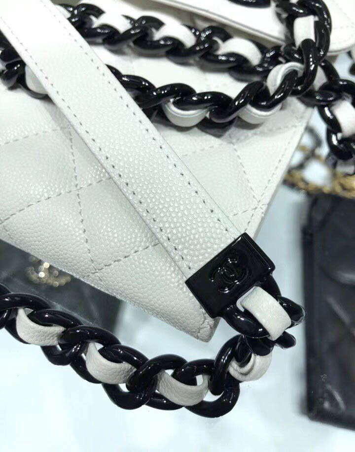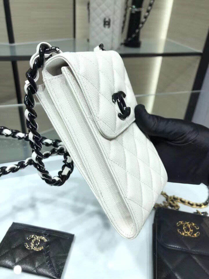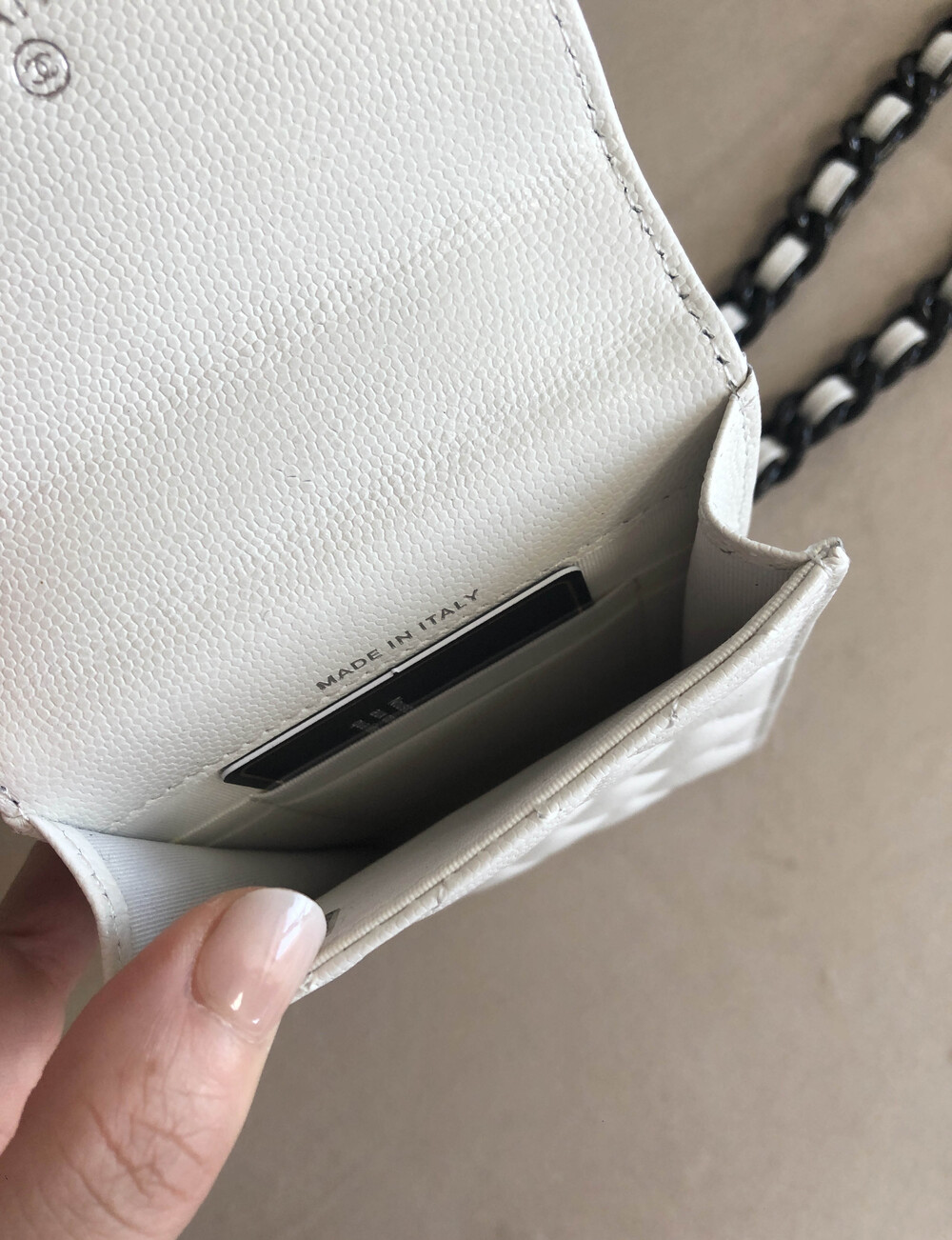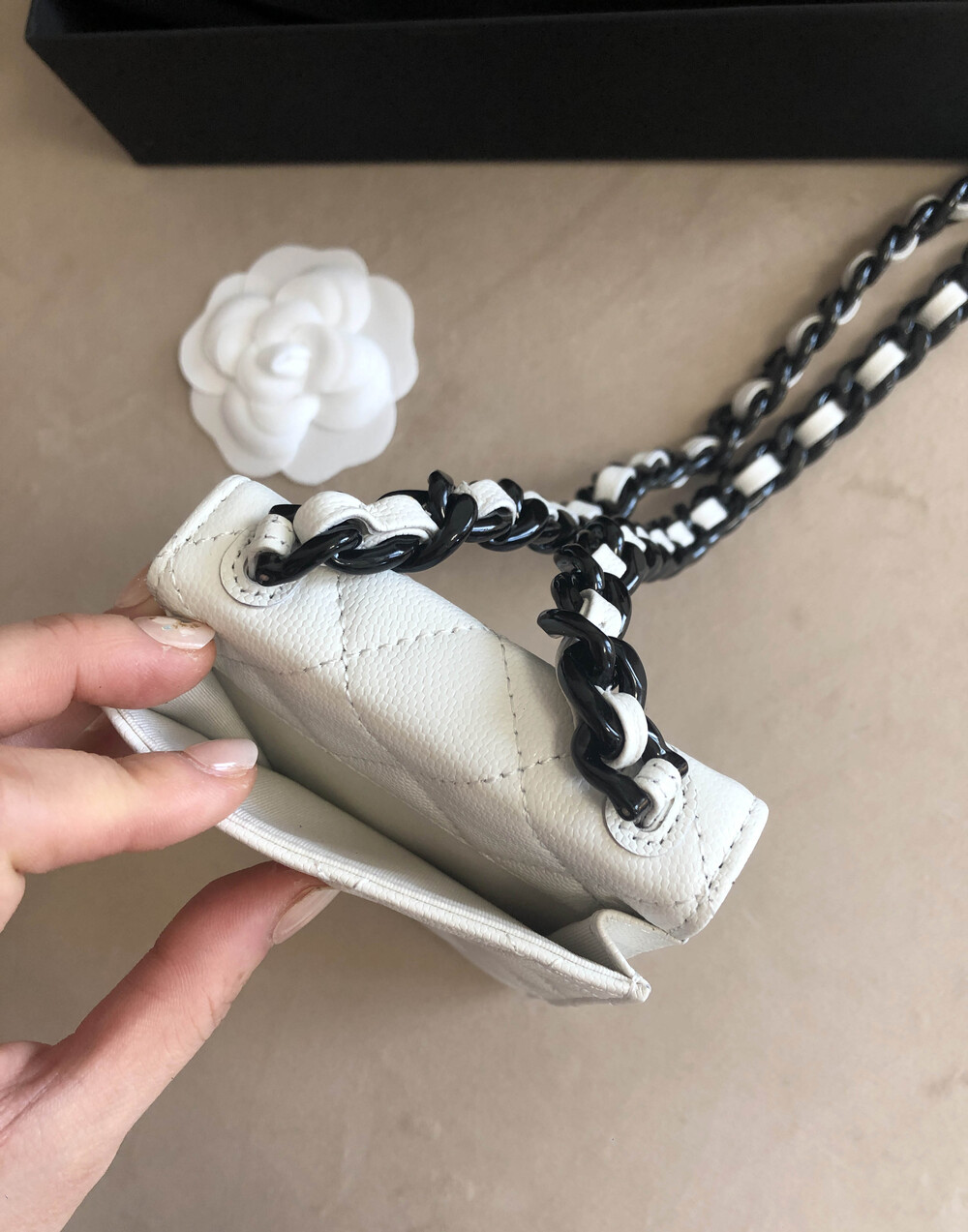 체인 미니백으로 유명한 이 상품은 깔끔한 화이트 가죽에 블랙으로 포인트를 주어
