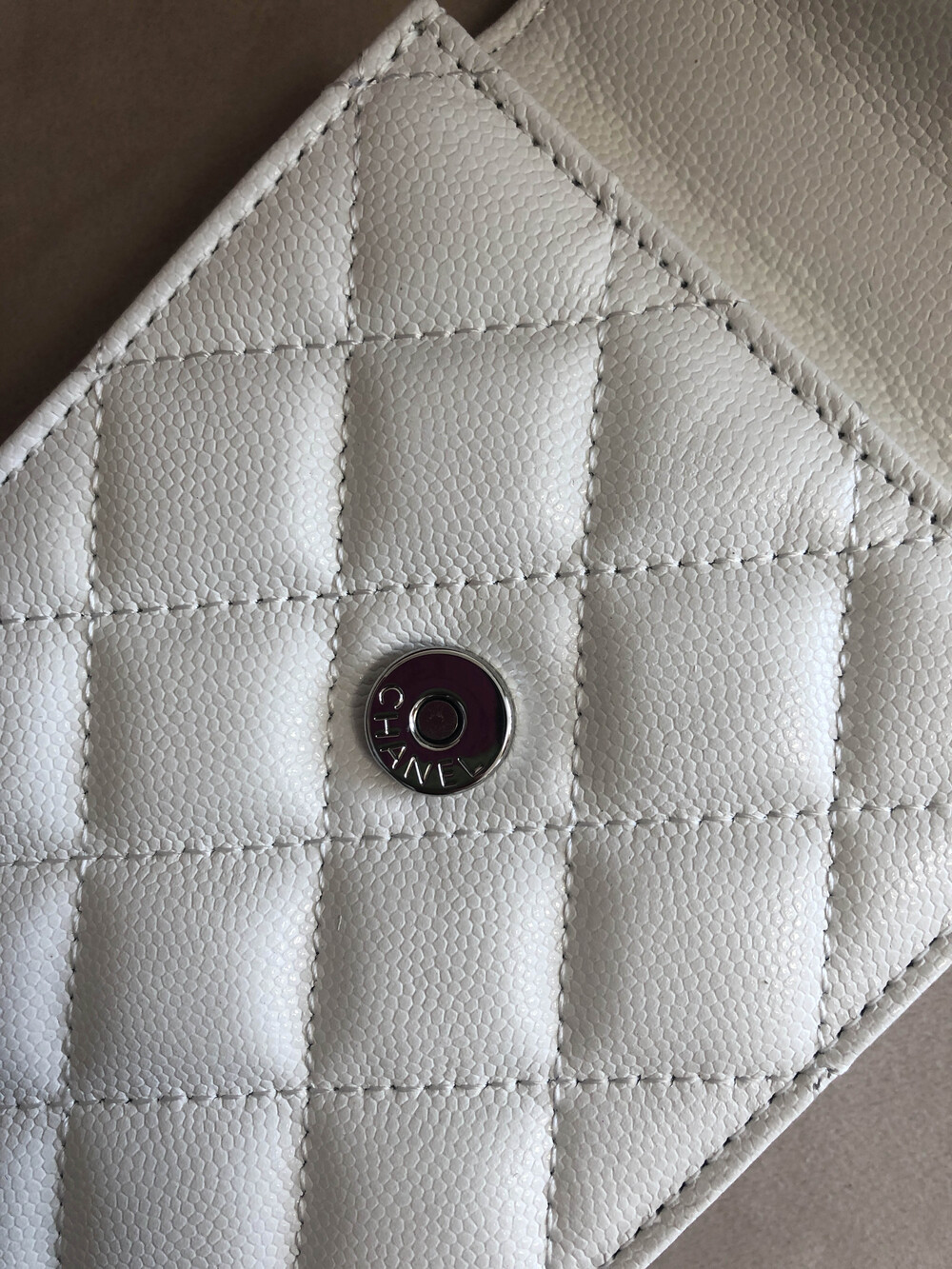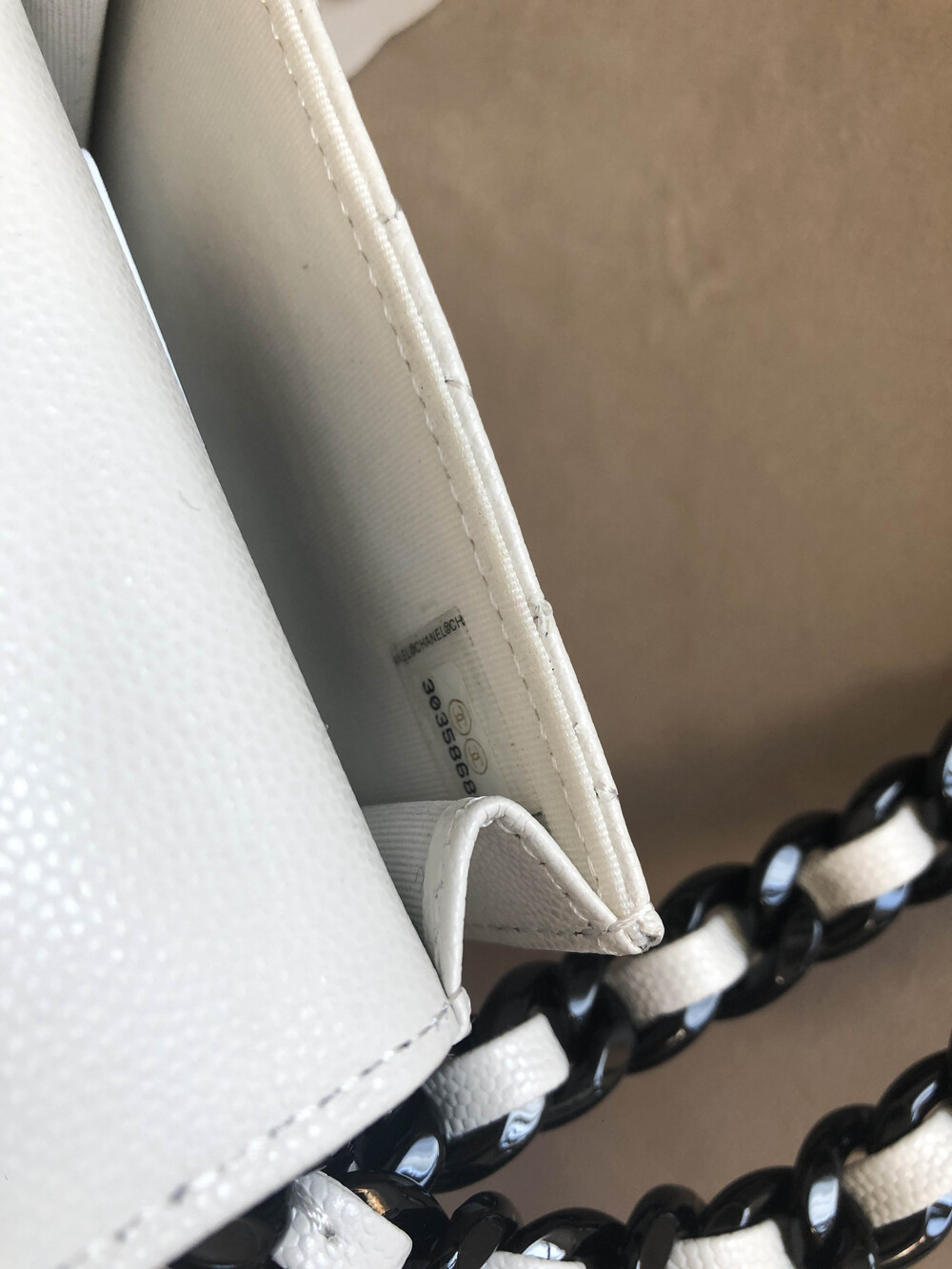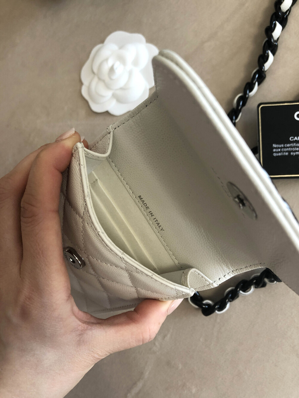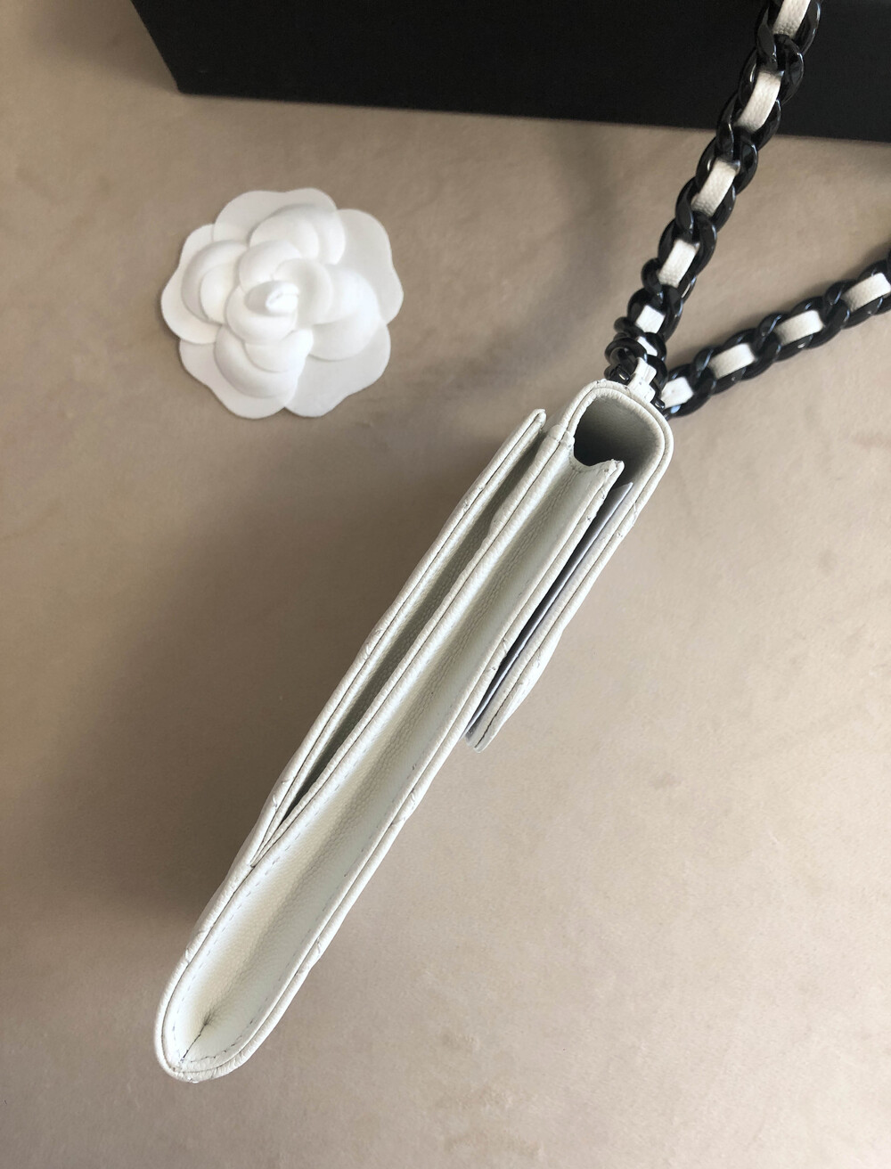 체인 미니백으로 유명한 이 상품은 깔끔한 화이트 가죽에 블랙으로 포인트를 주어