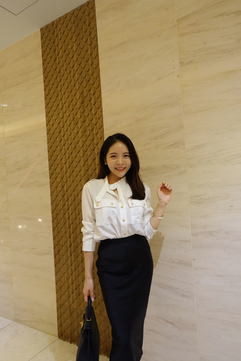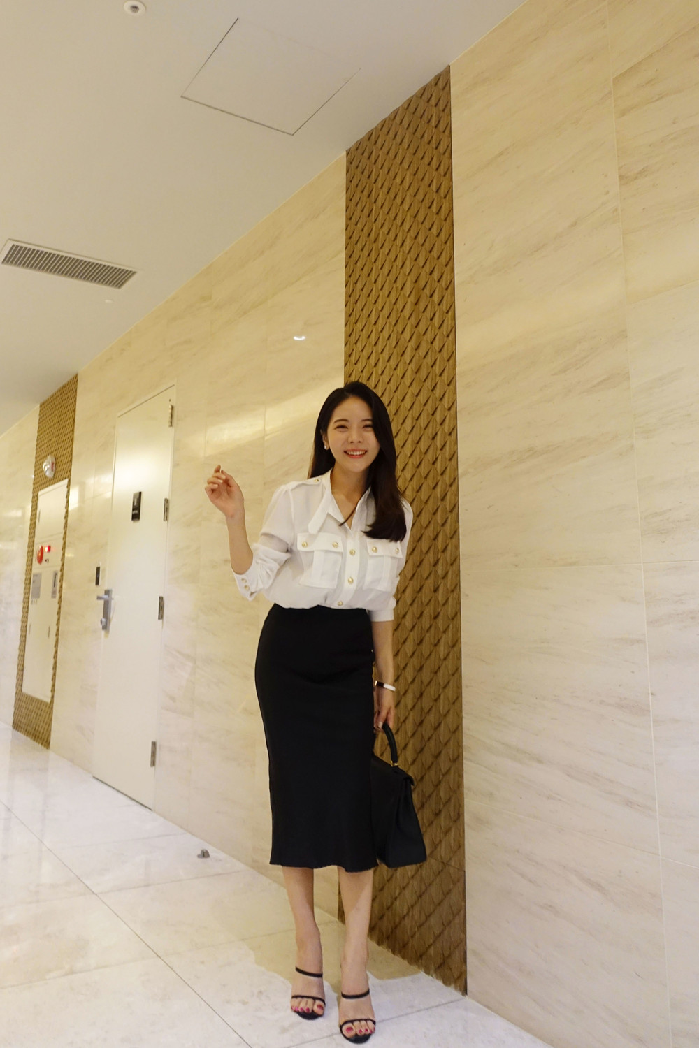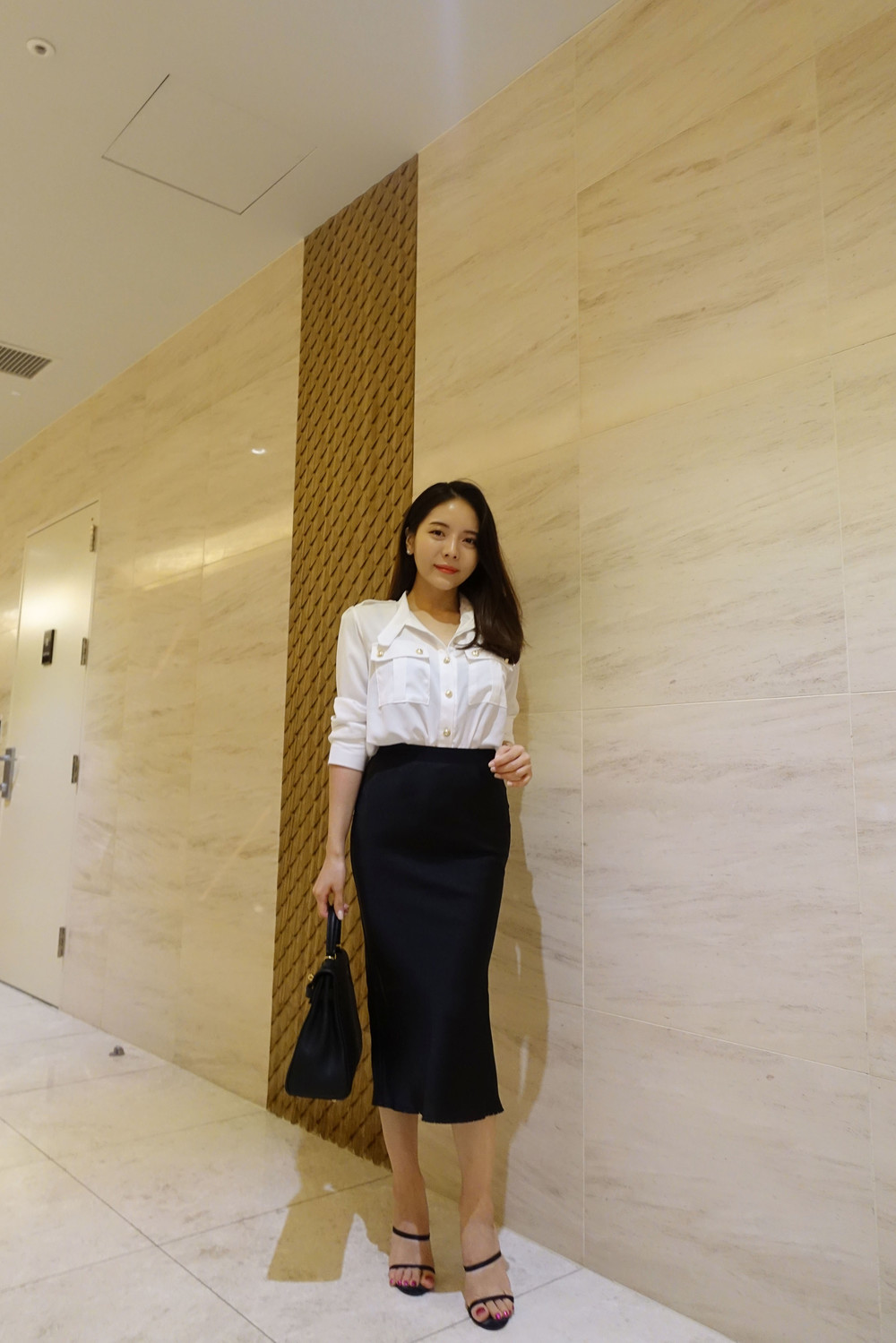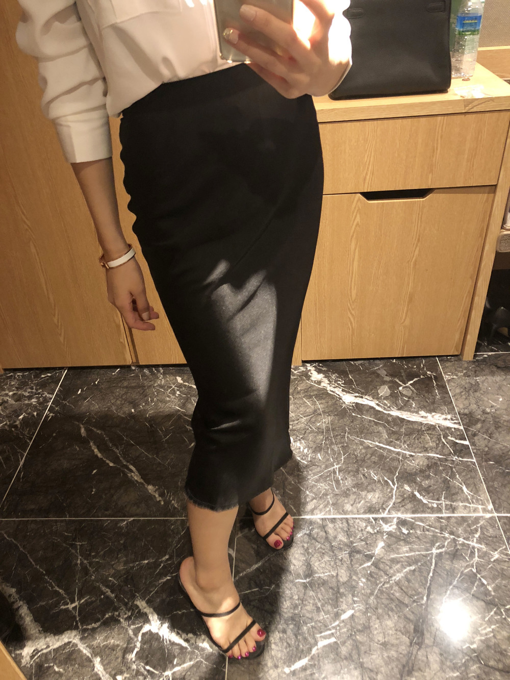 슬림해 보이는 미디 기장 스커트입니다