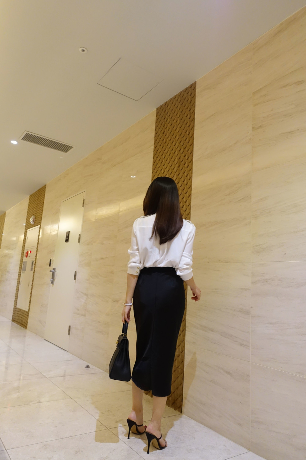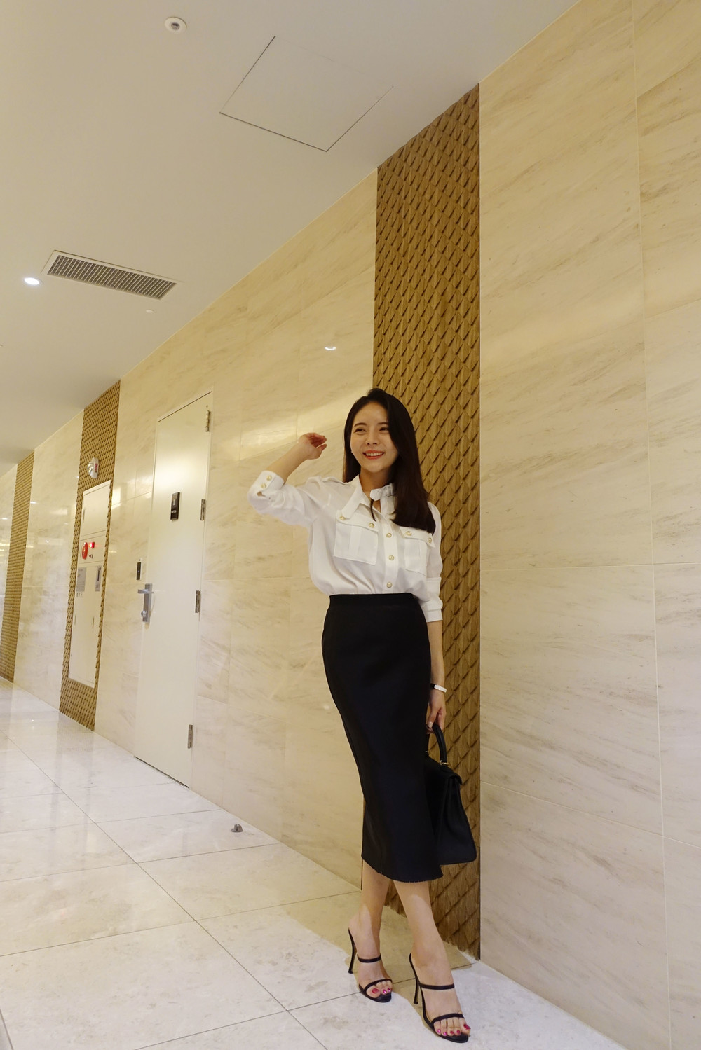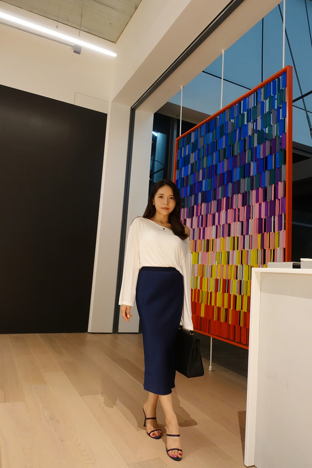슬림해 보이는 미디 기장 스커트입니다