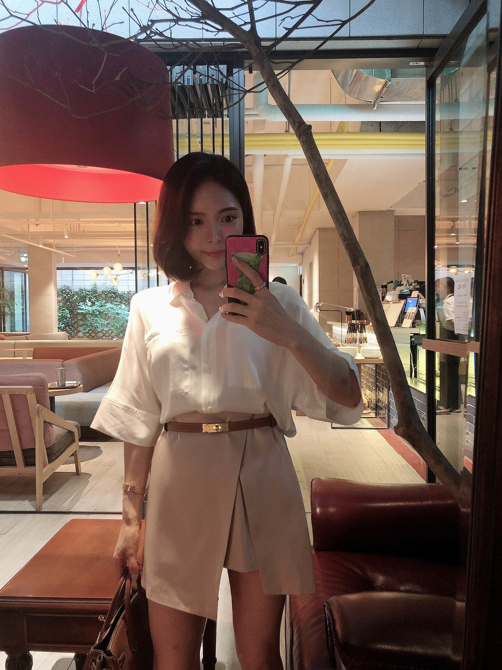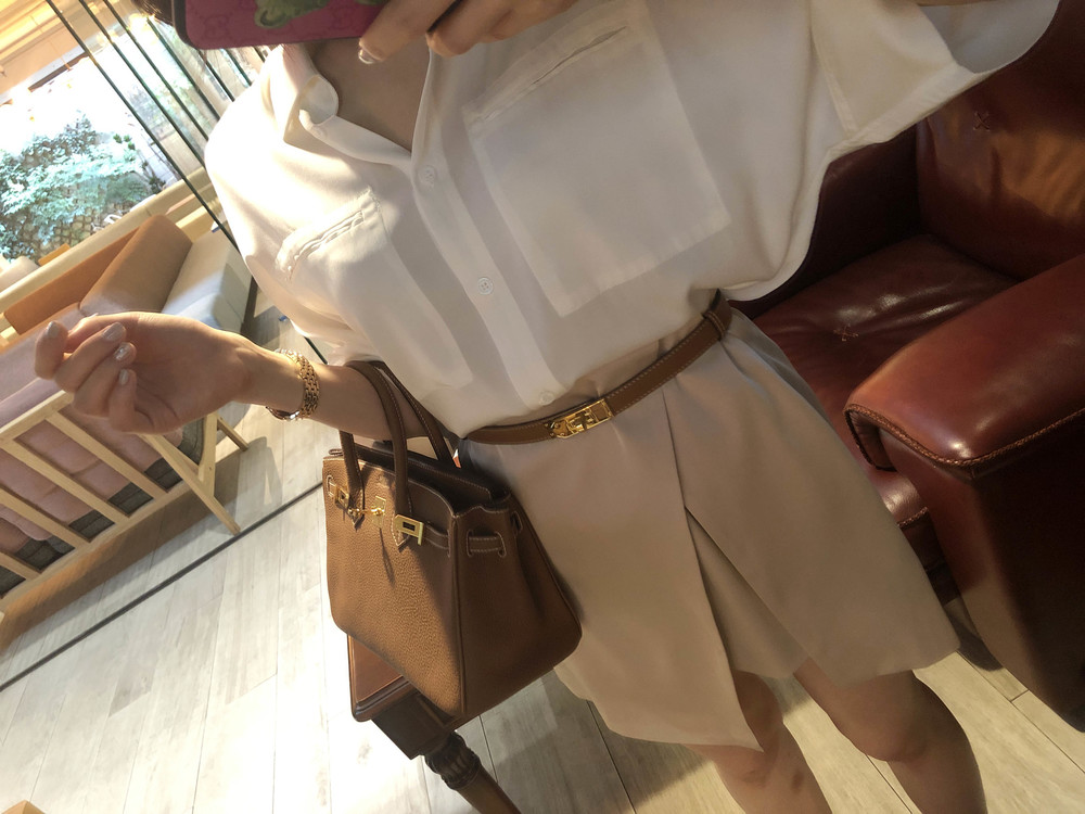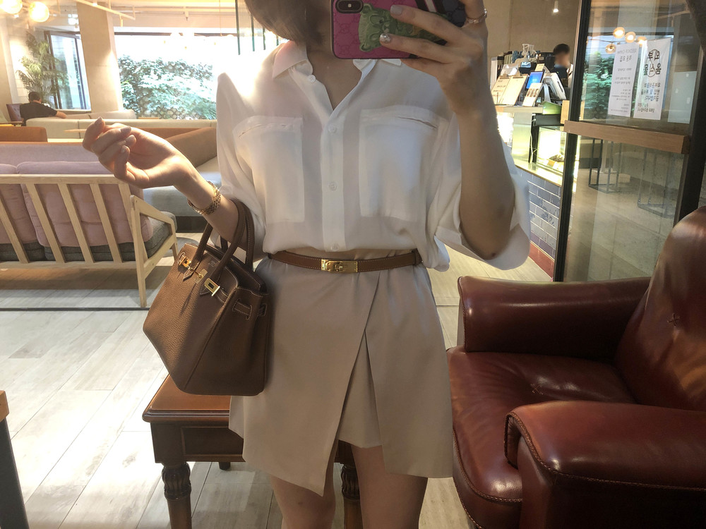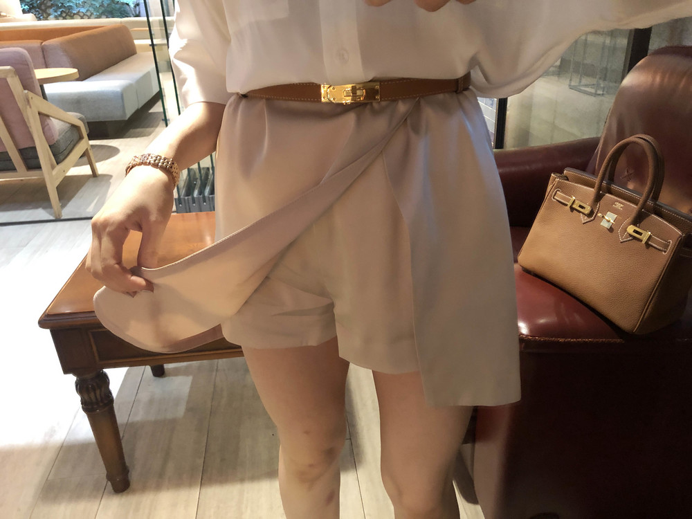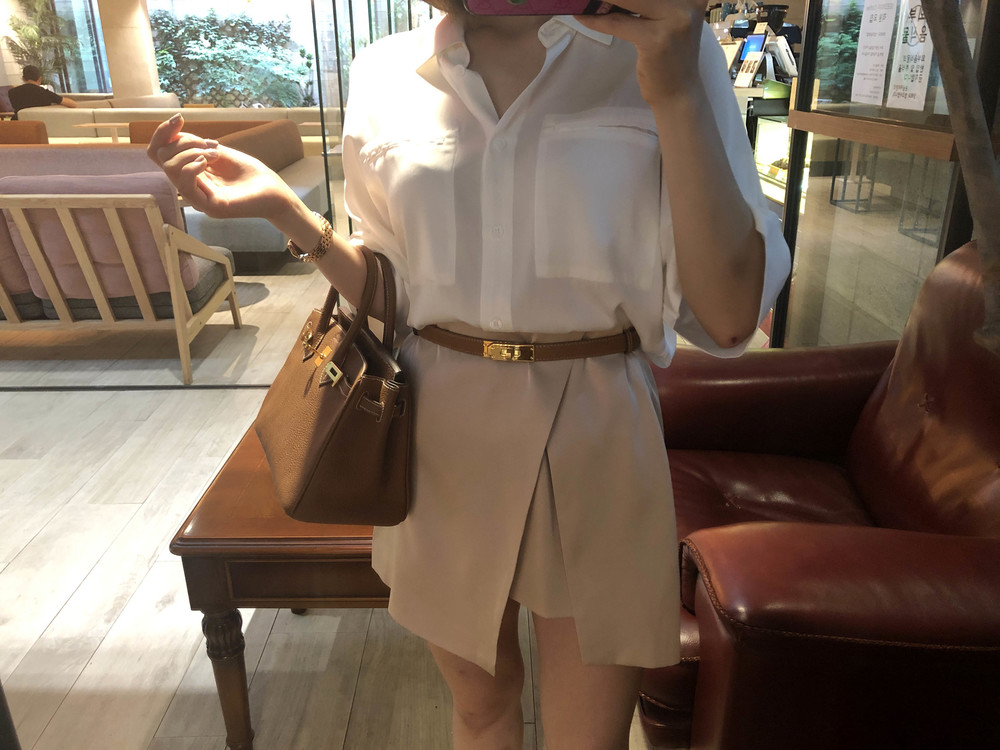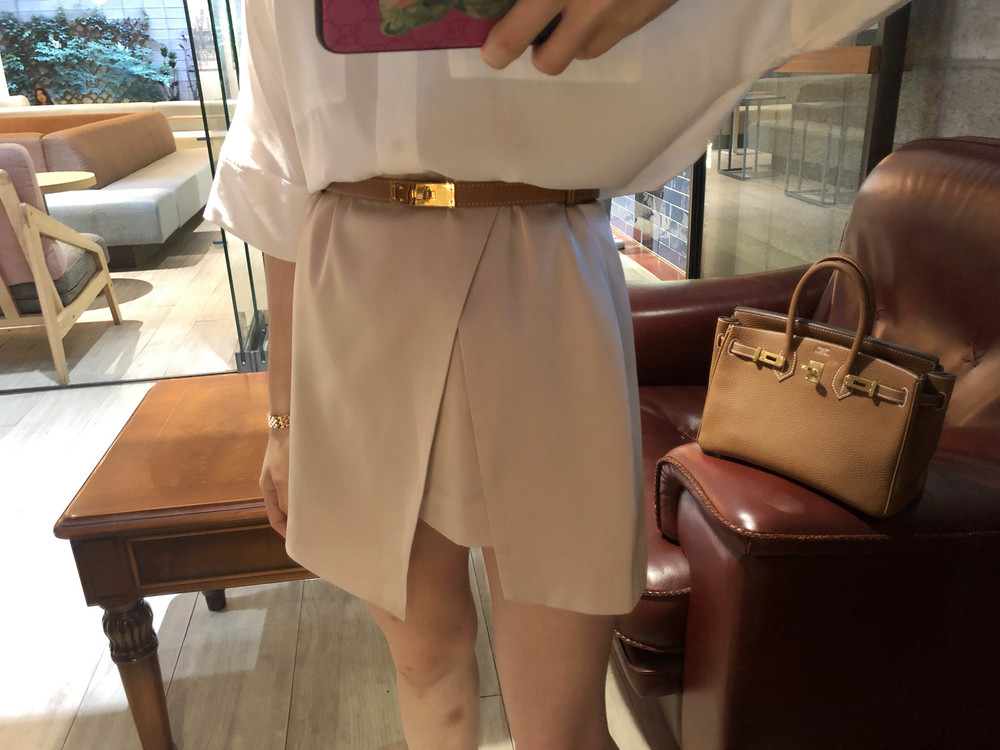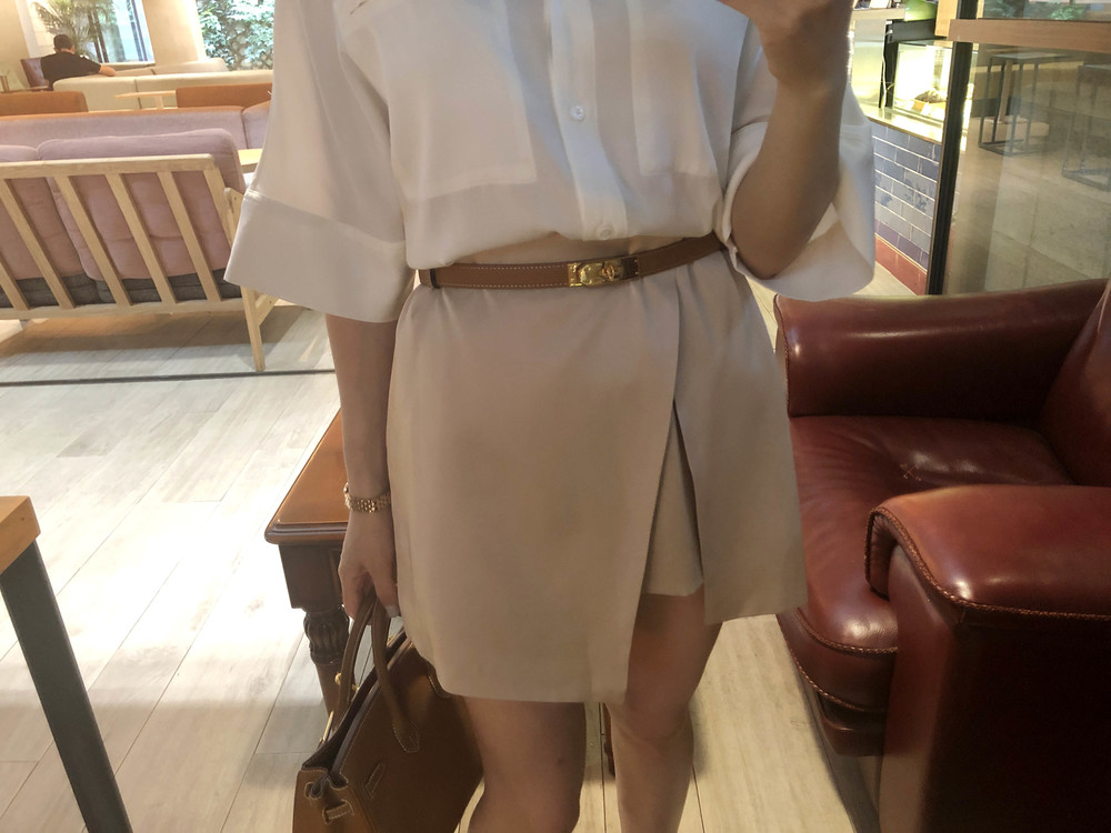 허리에 벨트를 착용하여 매우 짧은 기장감으로 착용했습니다