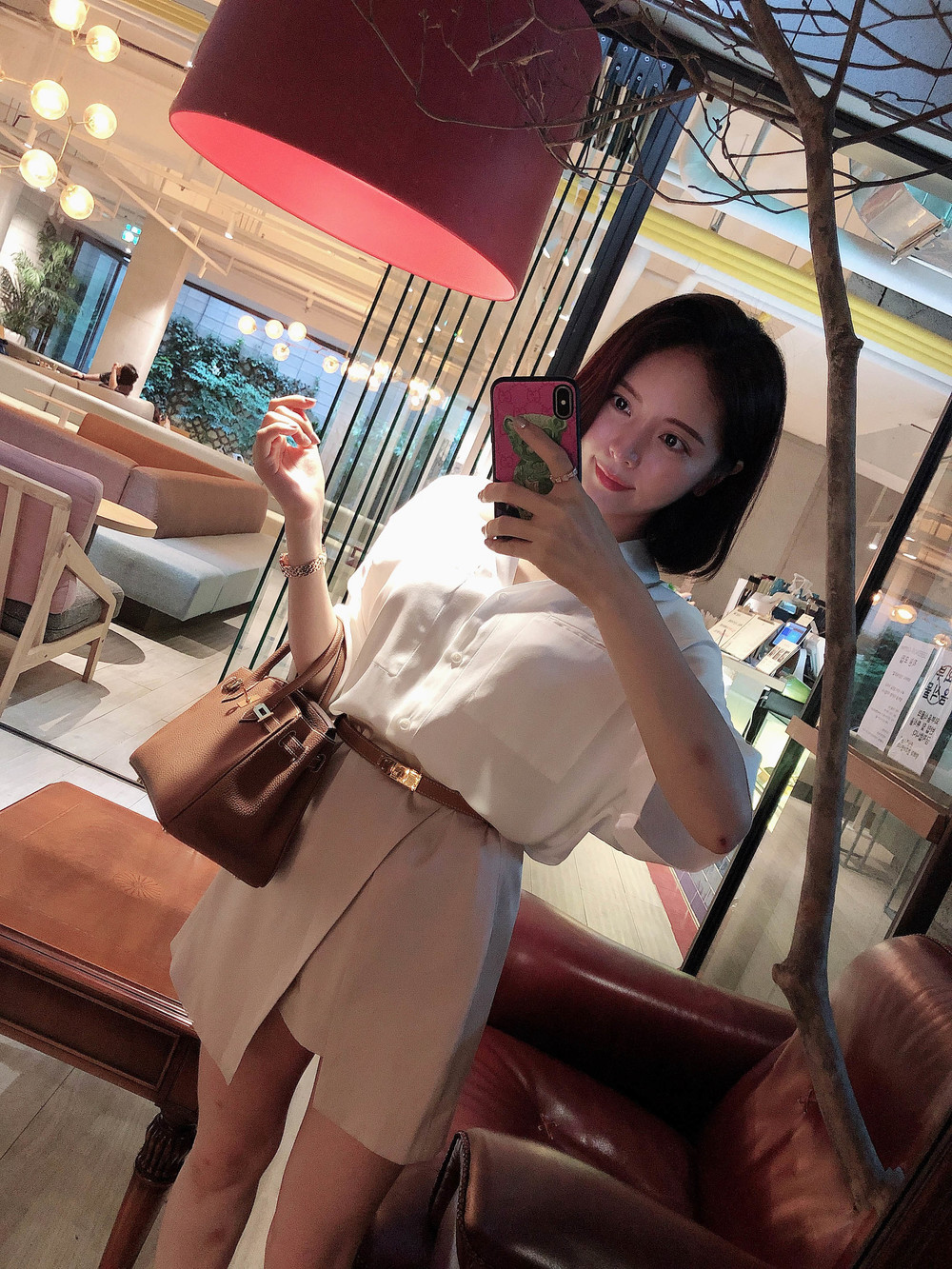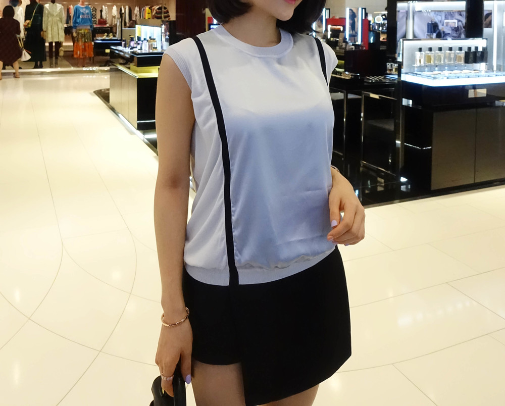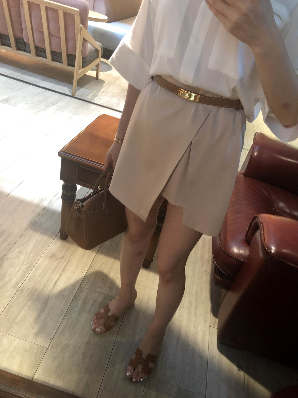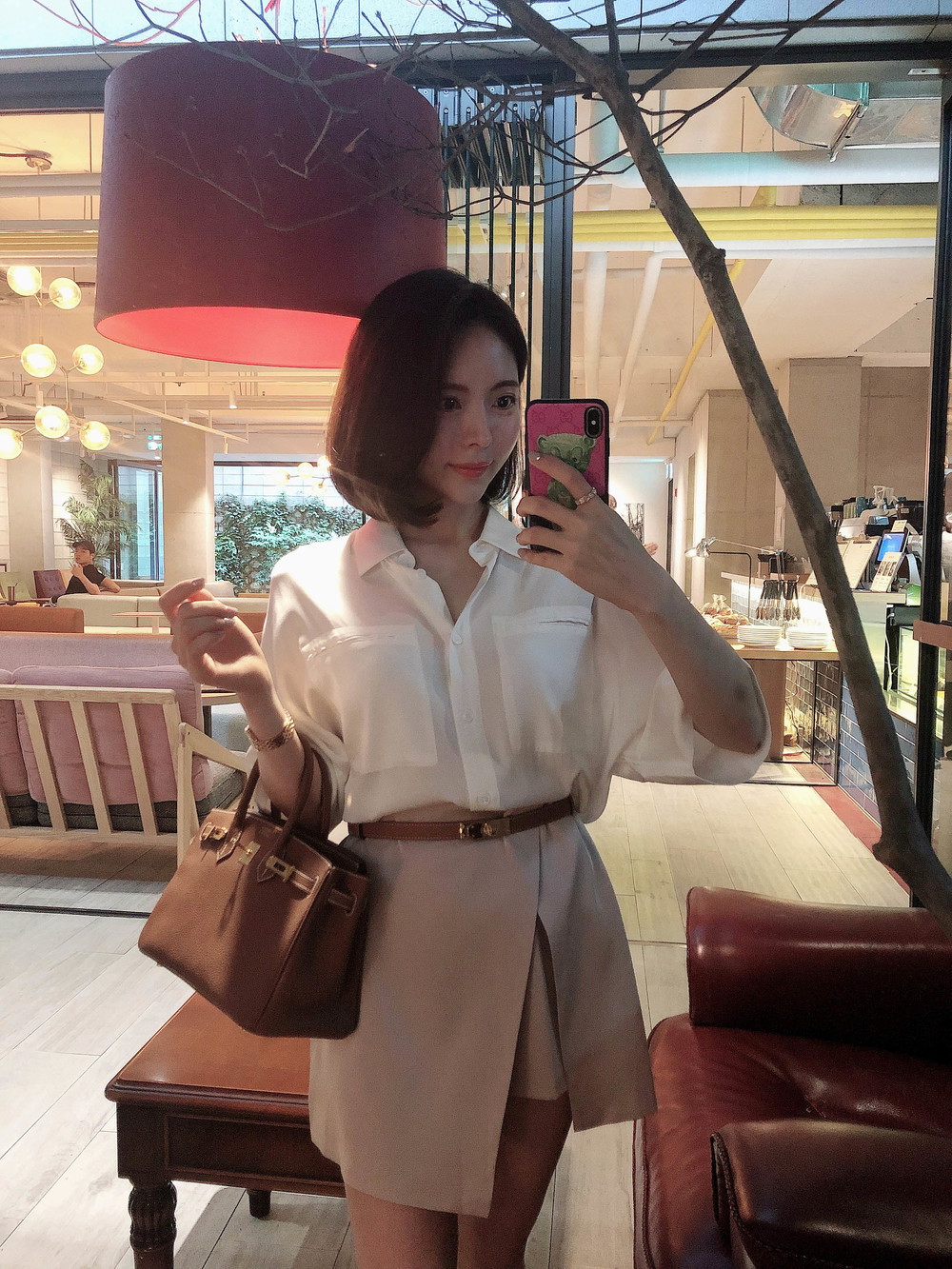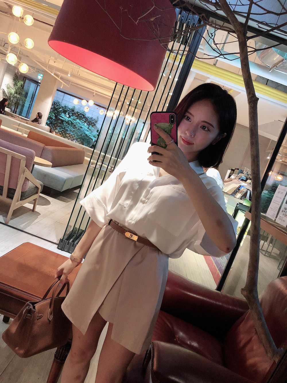 허리에 벨트를 착용하여 매우 짧은 기장감으로 착용했습니다