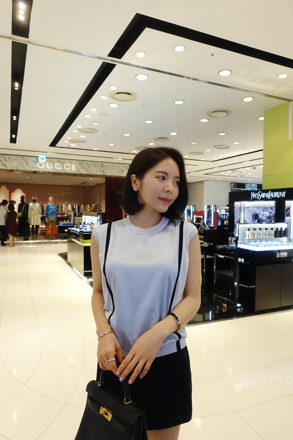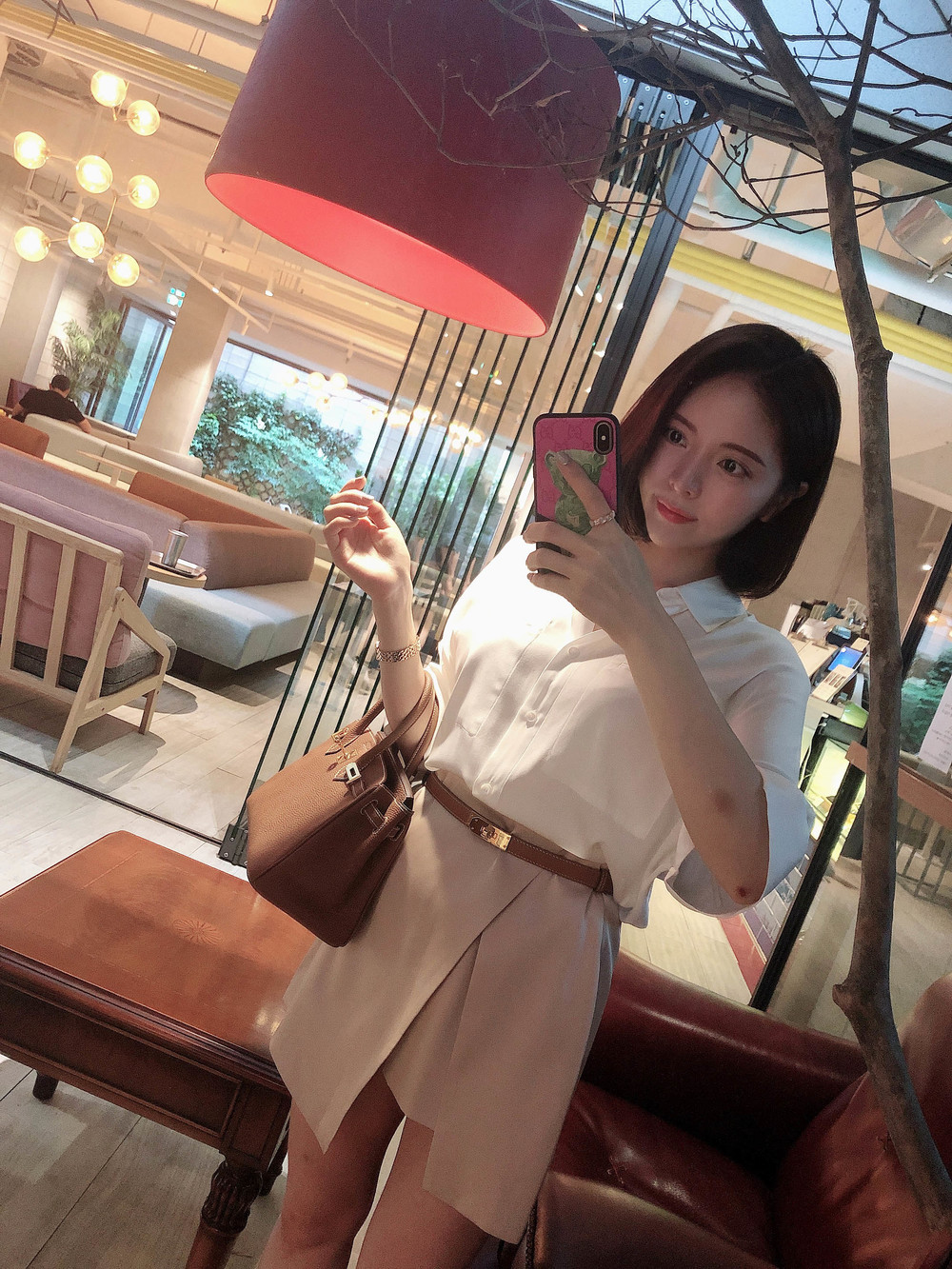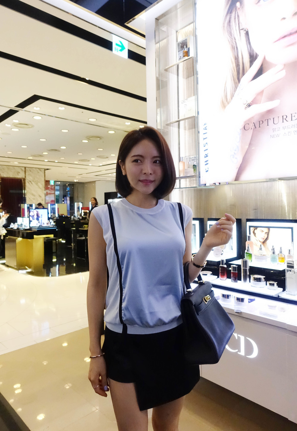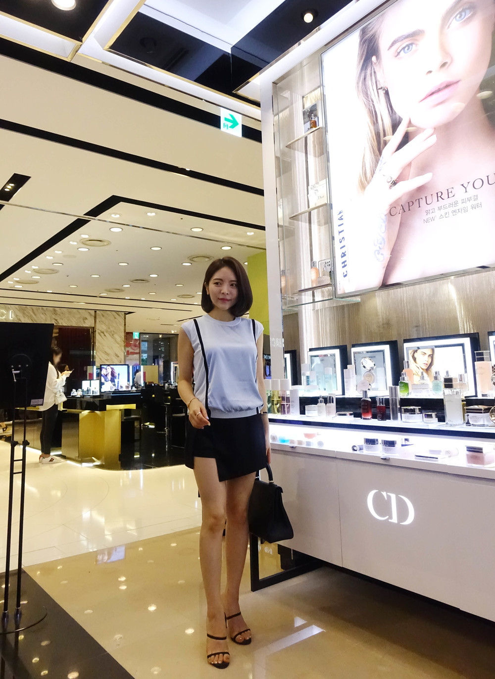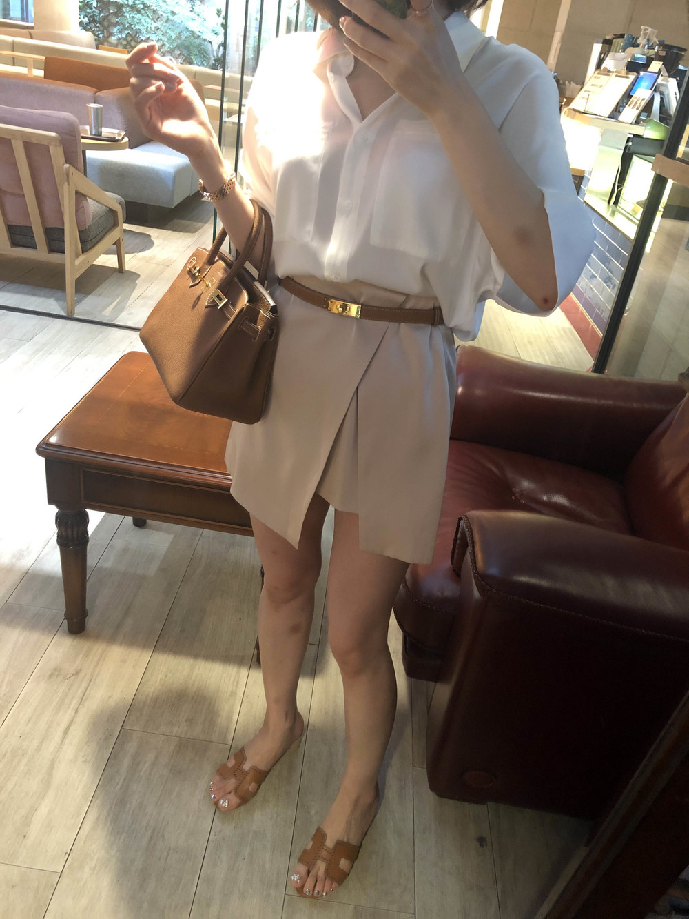 허리에 벨트를 착용하여 매우 짧은 기장감으로 착용했습니다
