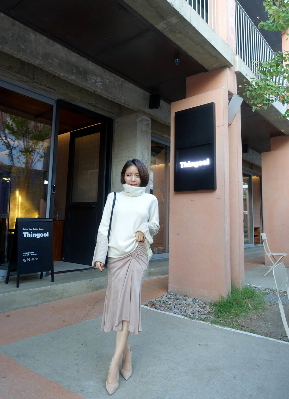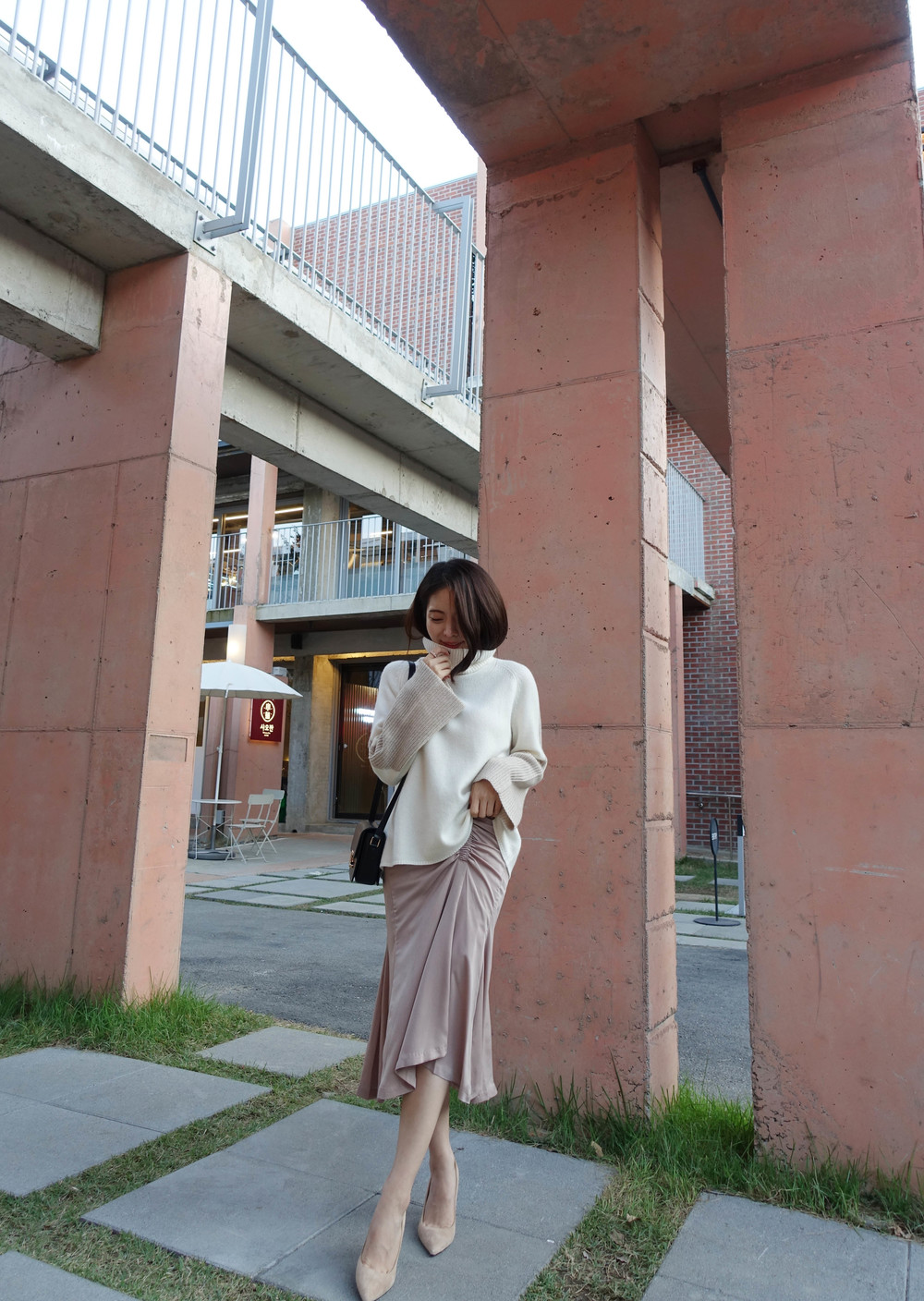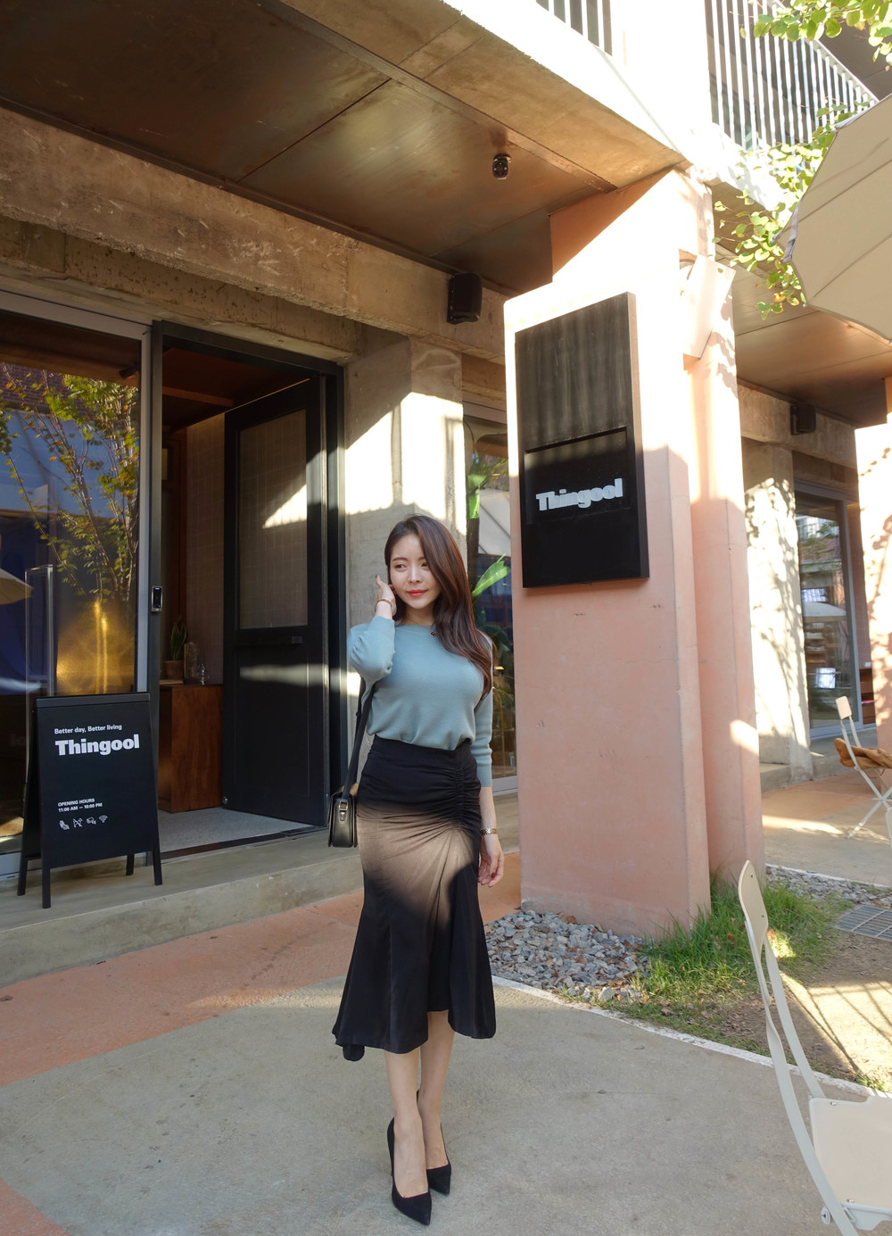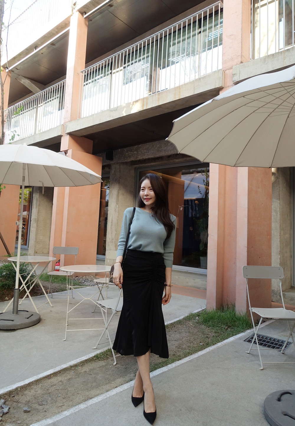 기본니트나 기본티에 코디해도 스커트의 포인트인 셔링으로 여성스러운 코디를 완성할 수 있어요